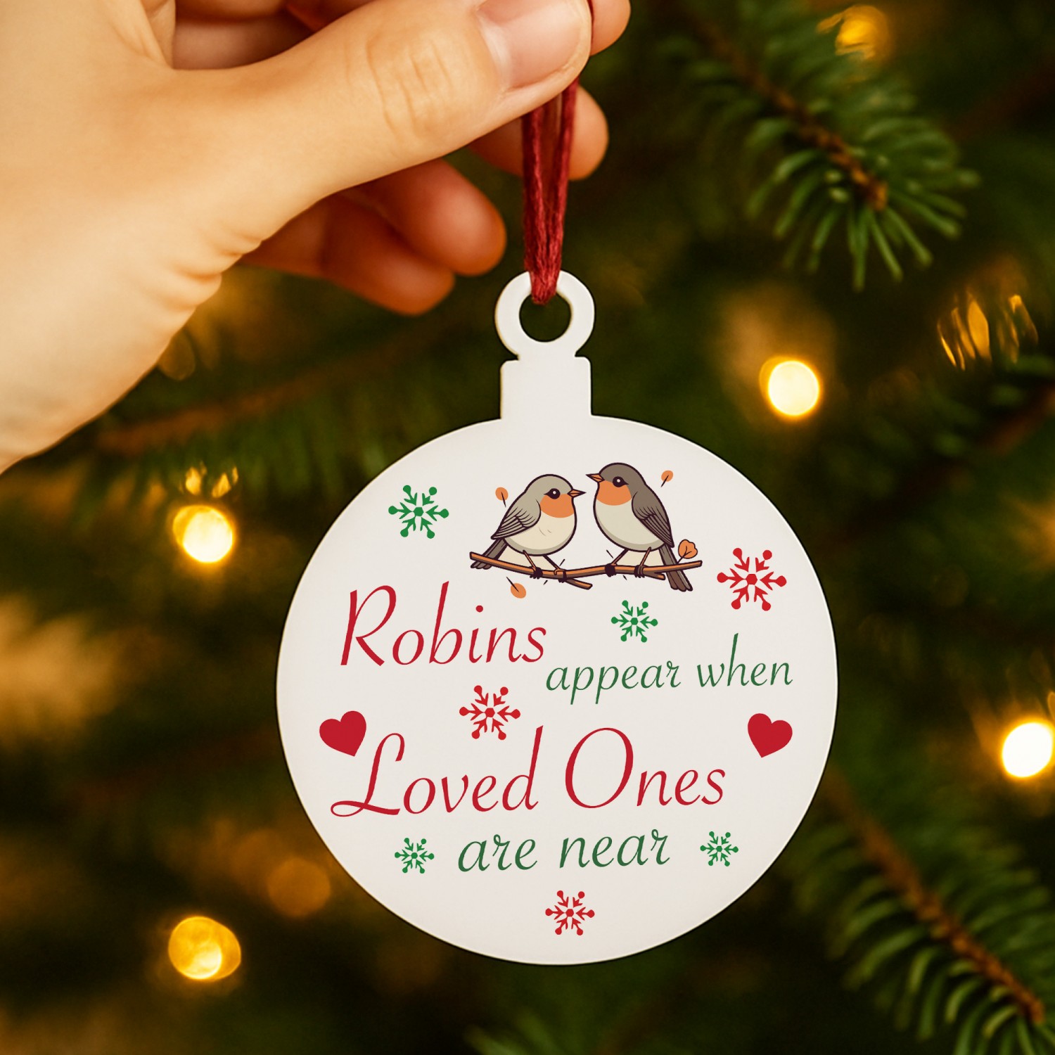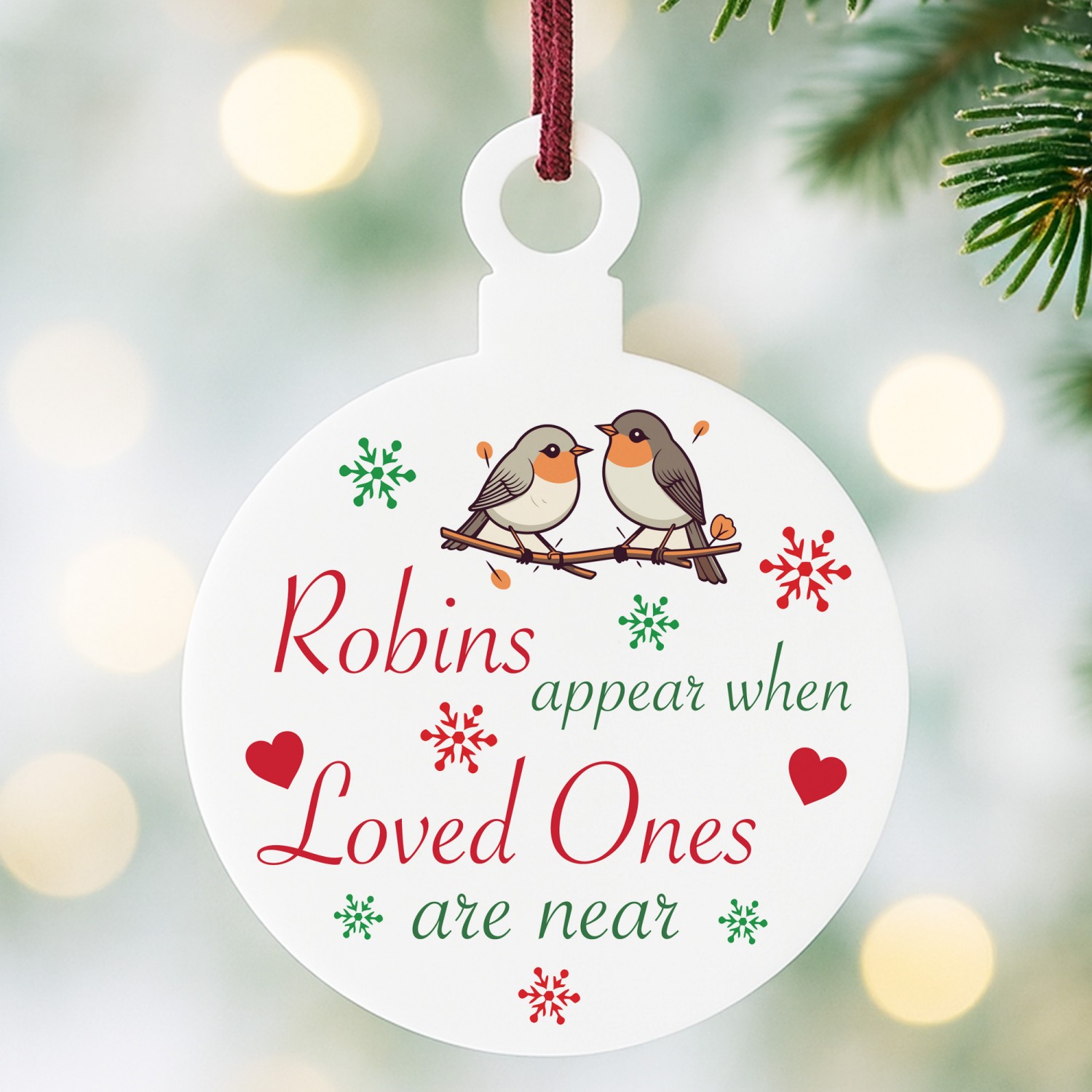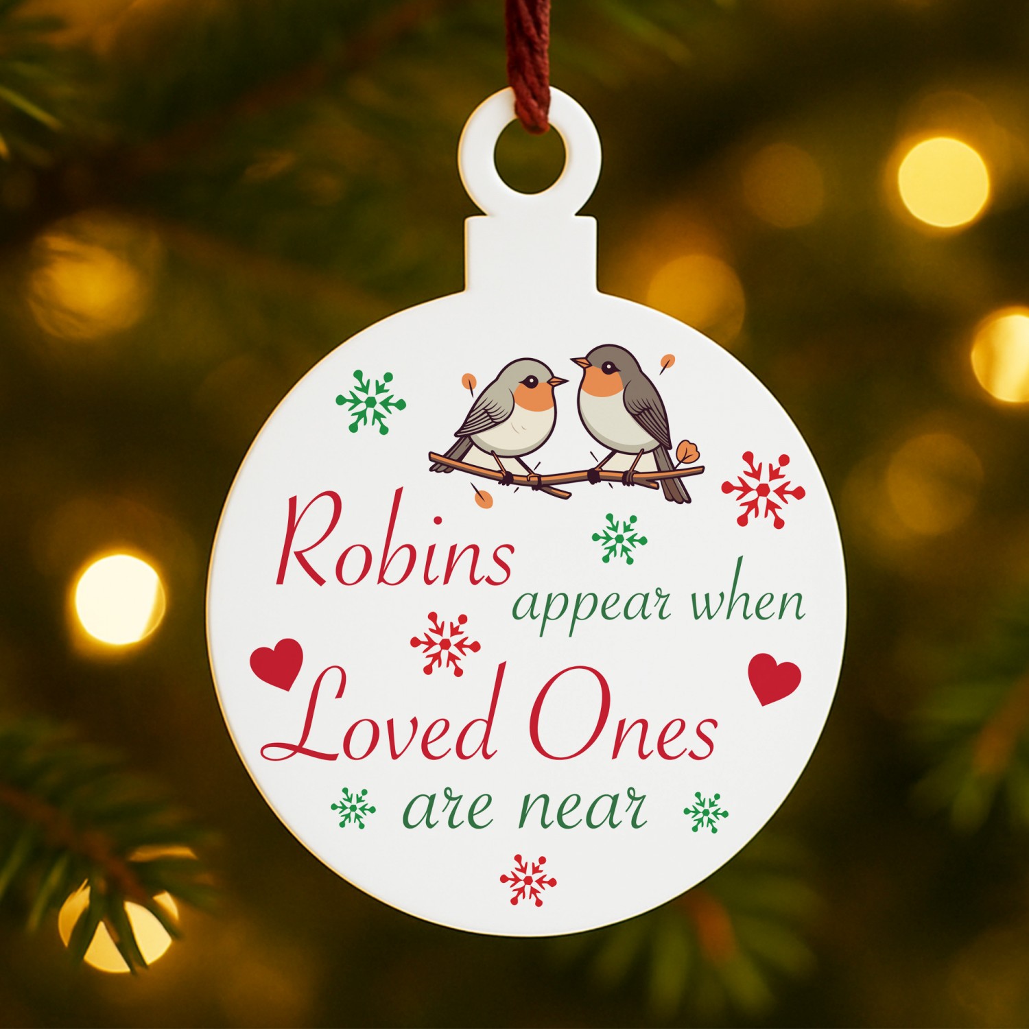The heartfelt design features a delicate robin illustration, surrounded by stars, holly and snowflakes, paired with the touching words 'Robins Appear When Lost Loved Ones Are Near'. A meaningful way to honour the memory of someone special, this ornament offers a gentle reminder that loved ones are always close in spirit. Perfect as a memorial Christmas decoration, a thoughtful sympathy gift, or a treasured keepsake to bring comfort during the festive season, this Bauble captures the love that lives on.