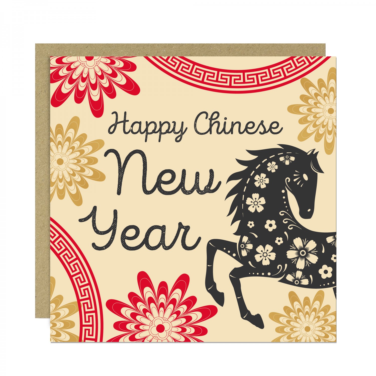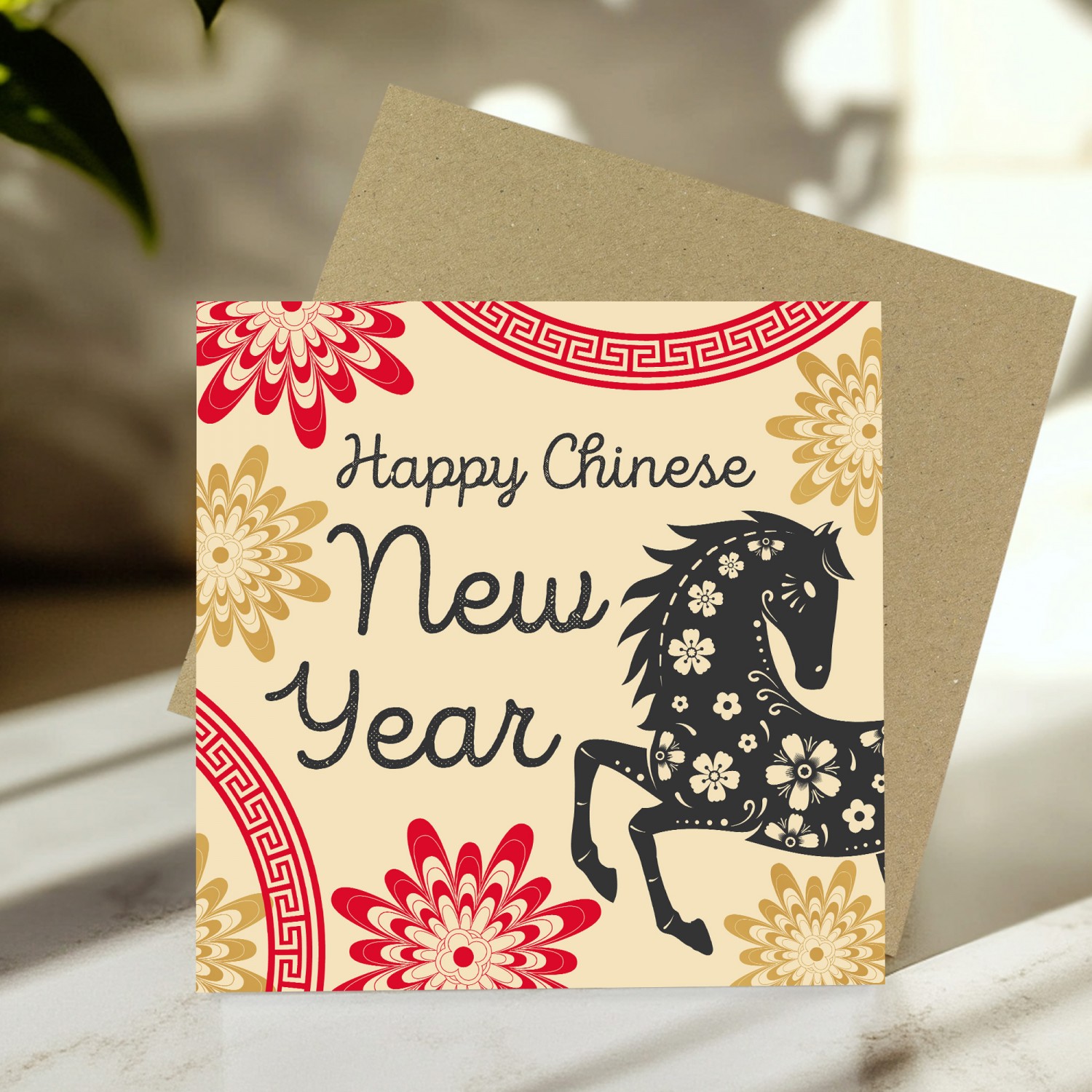 Printed in a 145 x 145mm square format, the card comes complete with a kraft brown envelope, making it suitable for gifting to family, friends, colleagues, clients, or business partners. The inside is blank, allowing you to add your own personalised New Year message.