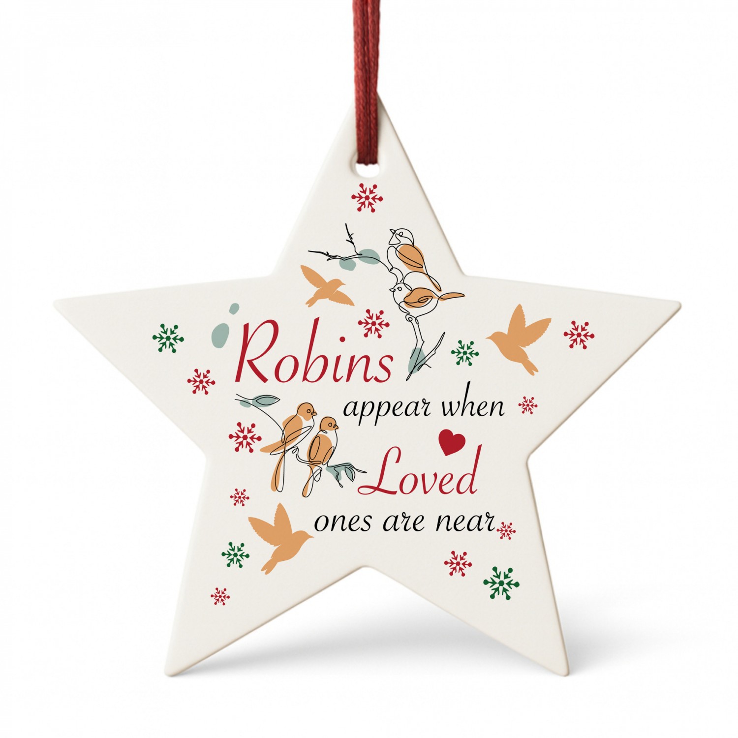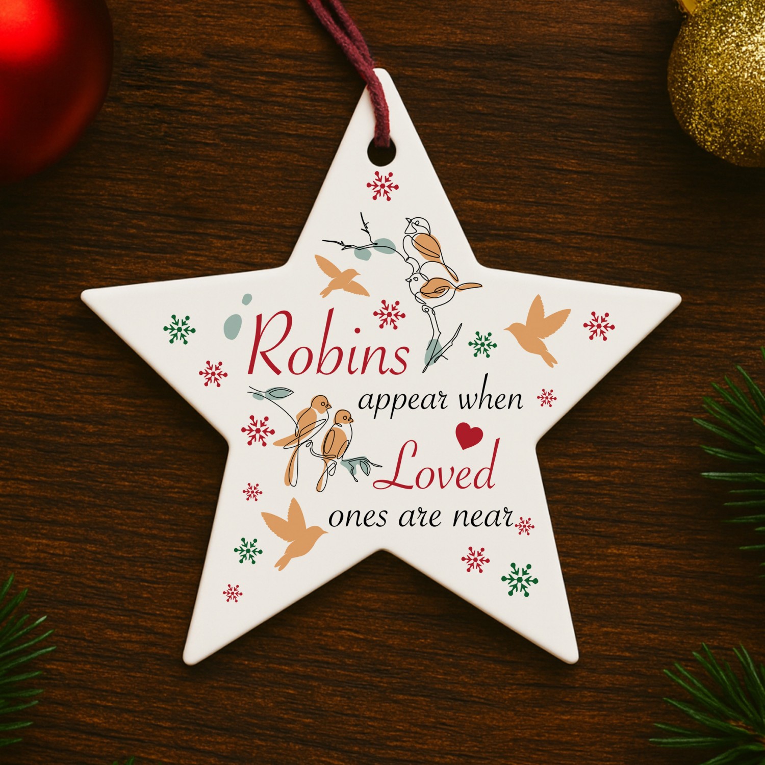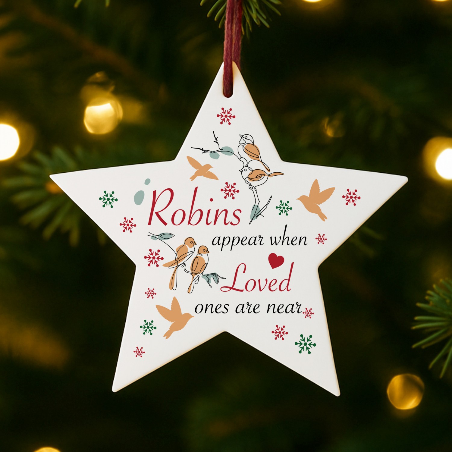 The heartfelt design features a delicate robin illustration, surrounded by stars, holly and snowflakes, paired with the touching words 'Robins Appear When Lost Loved Ones Are Near'. A meaningful way to honour the memory of someone special, this ornament offers a gentle reminder that loved ones are always close in spirit. Perfect as a memorial Christmas decoration, a thoughtful sympathy gift, or a treasured keepsake to bring comfort during the festive season, this star captures the love that lives on.