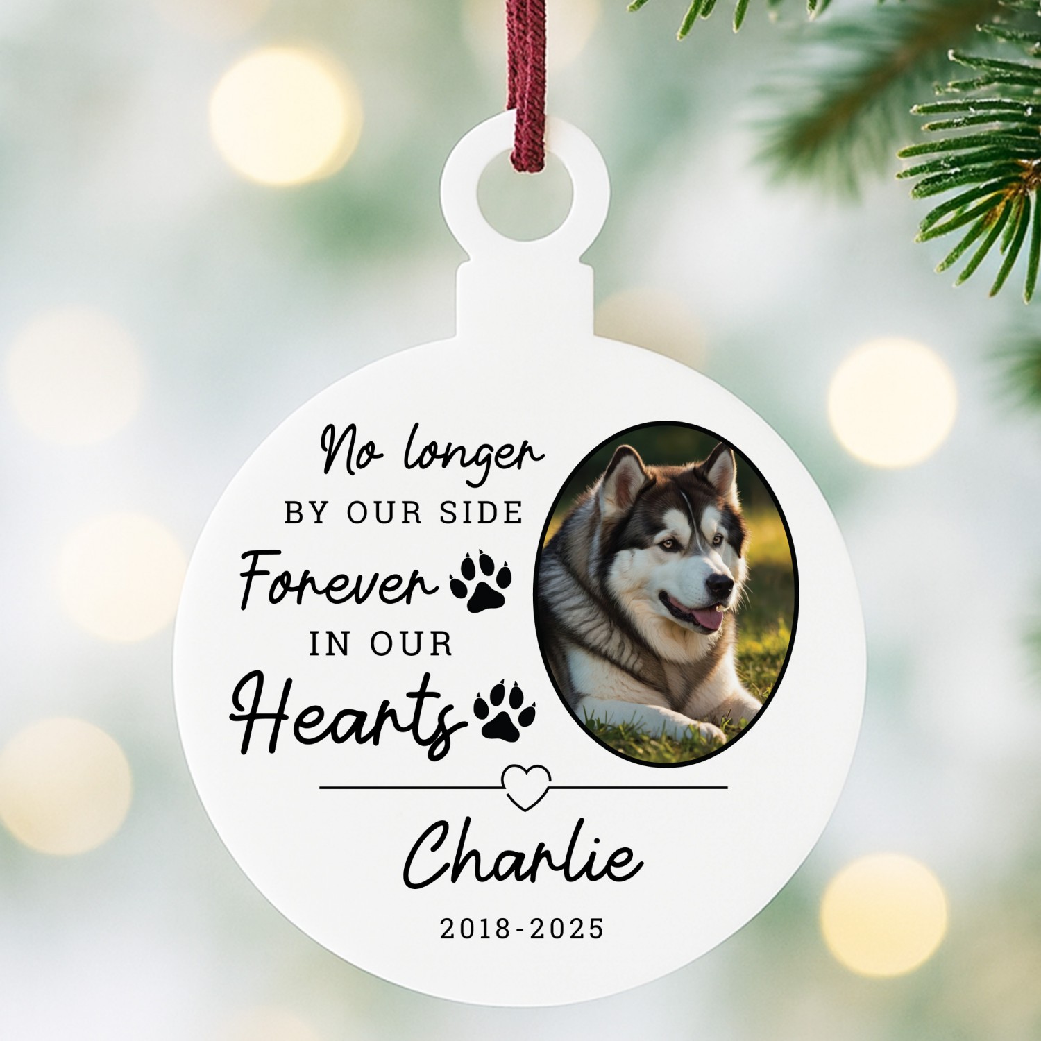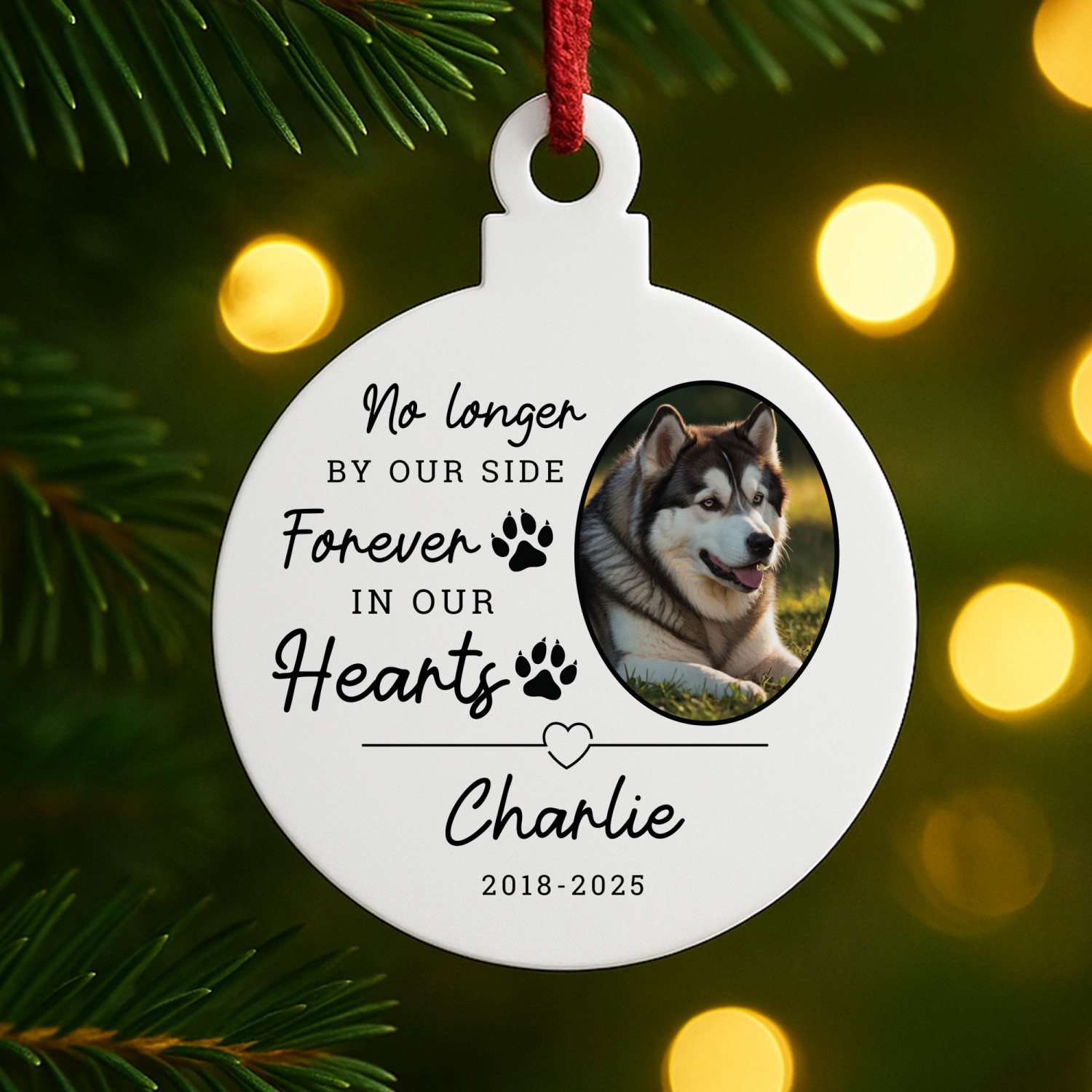 The thoughtful design features sweet paw prints and snowflakes, surrounding your pet's name and the year with a beautiful photo, making it a beautiful way to keep their presence close during the festive season. Perfect for remembering a much-loved companion, this ornament offers comfort and a lasting tribute that can be cherished year after year.