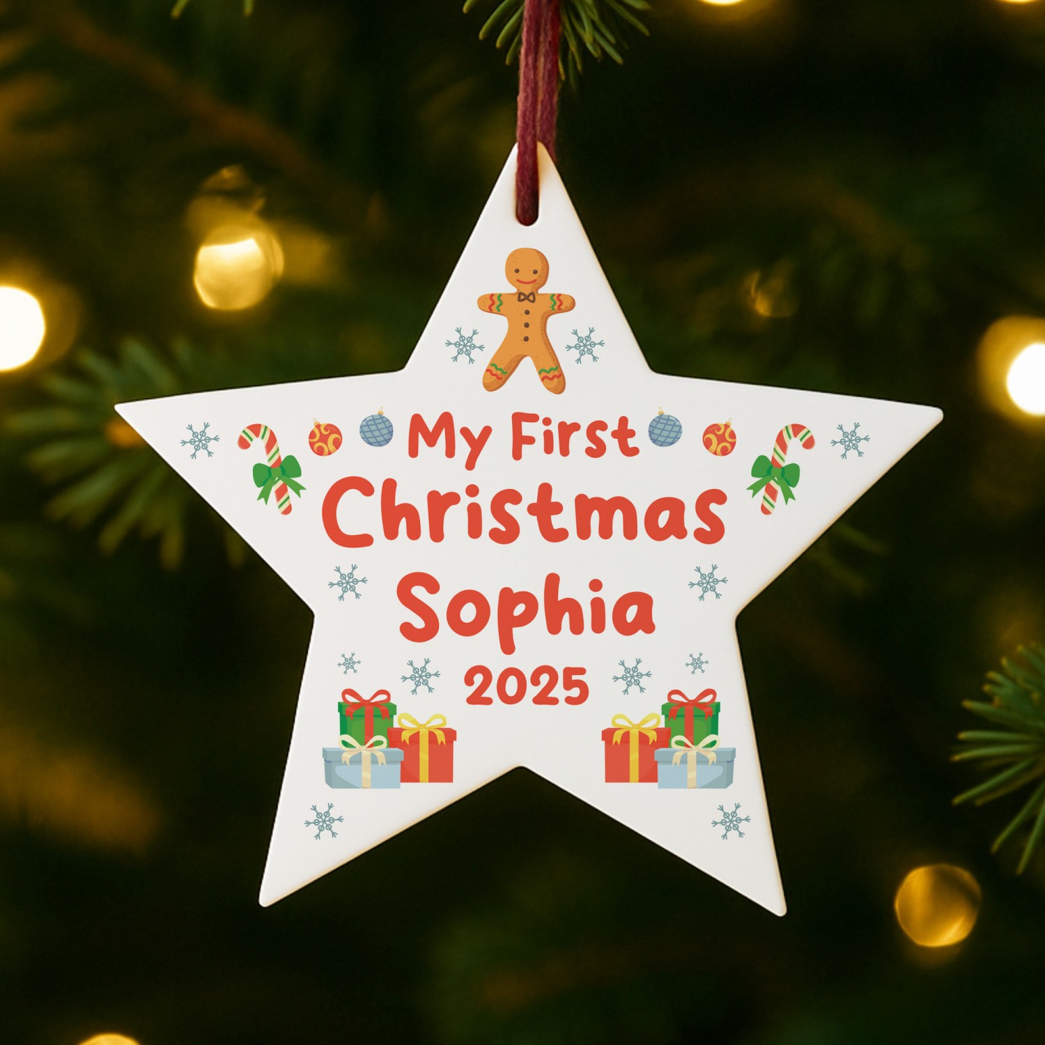 The festive design includes a cheerful Gingerbread man, presents, snowflakes and seasonal illustrations, combined with your chosen name and year to create a truly unique first Christmas decoration. Perfect as a baby's first Christmas bauble, a Christening or newborn gift, or a special keepsake for proud parents, this star captures the joy of the season in a way that can be treasured forever.