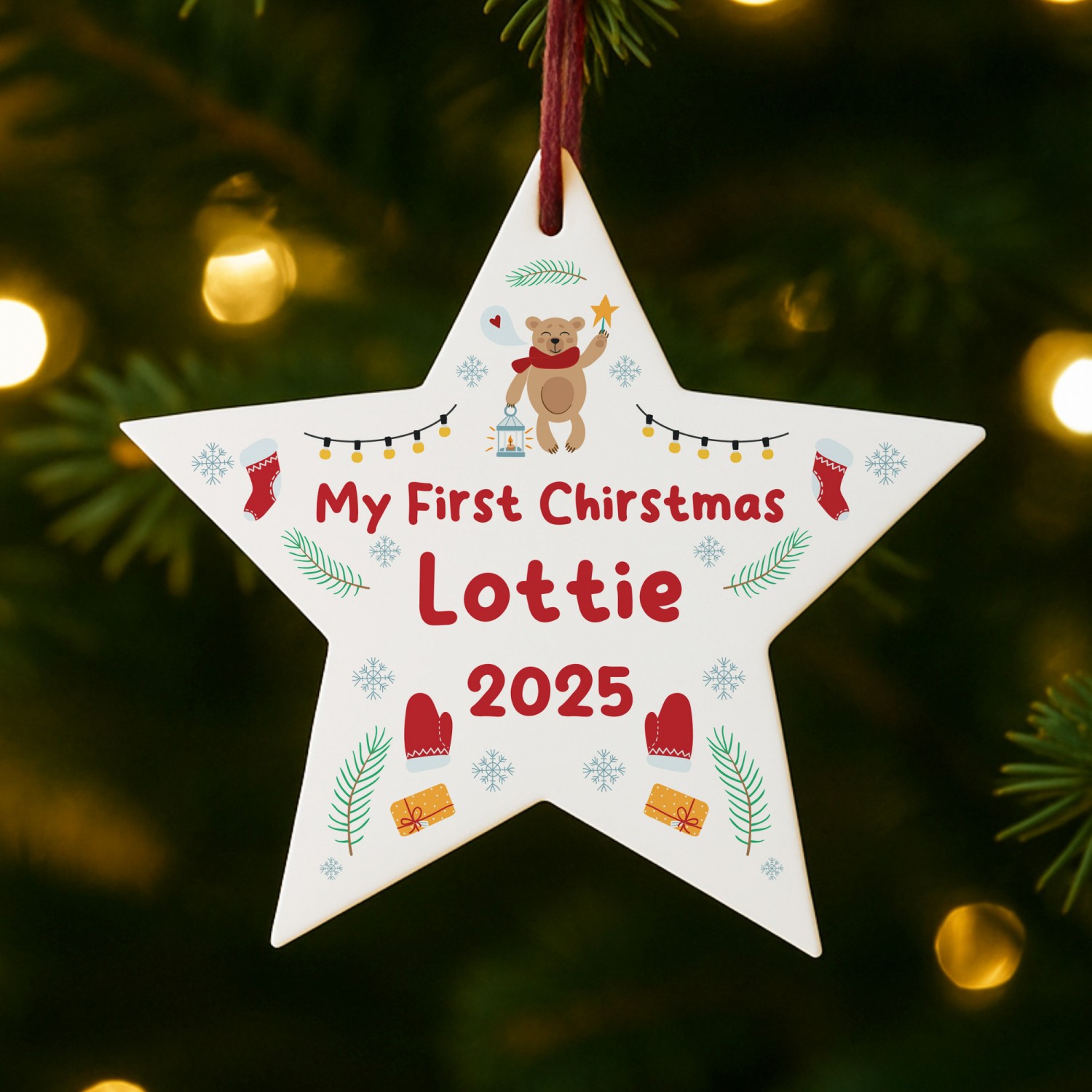 The festive design includes a cheerful Gingerbread man, presents, snowflakes and seasonal illustrations, combined with your chosen name and year to create a truly unique first Christmas decoration. Perfect as a baby's first Christmas bauble, a Christening or newborn gift, or a special keepsake for proud parents, this star captures the joy of the season in a way that can be treasured forever.