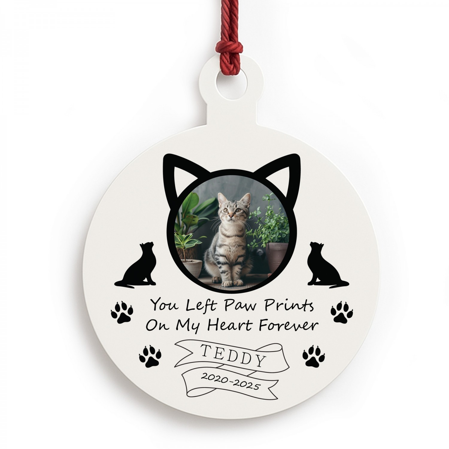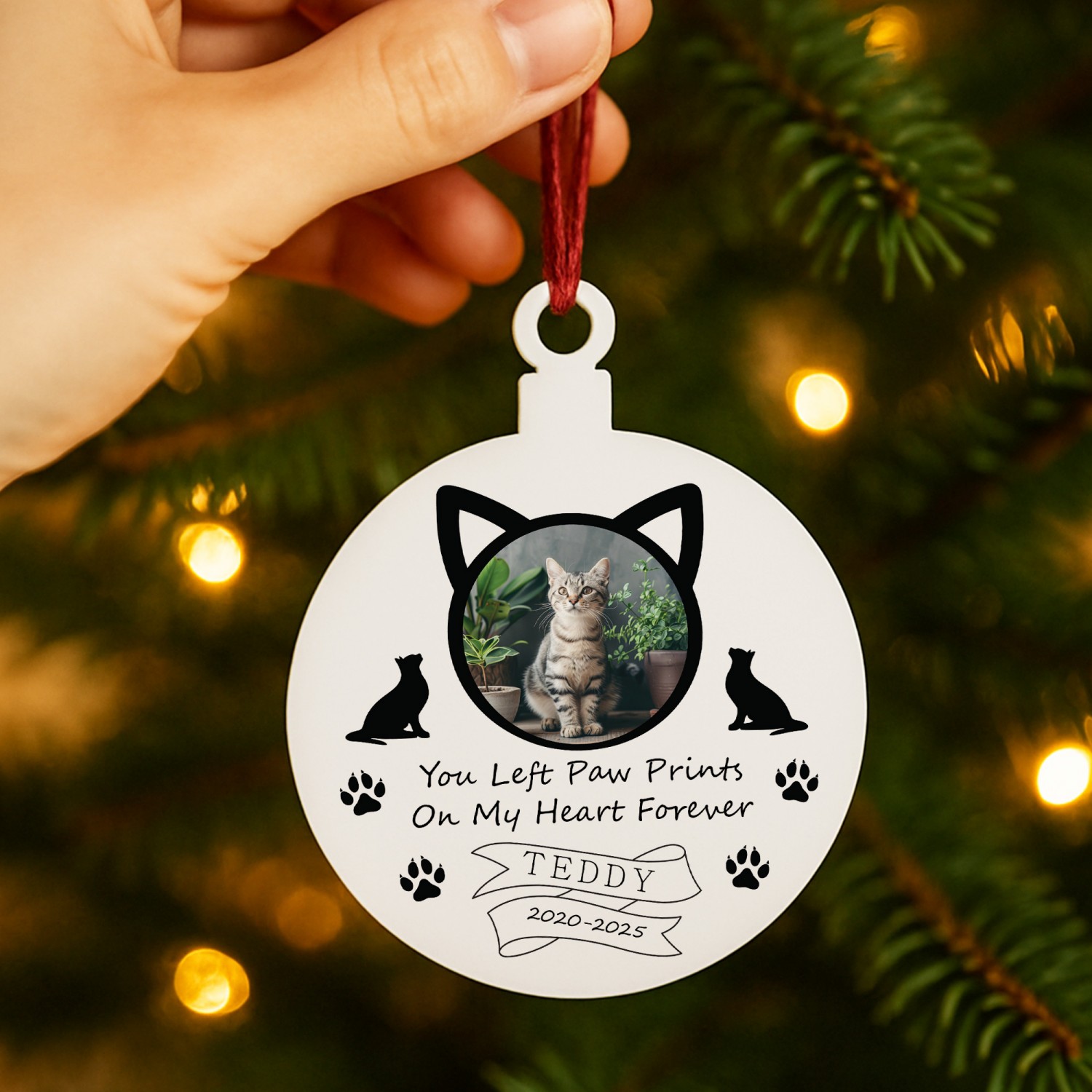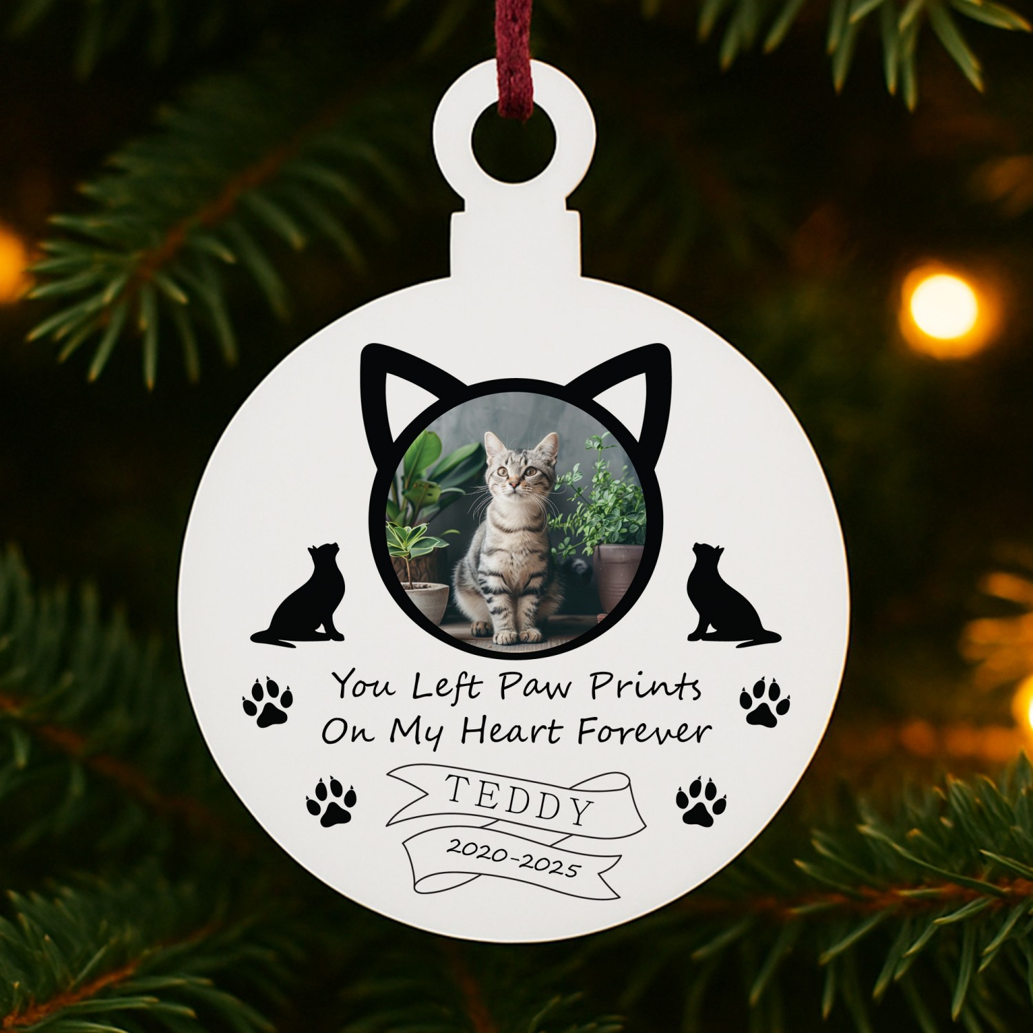 The thoughtful design features sweet paw prints and snowflakes, surrounding your pet's name and the year with a beautiful photo, making it a beautiful way to keep their presence close during the festive season. Perfect for remembering a much-loved companion, this ornament offers comfort and a lasting tribute that can be cherished year after year.