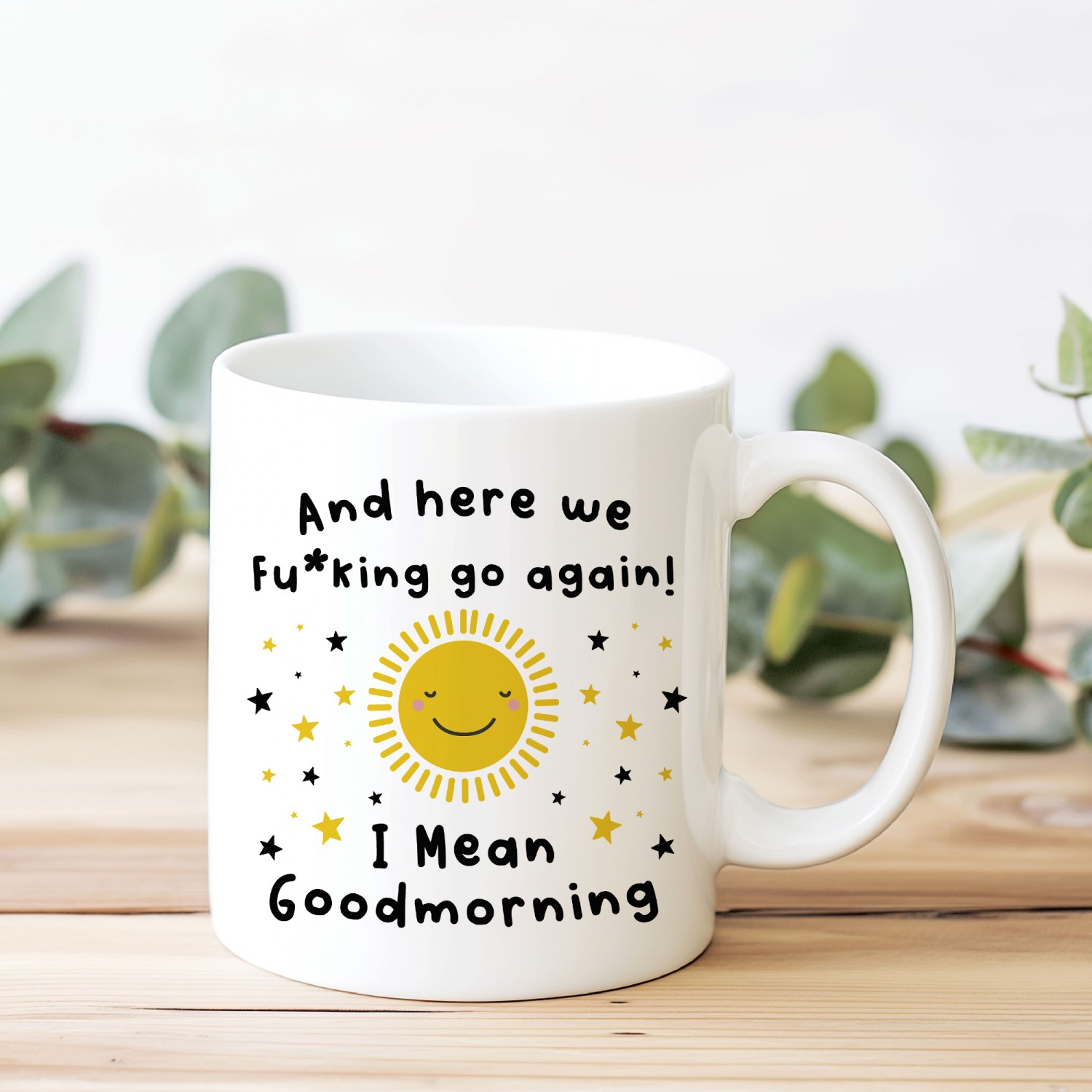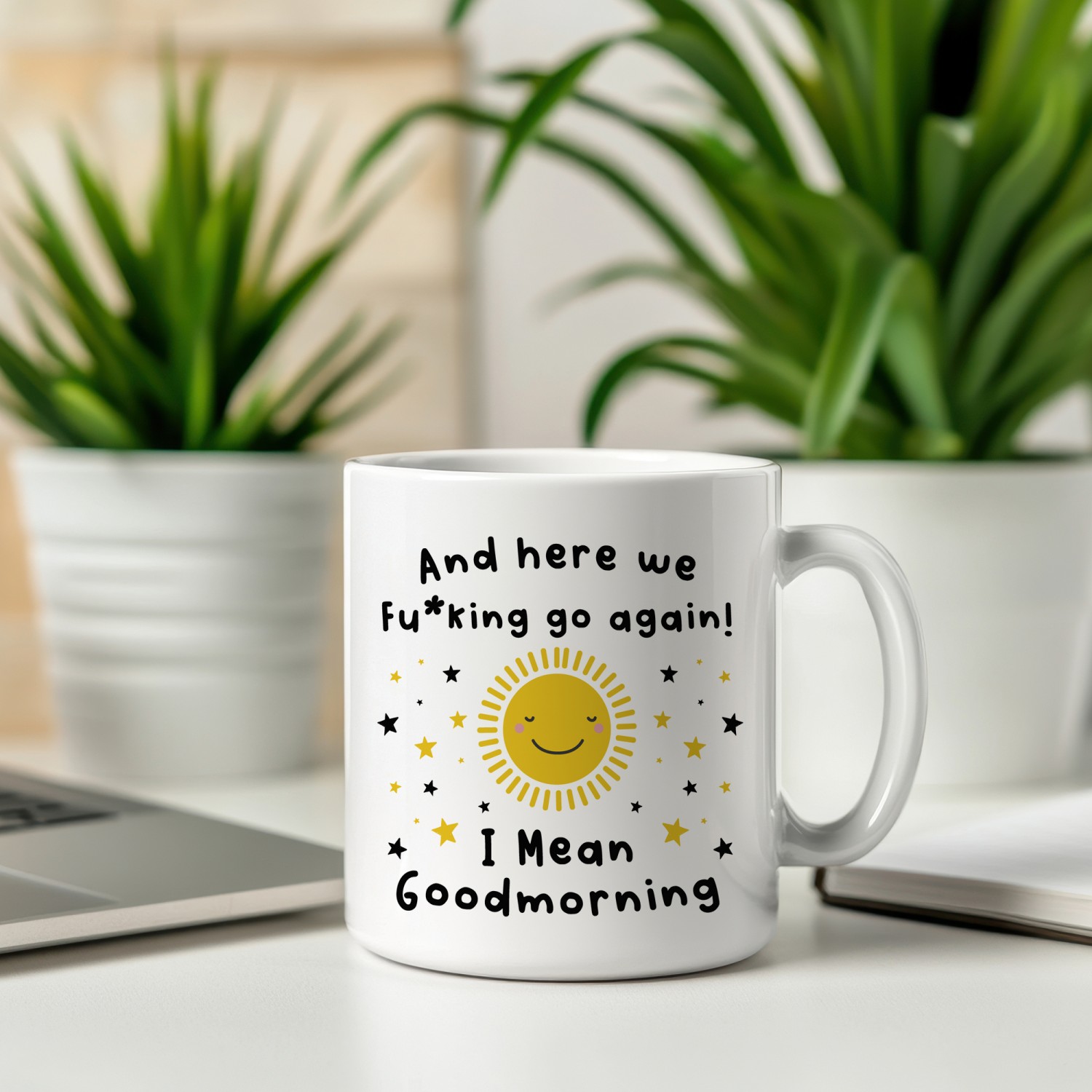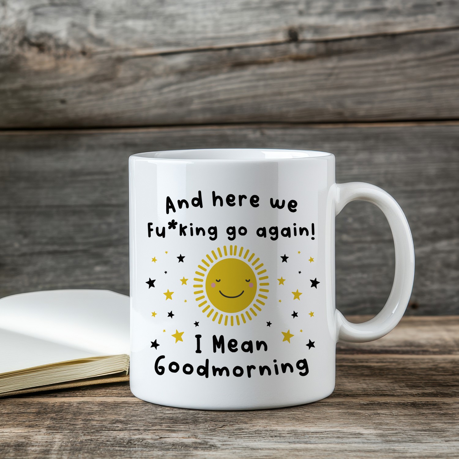 Kick off the day with a mug that speaks louder than the alarm clock. This funny colleague gift mug is perfect for anyone who faces each morning with a mix of honesty sarcasm and caffeine. Featuring a bright smiling sun and the playful phrase "And here we fu*king go again I mean goodmorning" it delivers the ideal blend of humour and attitude for busy workdays.