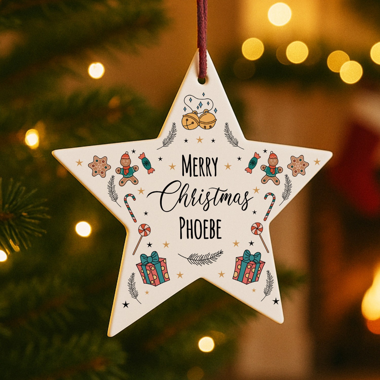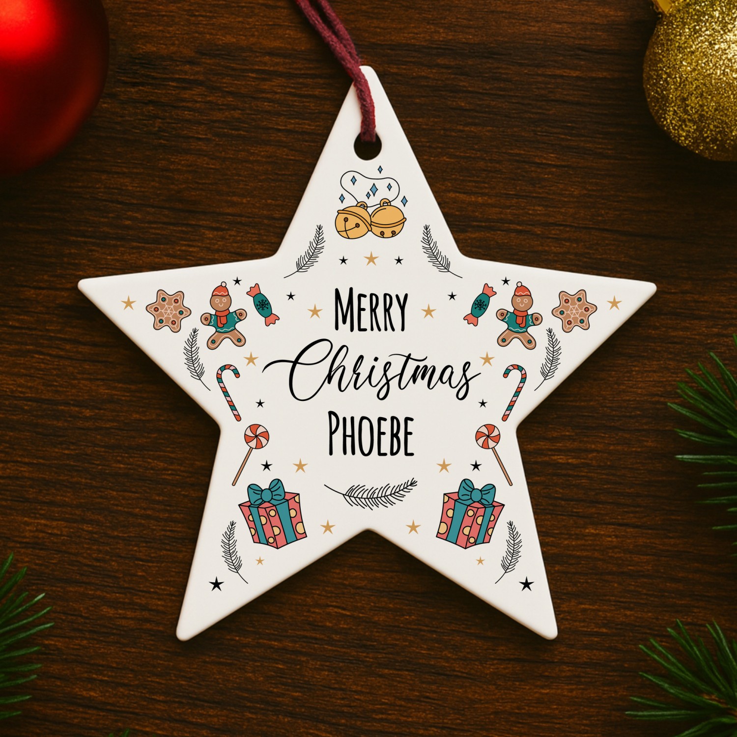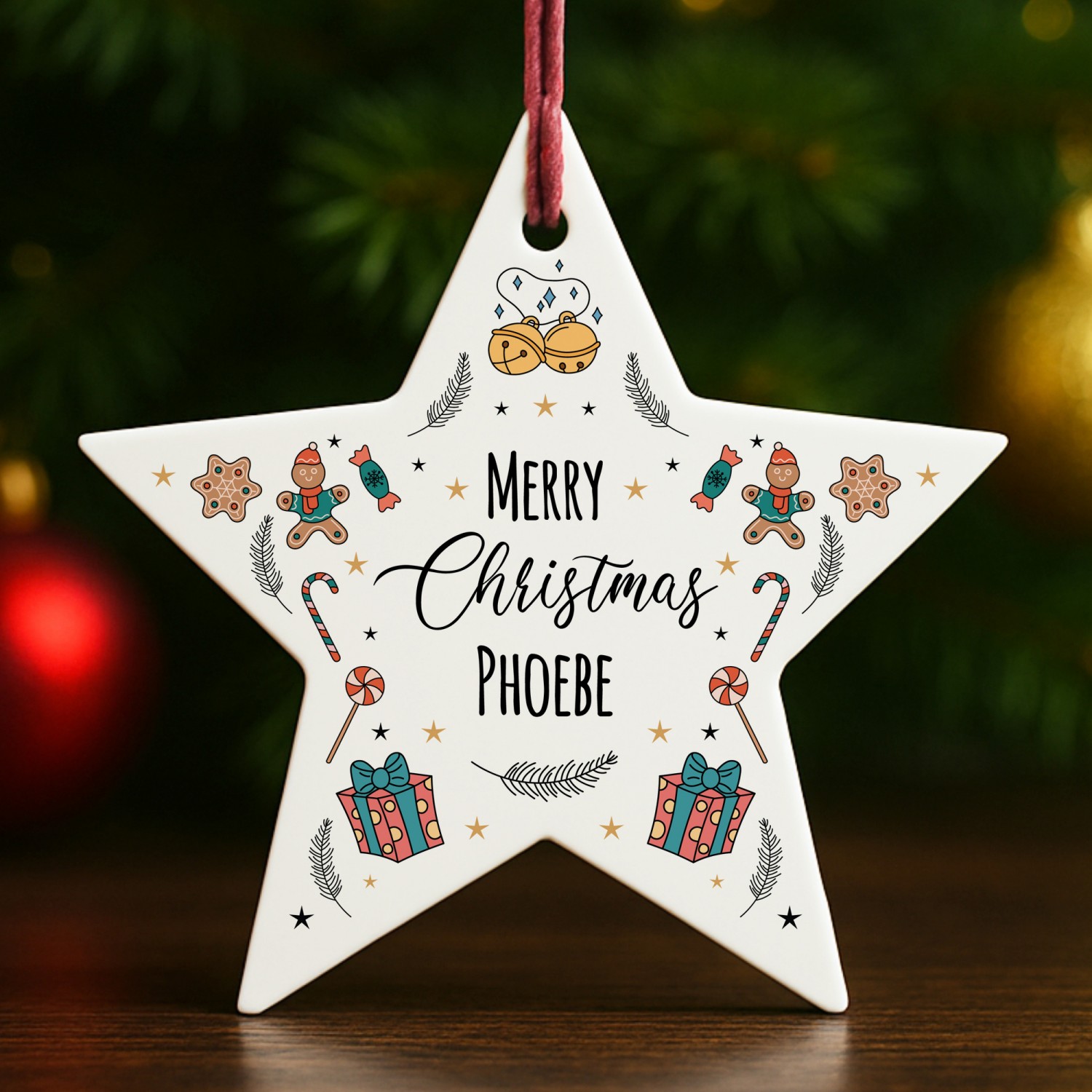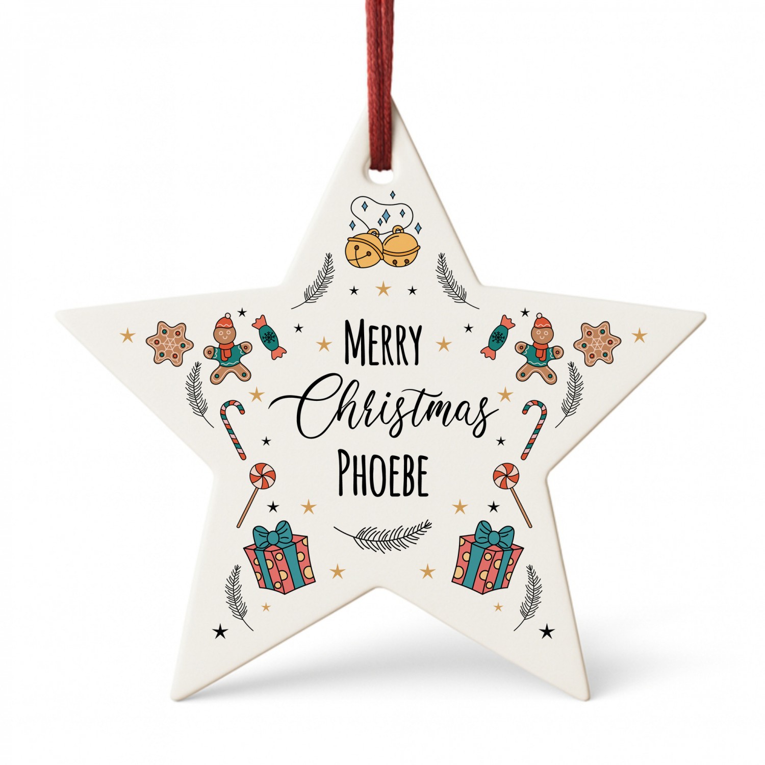 The delightful design features festive illustrations of gingerbread men, candy canes, stars and holly, combined with your chosen name to create a unique Christmas decoration. Perfect as a personalised bauble for children and adults alike, or as a thoughtful seasonal gift for family and friends, this star captures the joy of Christmas in a way that can be treasured for years to come.