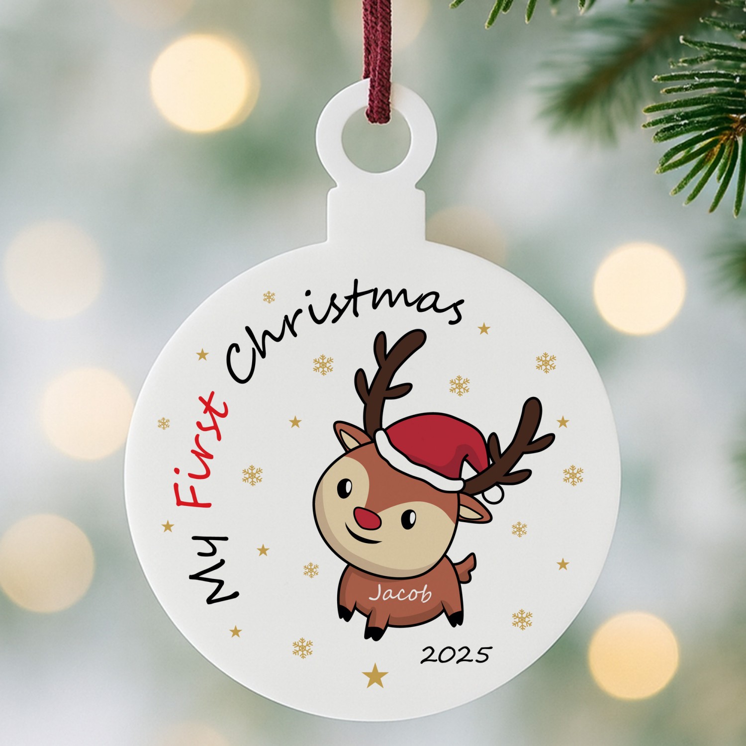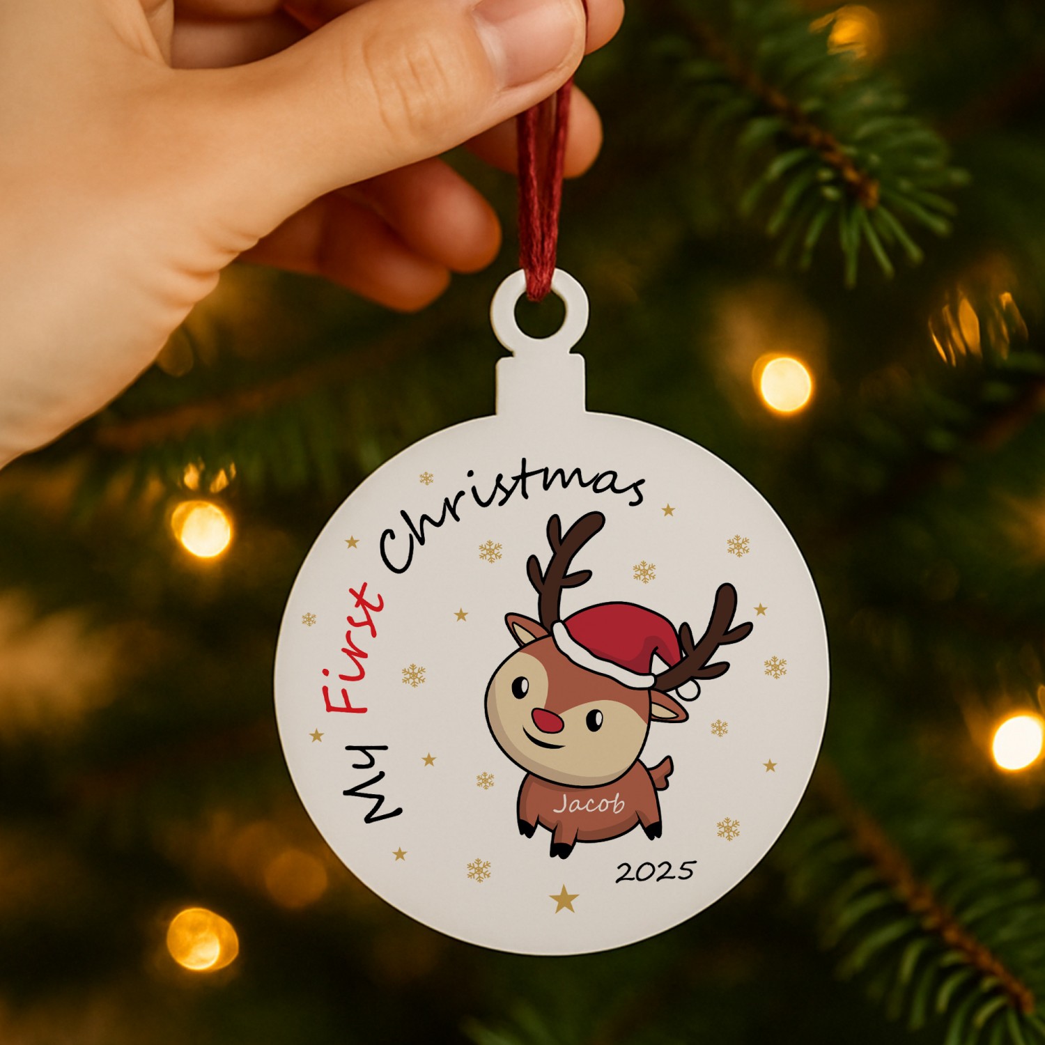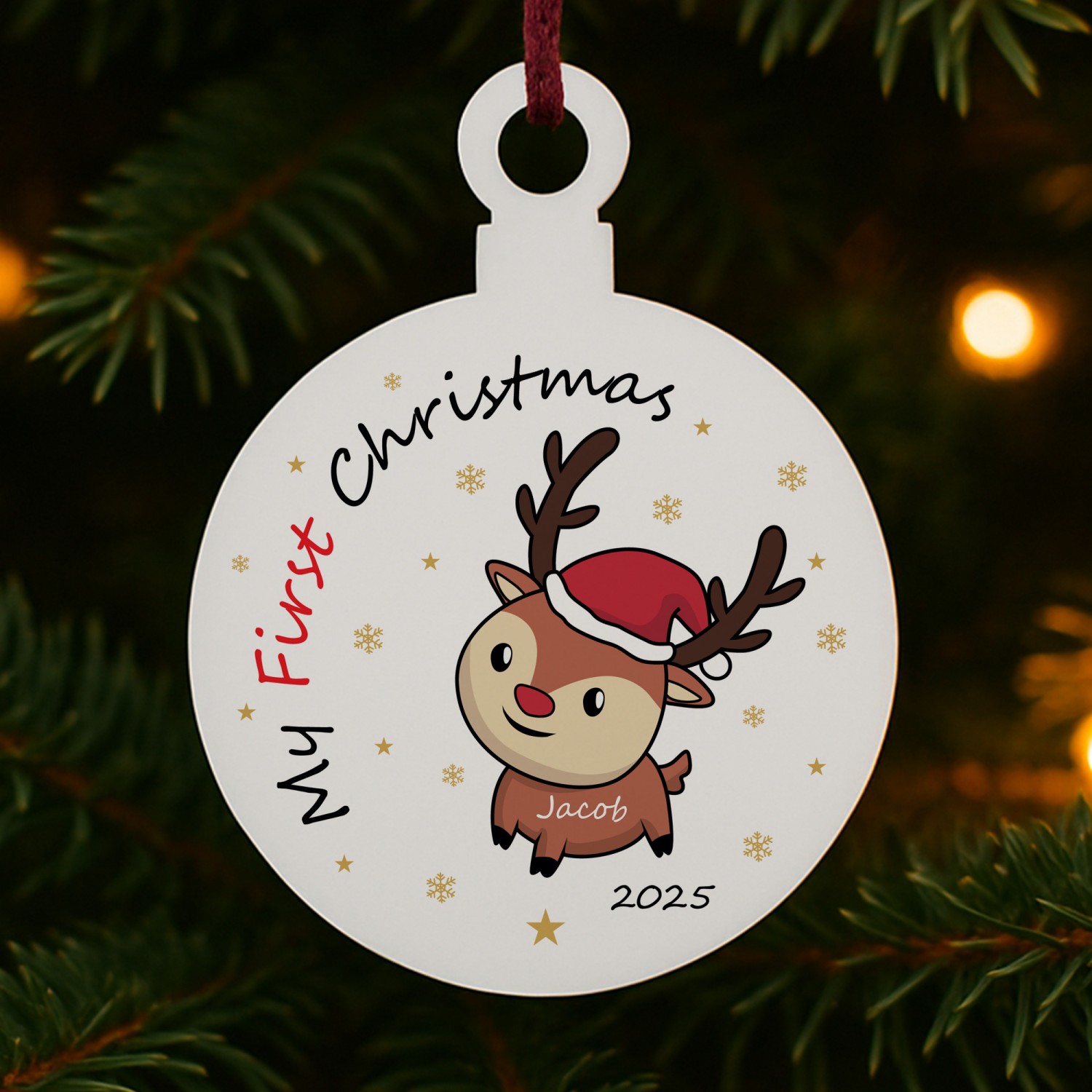 The festive design includes a reindeer and snowflakes, combined with your chosen name and year to create a truly unique first Christmas decoration. Perfect as a baby's first Christmas bauble, a Christening or newborn gift, or a special keepsake for proud parents, this star captures the joy of the season in a way that can be treasured forever.