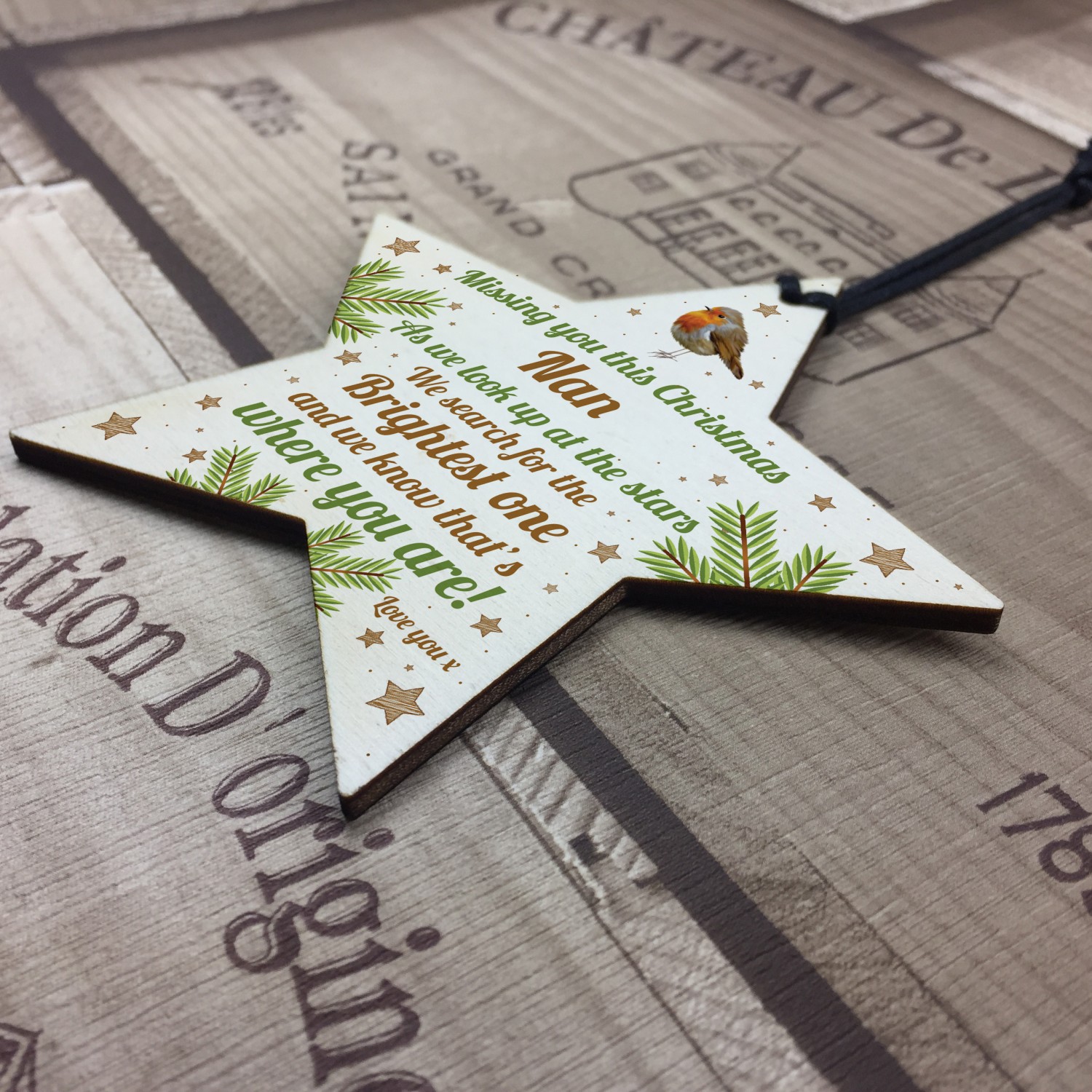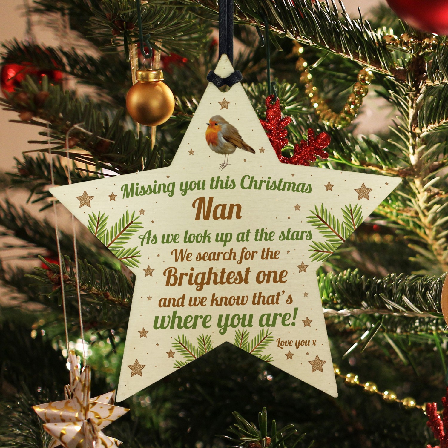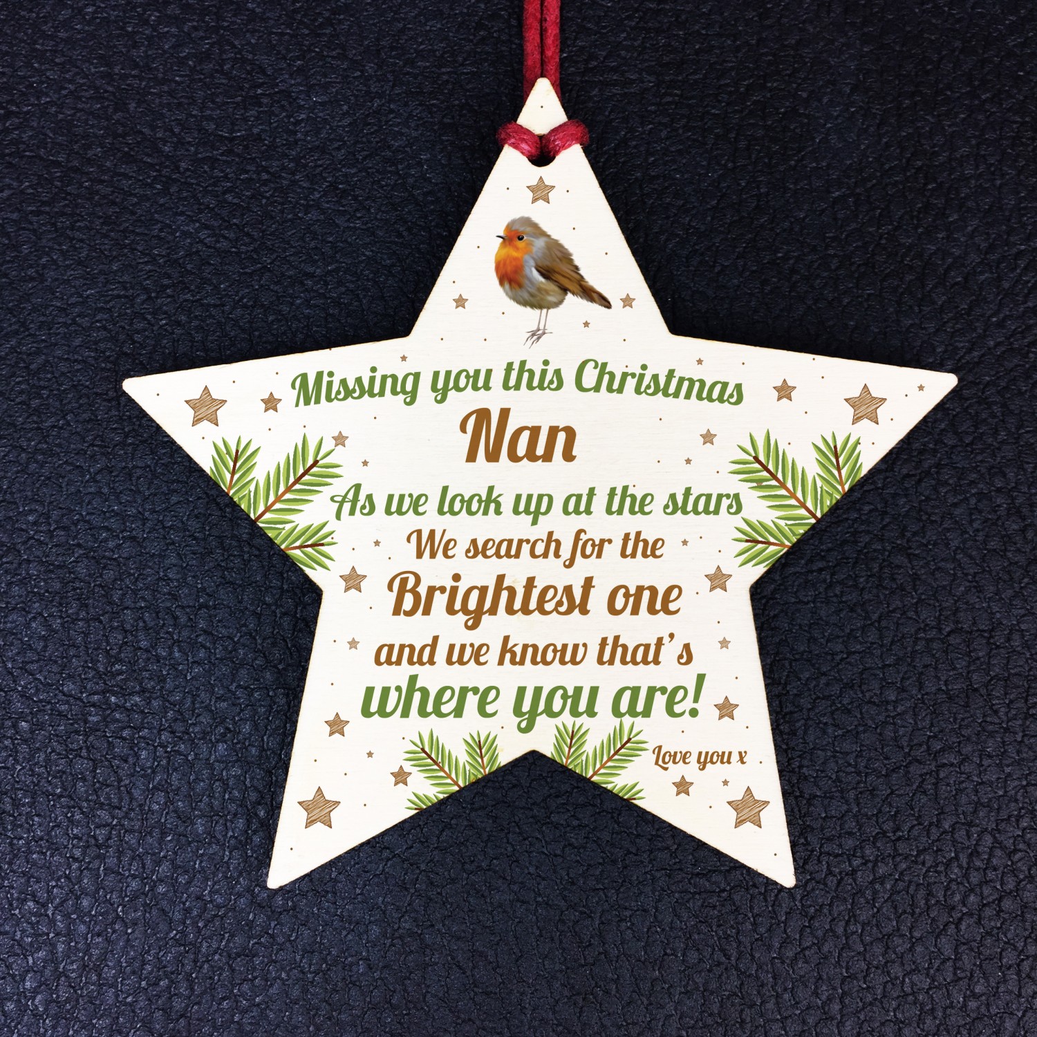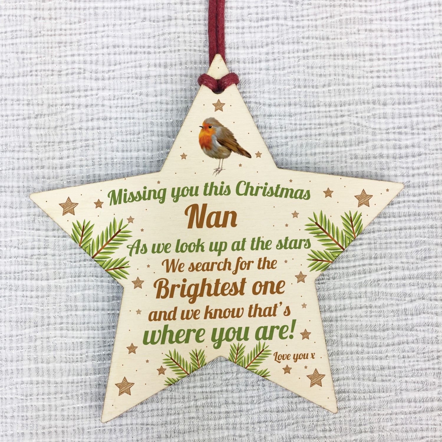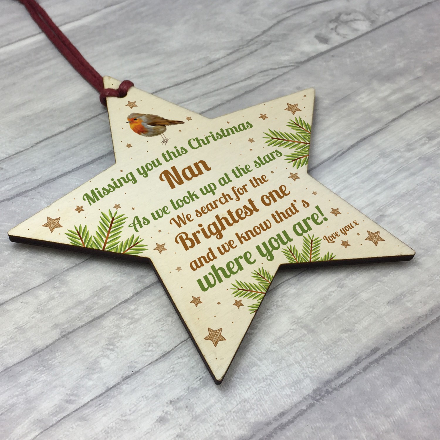 Nan Robin Memorial Chirstmas Tree Bauble Wooden Star Xmas Decor