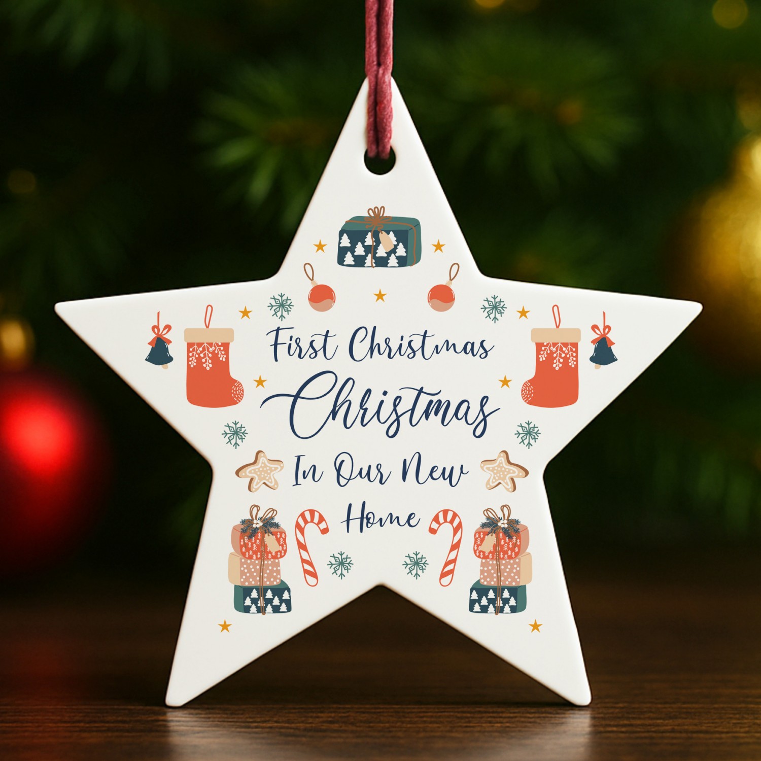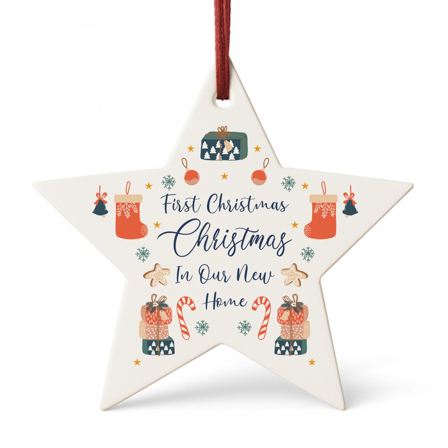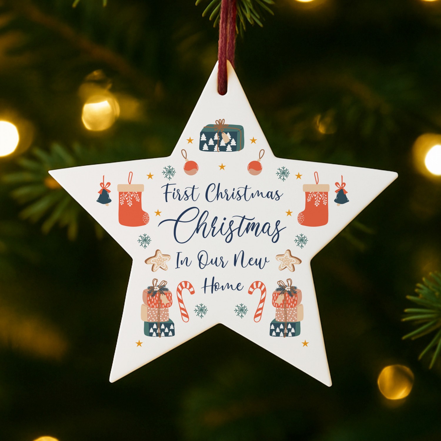 The charming design features seasonal illustrations of houses, candy canes, stars and snowflakes, paired with the words 'Our First Christmas In Our New Home', making it a truly special keepsake to mark this milestone. Perfect as a thoughtful housewarming gift, a Christmas decoration for couples, or a lasting reminder of your first festive season in a new place, this ornament captures the joy of new beginnings.