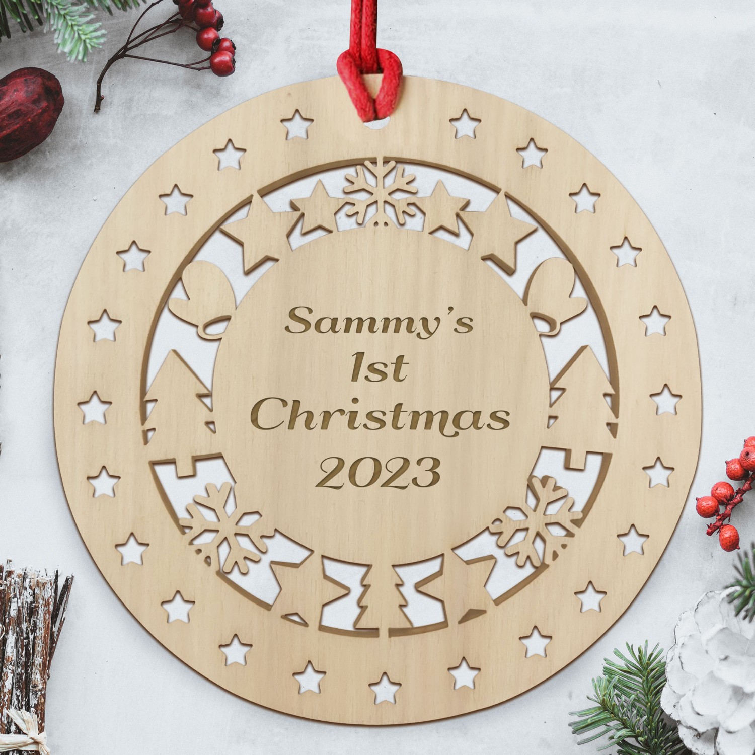 Durability and longevity are key features of this remarkable wooden bauble. The high-quality wood ensures resilience, preserving its impeccable appearance for years to come. The robust construction ensures that this plaque withstands the test of time, becoming a timeless piece of decor that brings beauty and charm to your Christmas Tree.