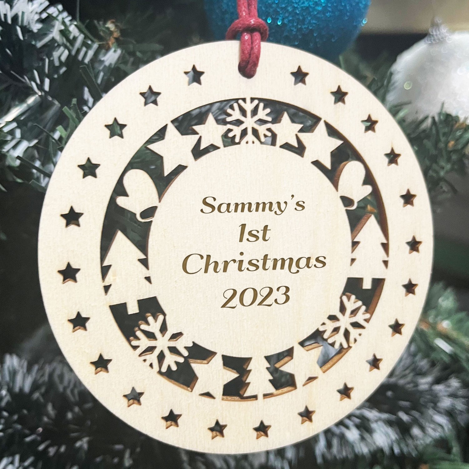 The bauble is made from real wood, and the design is permanently engraved into the wood. The wooden bauble is supplied with waxed cotton rope in both black and red colours to allow easy hanging and looks great hanging on the christmas tree or anywhere in the house this Christmas!