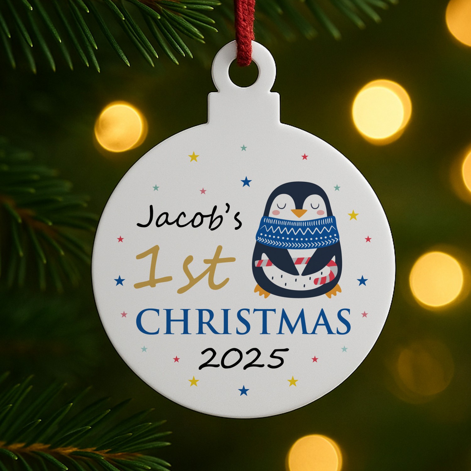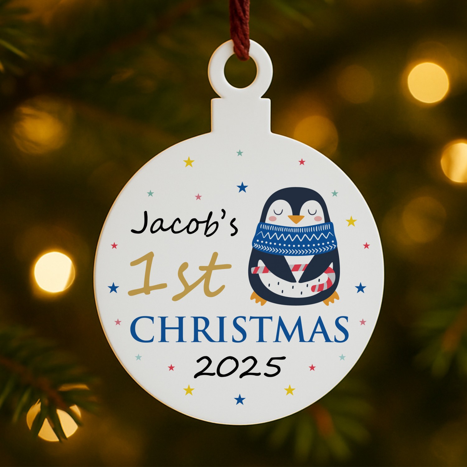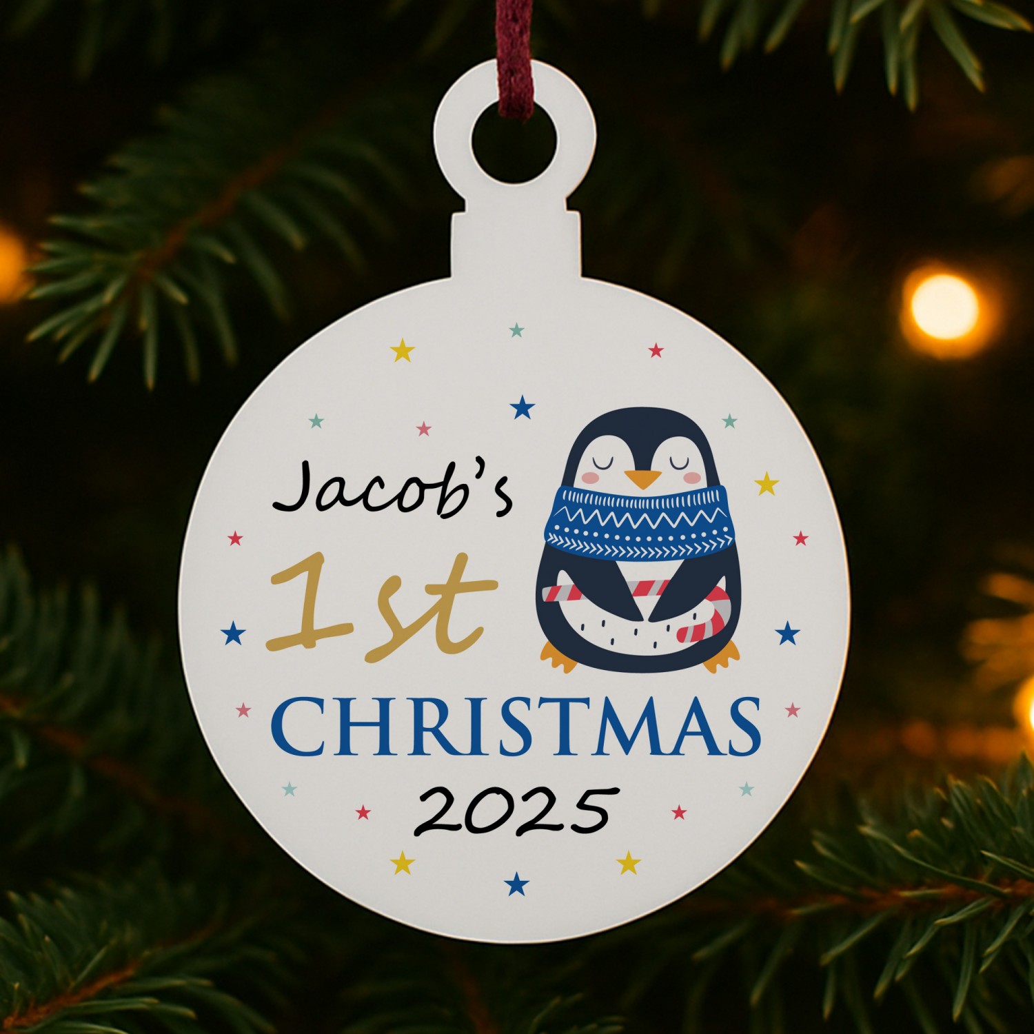 The festive design includes a penguin and snowflakes, combined with your chosen name and year to create a truly unique first Christmas decoration. Perfect as a baby's first Christmas bauble, a Christening or newborn gift, or a special keepsake for proud parents, this star captures the joy of the season in a way that can be treasured forever.