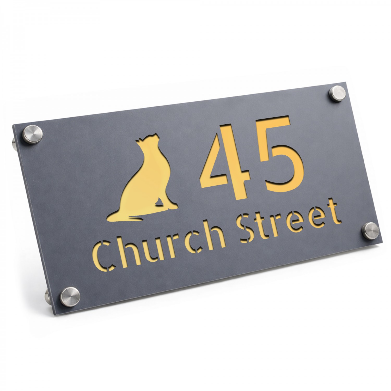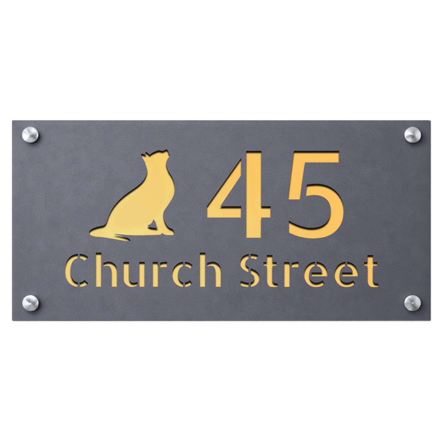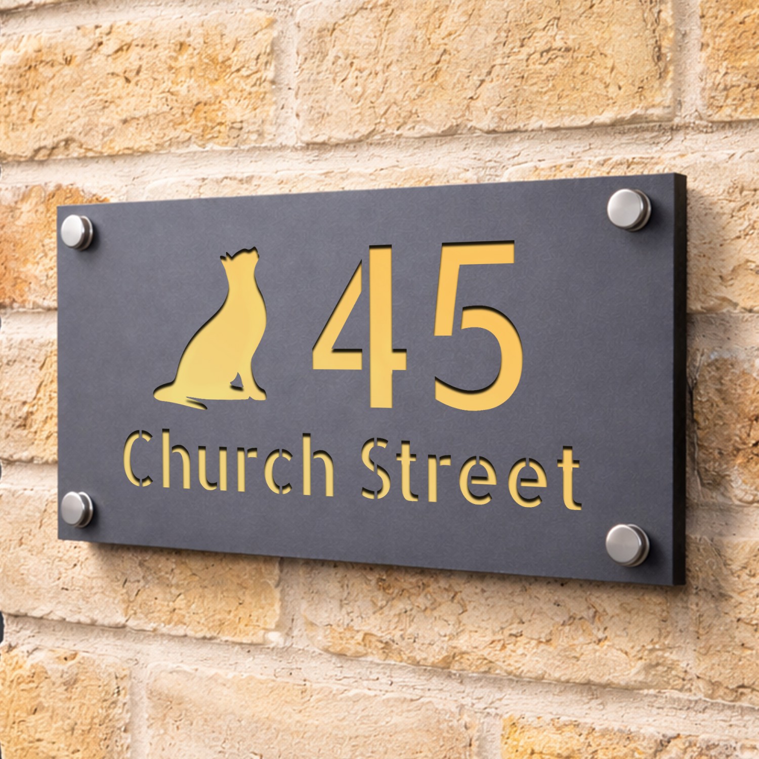 Personalised Address Plaque Cat Design Grey With Gold Number