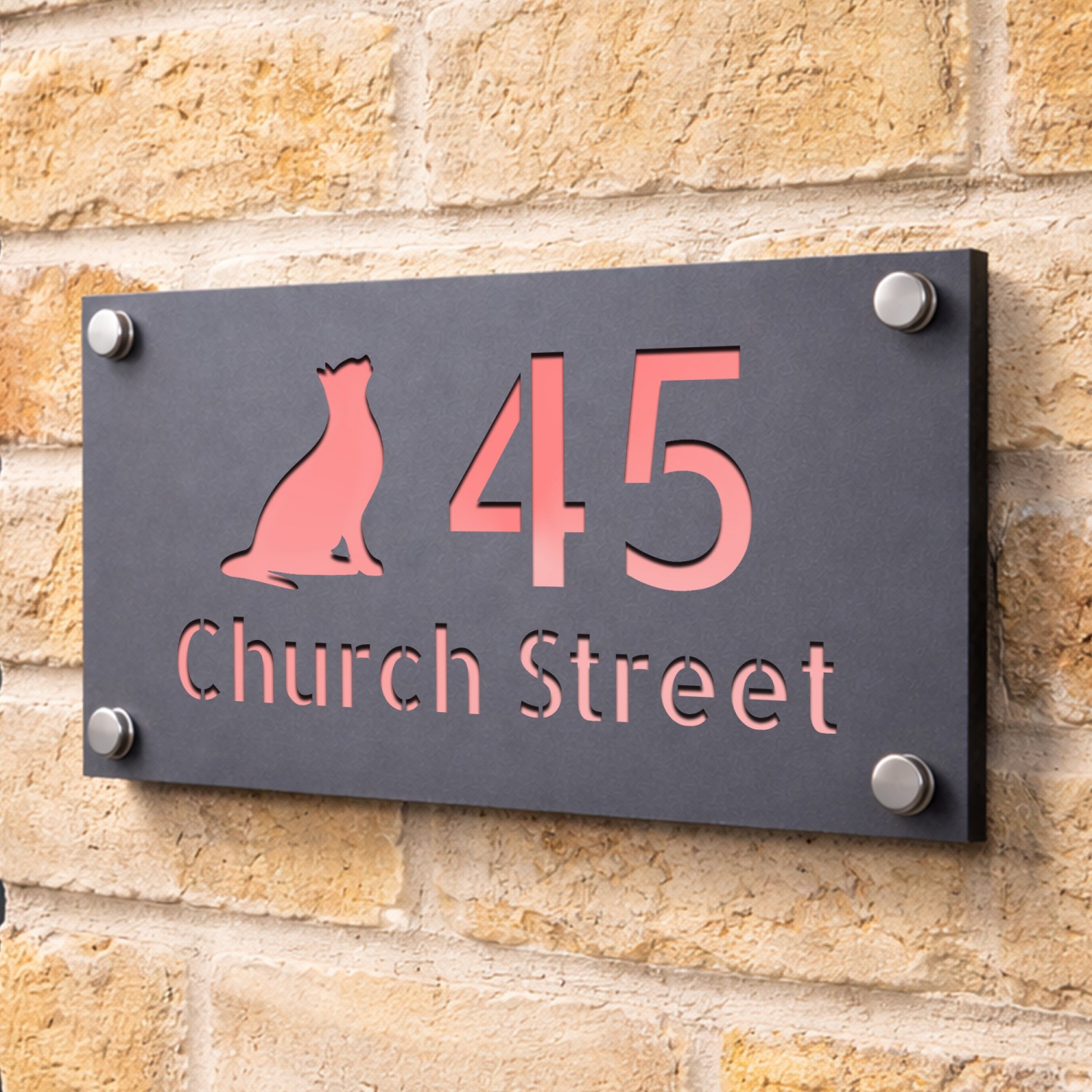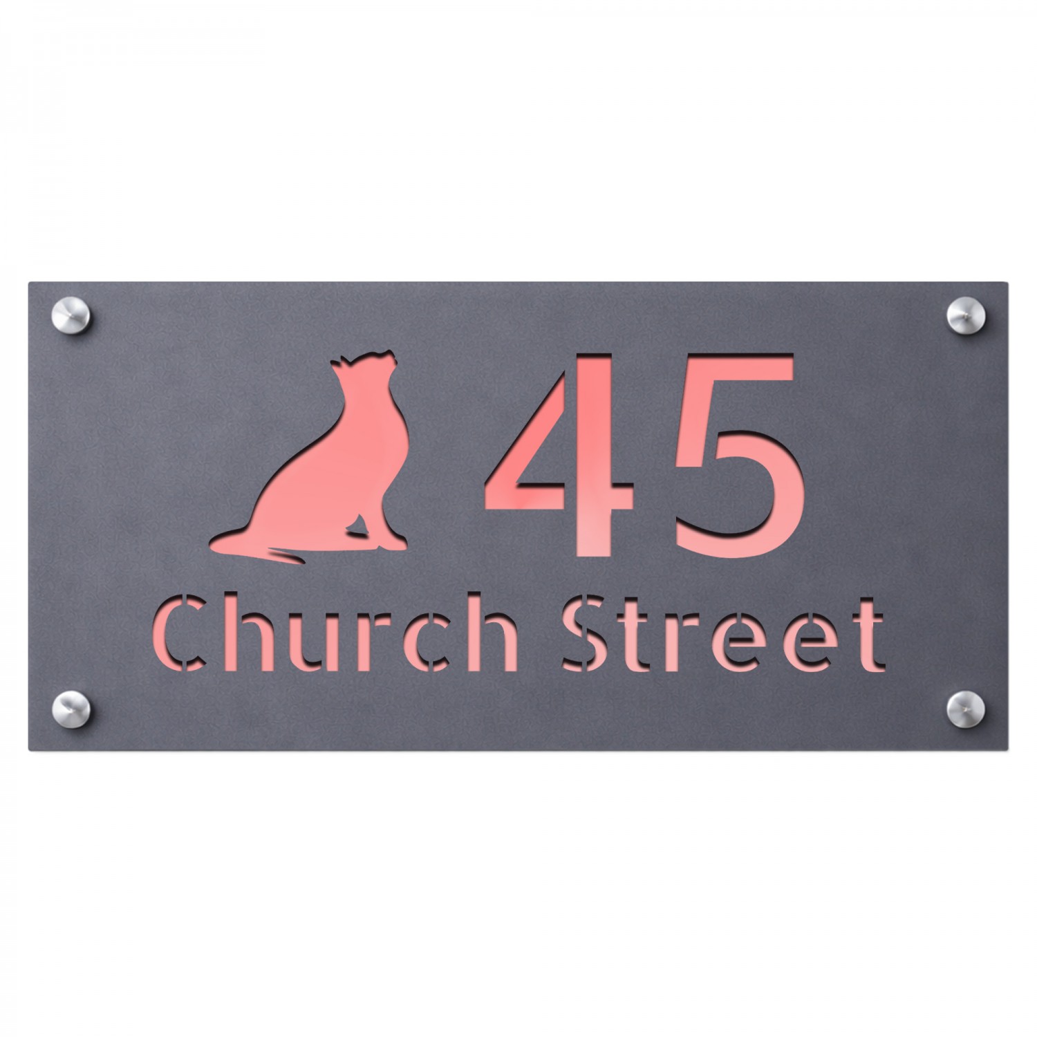 Personalised Address Plaque Cat Design Grey With Rose Gold