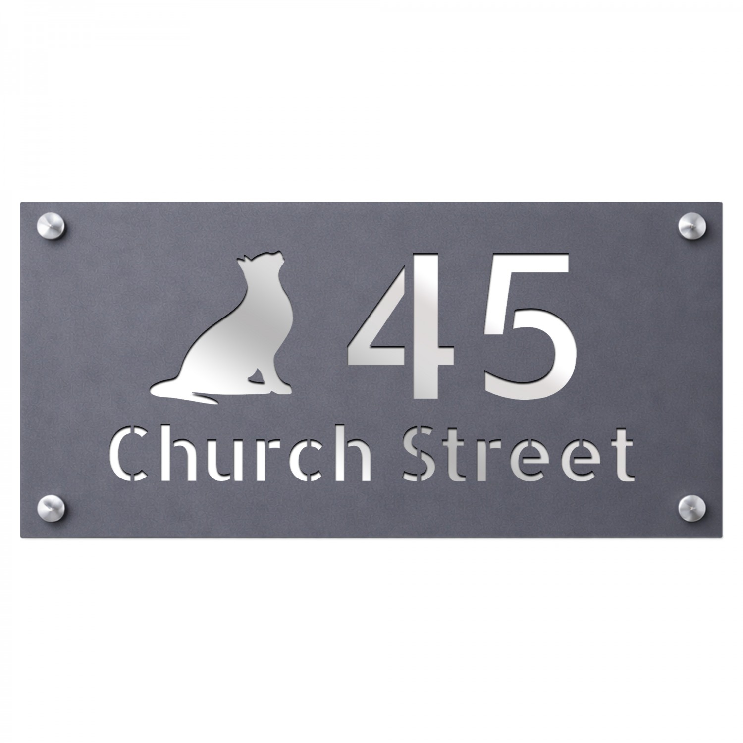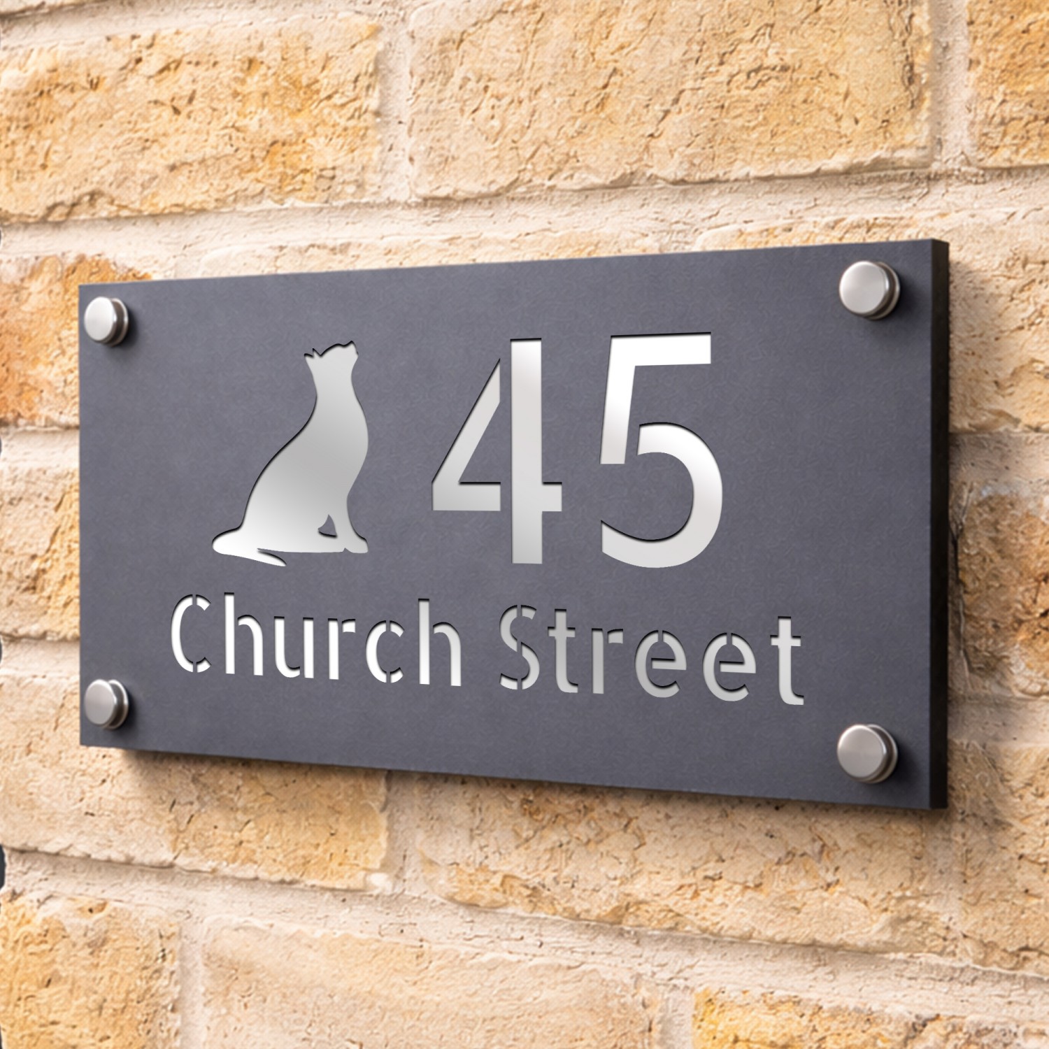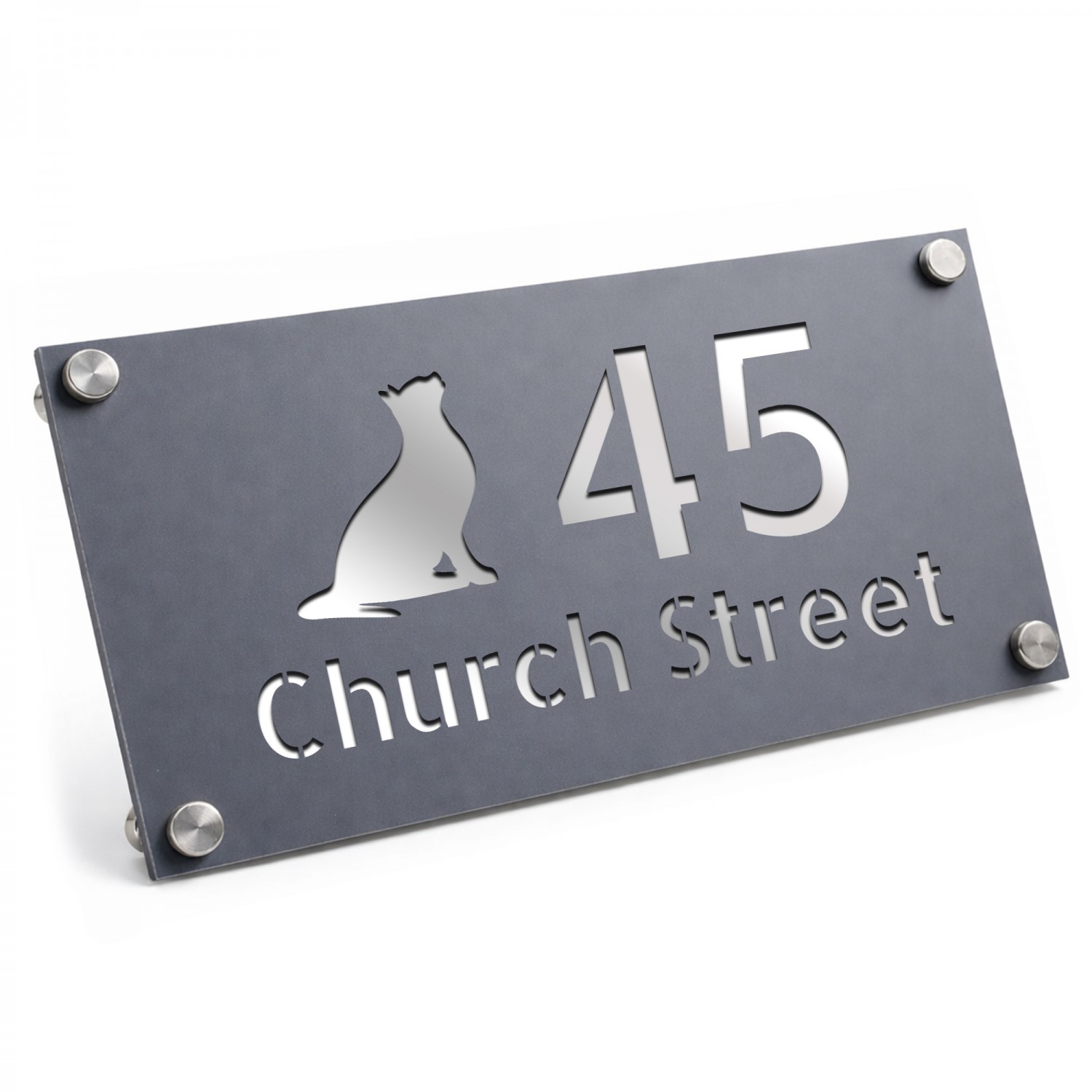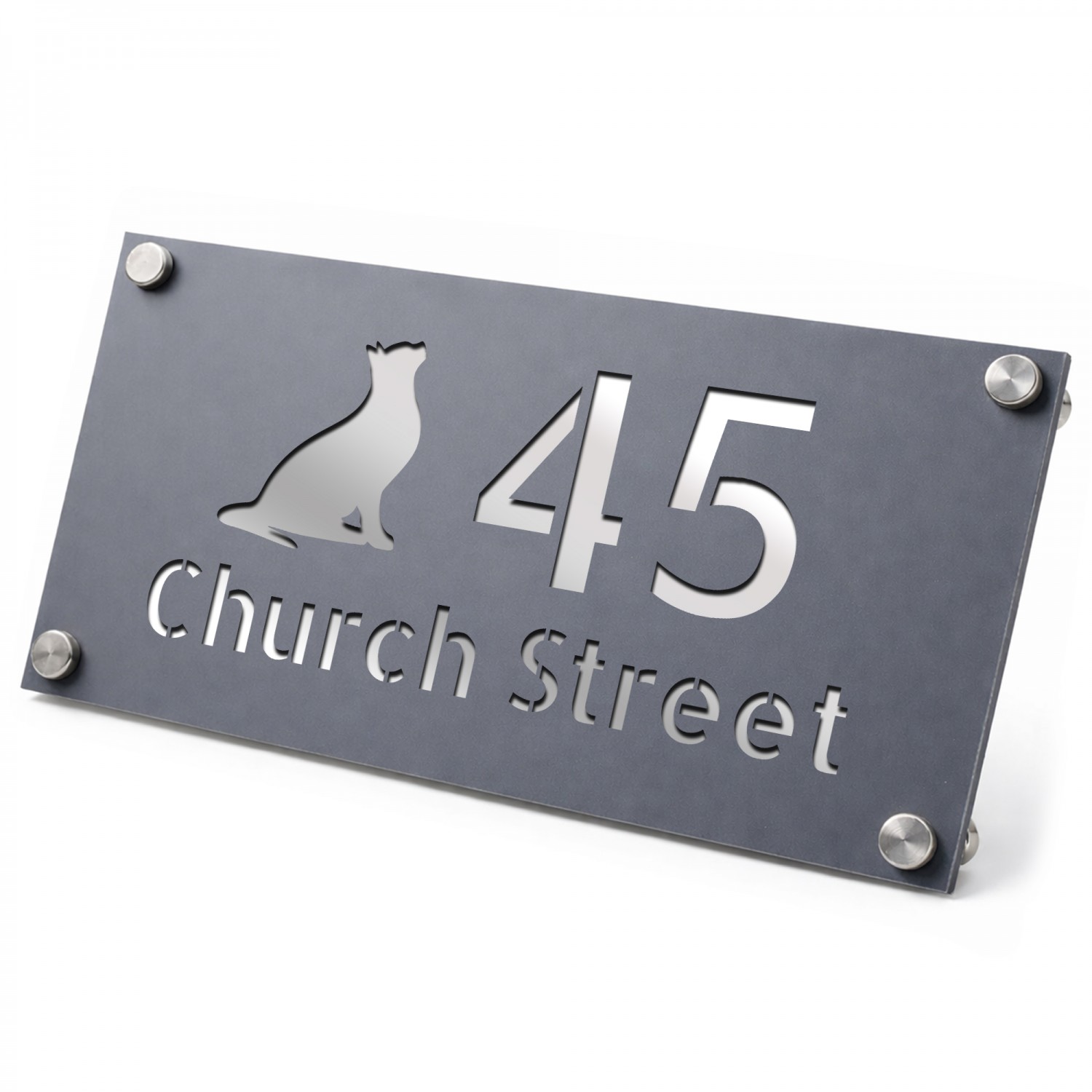 Personalised Address Plaque Cat Design Grey With Silver House