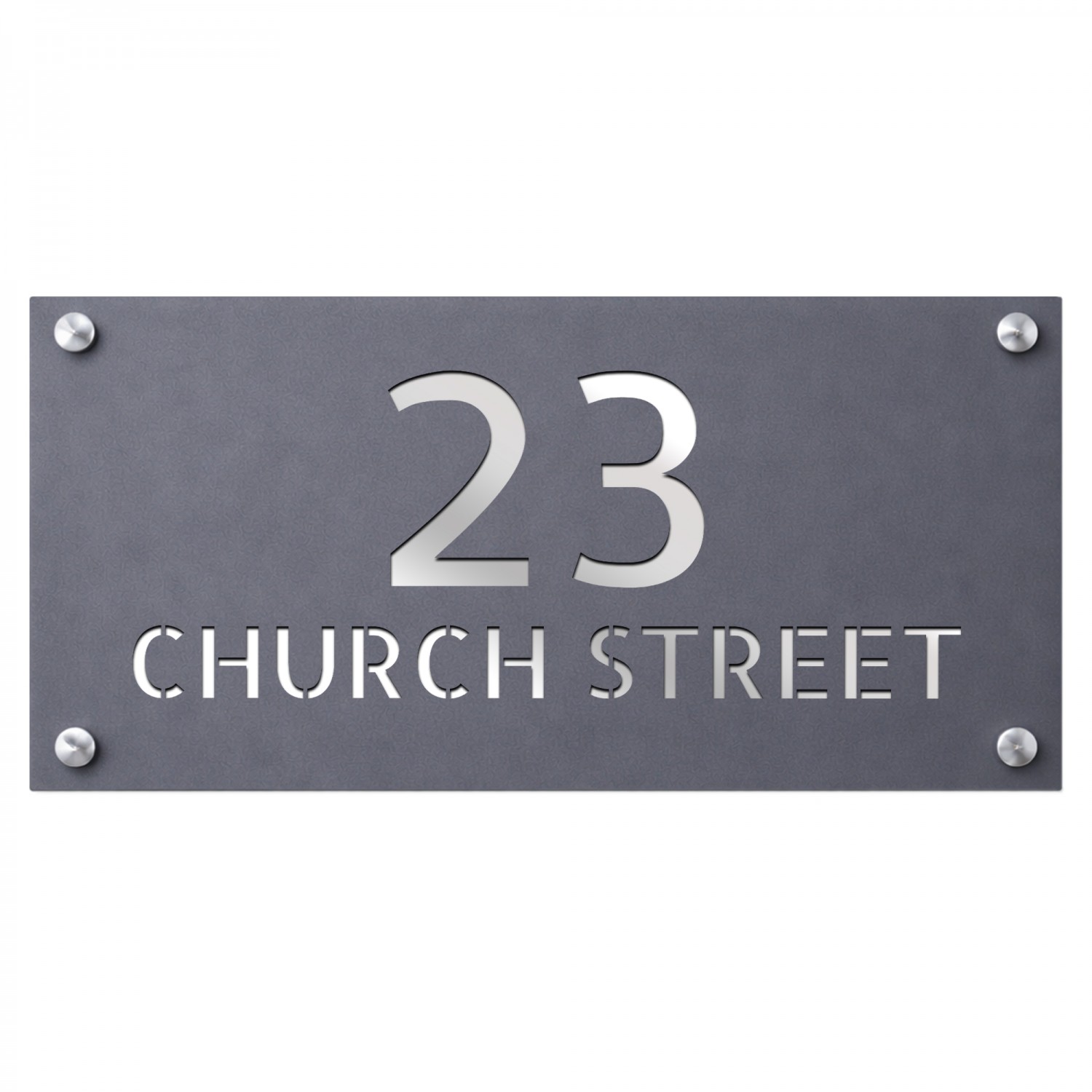 Modern Acrylic House Sign - 280x140mm - Silver Mirror Back Plate with Mineral Grey Front Plate - Laser Cut 3D Design - 4 Silver Standoffs