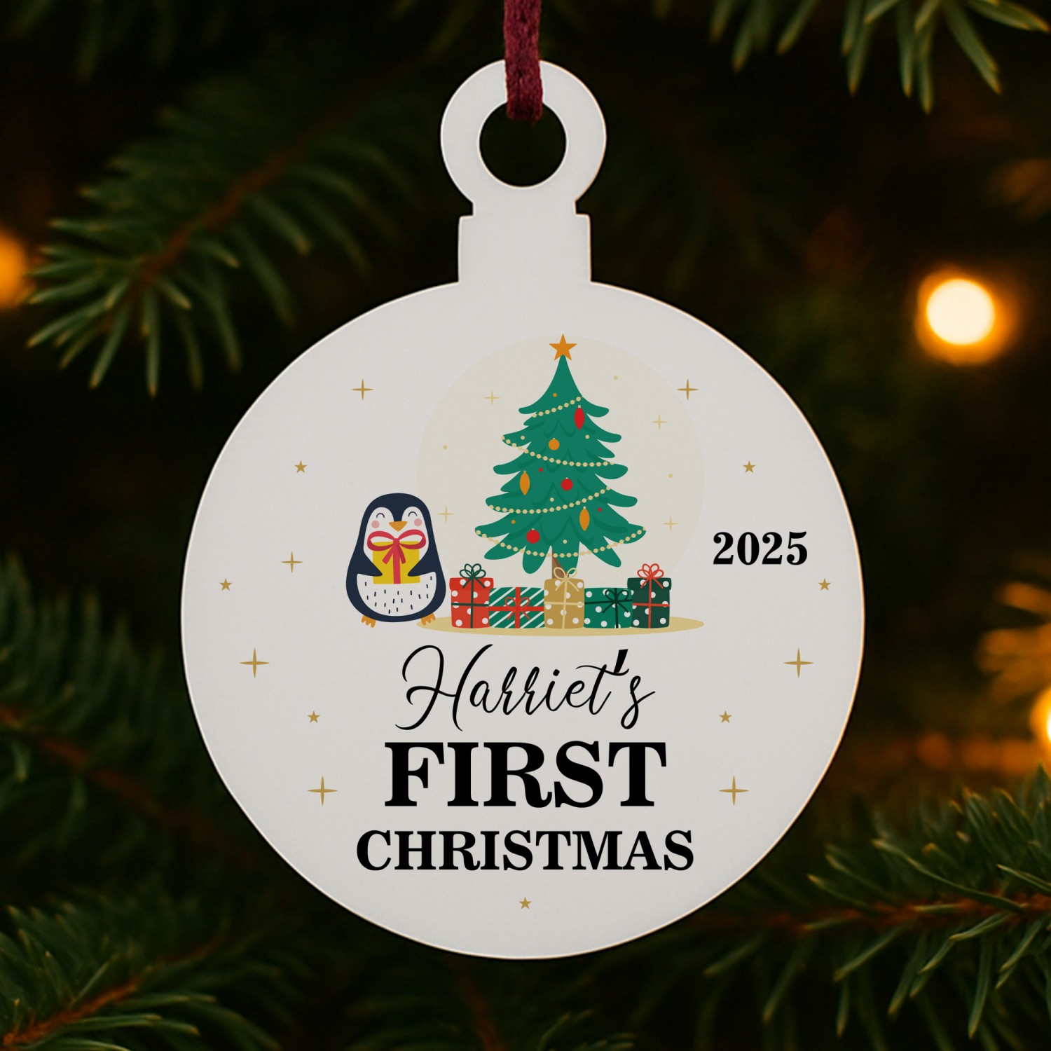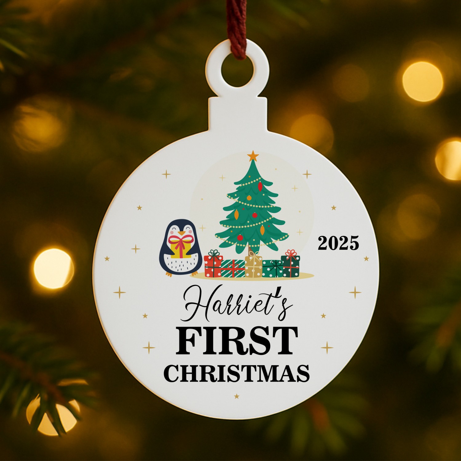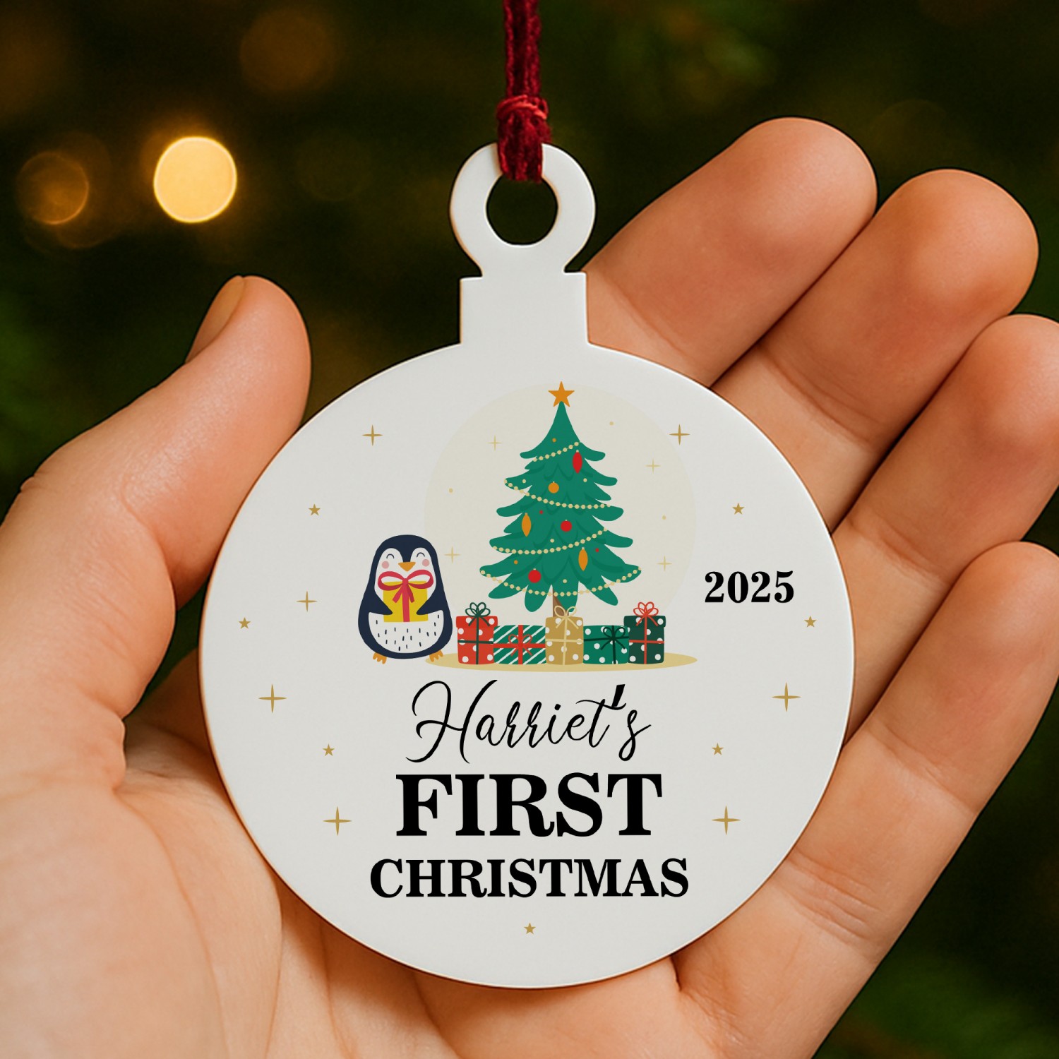 The festive design includes a penguin, christmas tree and snowflakes, combined with your chosen name and year to create a truly unique first Christmas decoration. Perfect as a baby's first Christmas bauble, a Christening or newborn gift, or a special keepsake for proud parents, this star captures the joy of the season in a way that can be treasured forever.