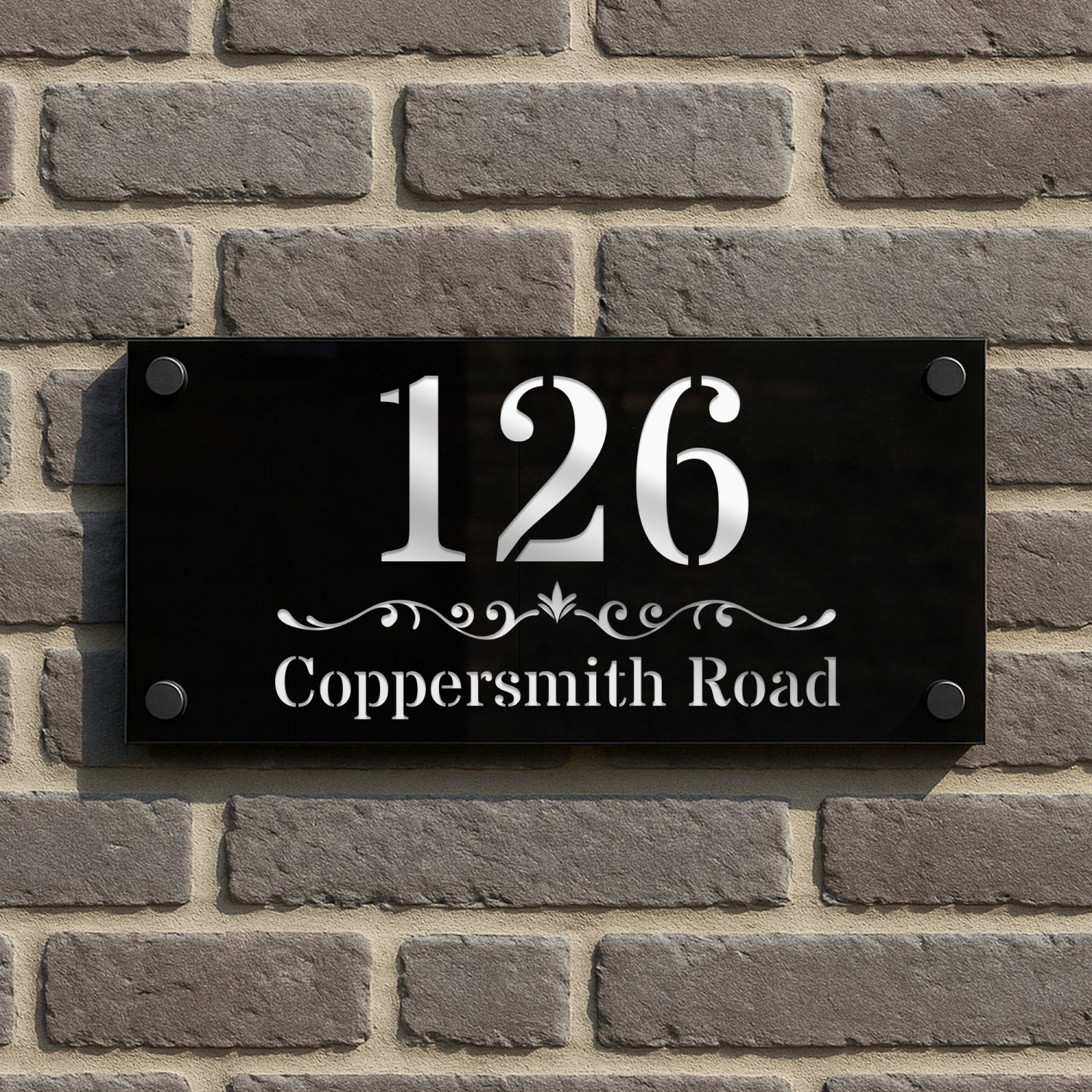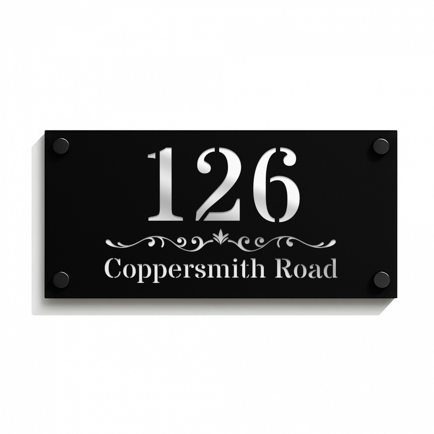 Modern Acrylic House Sign - 280x140mm - Silver Mirror Back Plate with Shiny Black Front Plate - Laser Cut 3D Design - 4 Matte Black Standoffs