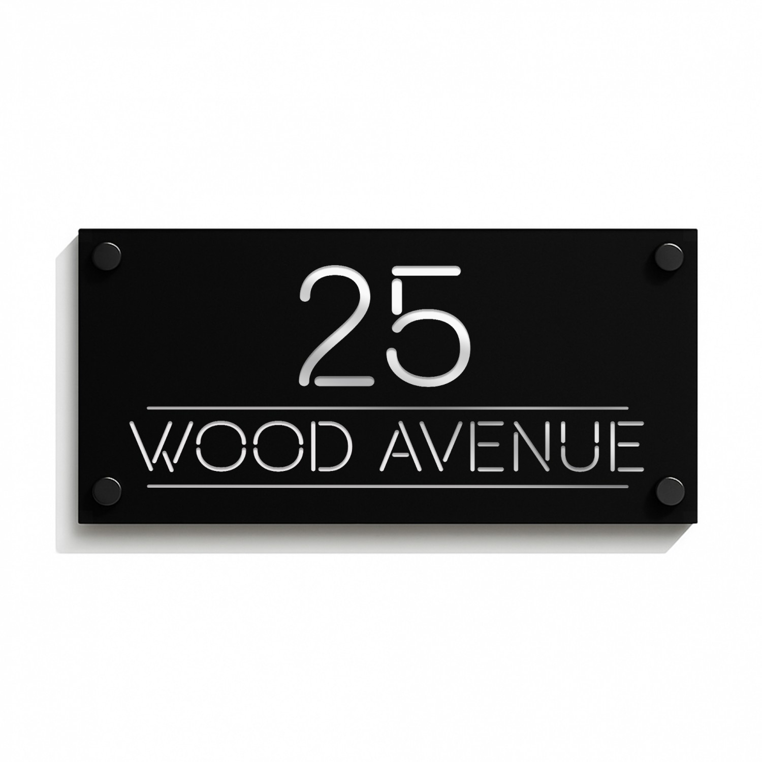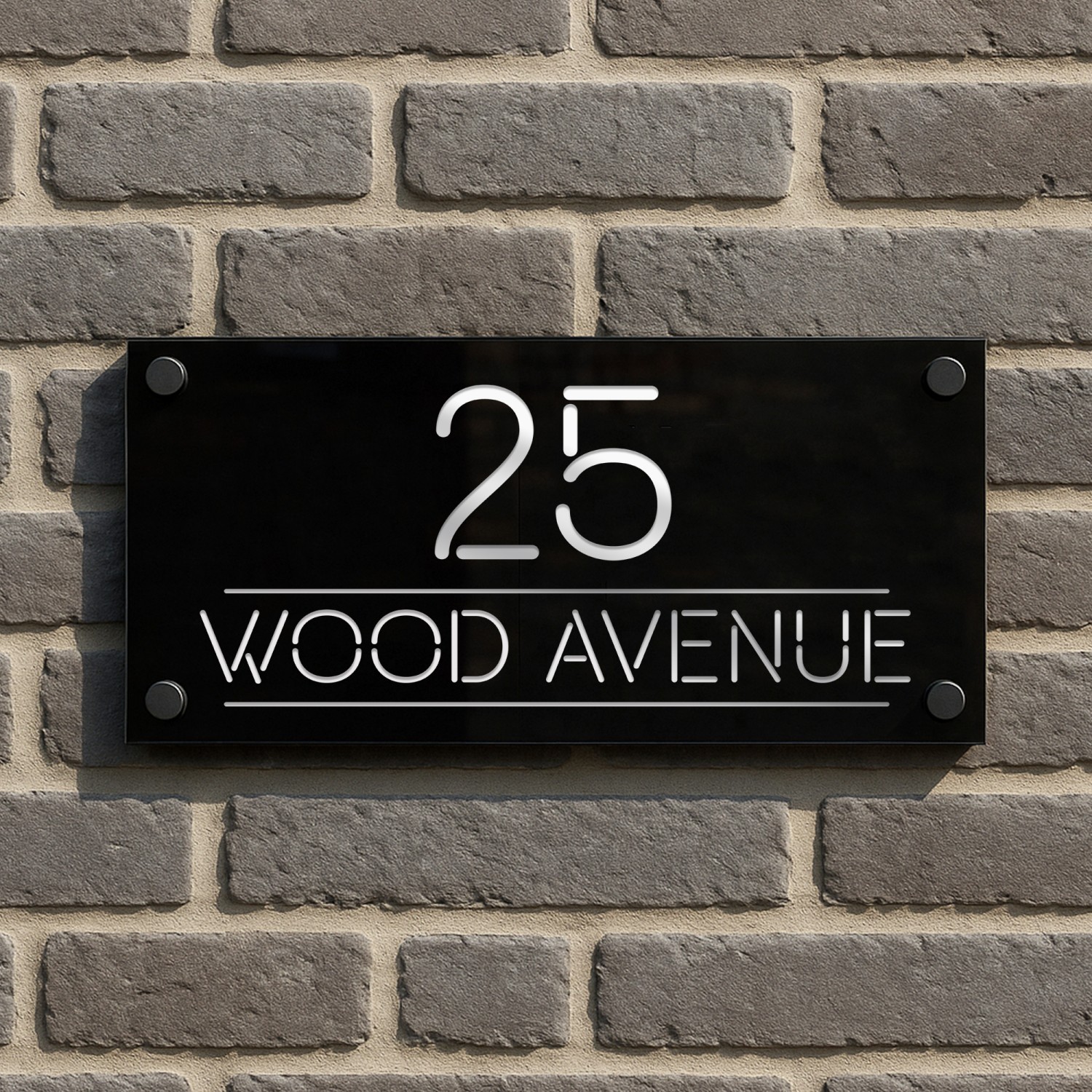 Modern Acrylic House Sign - 280x140mm - Silver Mirror Back Plate with Shiny Black Front Plate - Laser Cut 3D Design - 4 Matte Black Standoffs