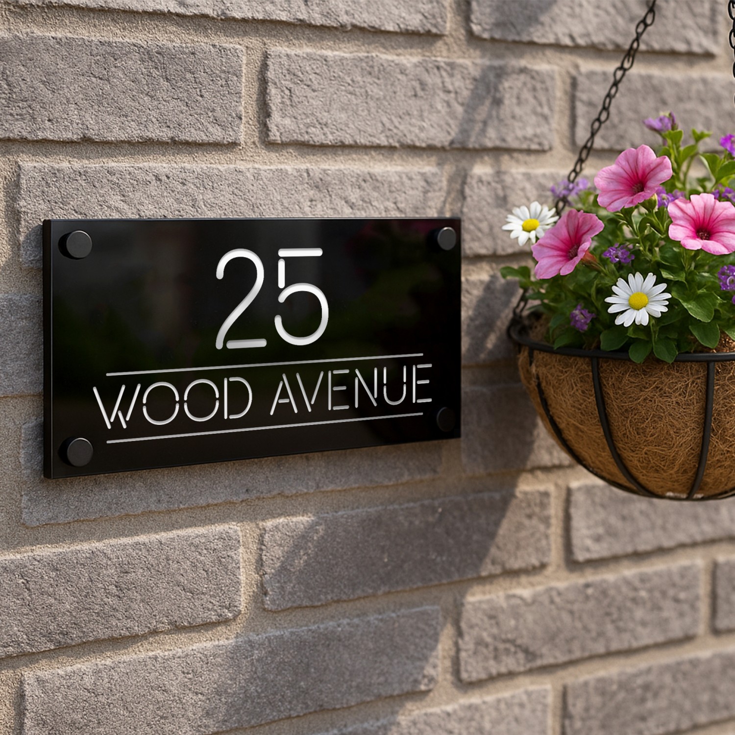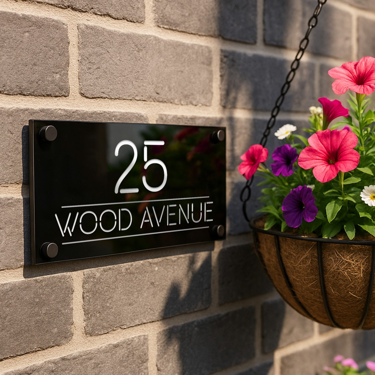 Add a touch of contemporary elegance to your home's exterior with this premium acrylic house sign. Measuring 280 x 140mm, this sleek, modern sign is crafted with a stunning silver mirror back plate and a shiny black front plate, creating a striking contrast that's both stylish and easy to read.