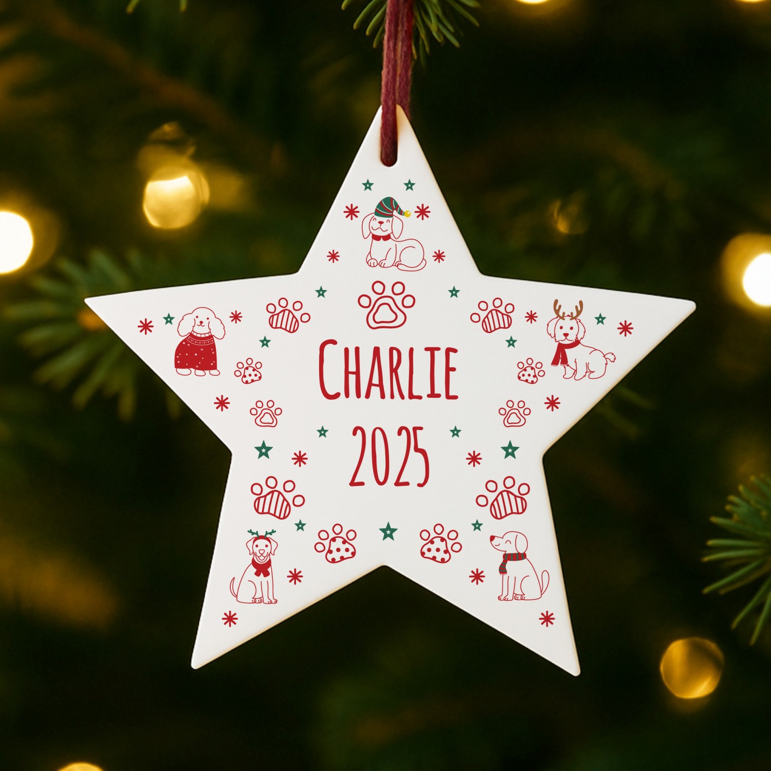 The playful design features adorable festive dog illustrations, paw prints, stars and snowflakes, making it a wonderful way to include your beloved pet in your Christmas traditions. Whether it's for your own tree or as a thoughtful gift for a fellow dog lover, this keepsake decoration captures the joy of the season and the special bond shared with a furry companion.