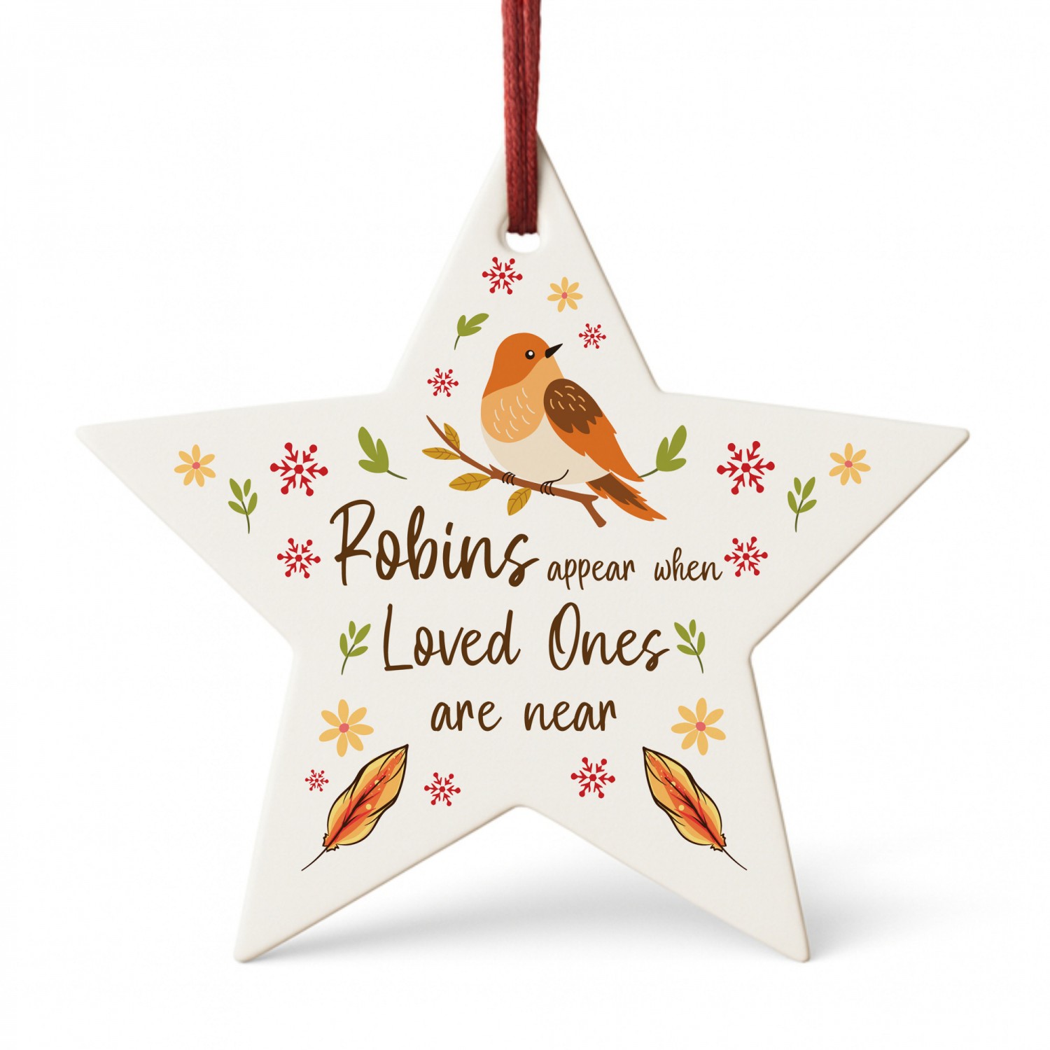The heartfelt design features a delicate robin illustration, surrounded by stars, holly and snowflakes, paired with the touching words 'Robins Appear When Lost Loved Ones Are Near'. A meaningful way to honour the memory of someone special, this ornament offers a gentle reminder that loved ones are always close in spirit. Perfect as a memorial Christmas decoration, a thoughtful sympathy gift, or a treasured keepsake to bring comfort during the festive season, this star captures the love that lives on.