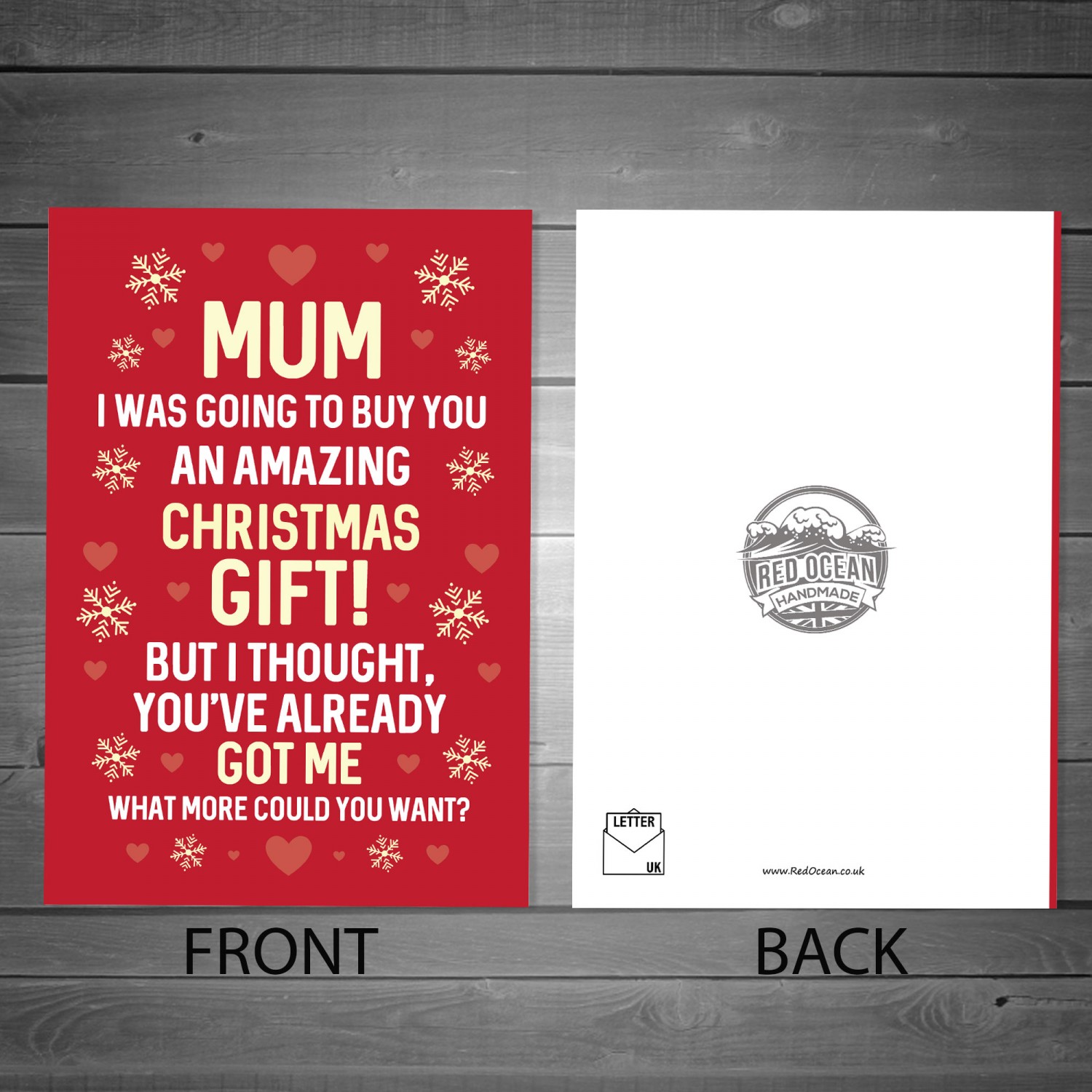 Every card and gift from Red Ocean is handmade with care and attention in the UK, we take pride in our work and we try our best to make each gift perfect. Our design team is regularly adding new ranges and we cater for every occasion, so our cards can be paired with other items from our range, Wooden Hearts, Plastic Wall Signs, Wall Mounted Frames, Wallet Cards, the options are endless. Be sure to browse for more Red Ocean Gifts.
