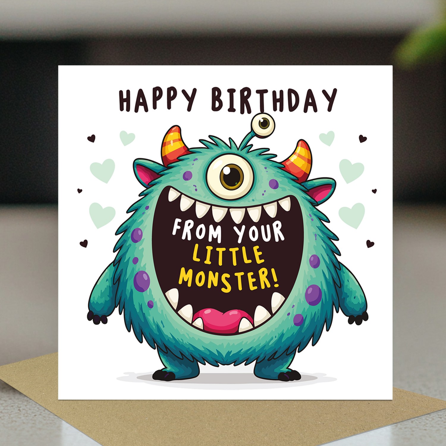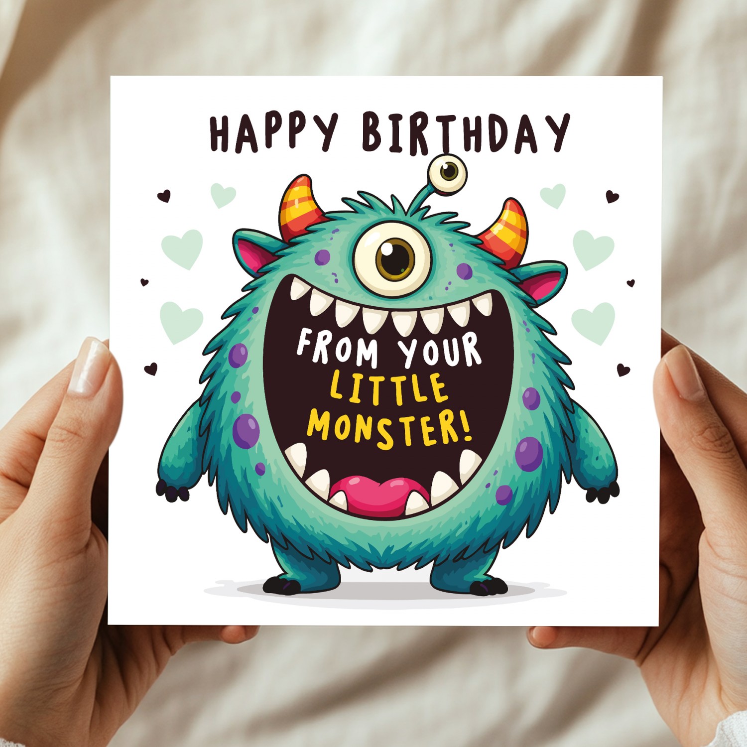 Measuring 14.5 x 14.5cm, our premium greeting card is printed on high-quality 350gsm cardstock, giving it a sturdy, luxury feel that stands out from standard high street cards. The vibrant monster illustration and playful wording create a heart-warming and humorous birthday surprise that parents will absolutely love.