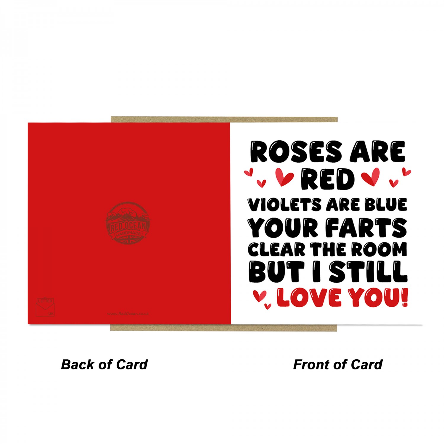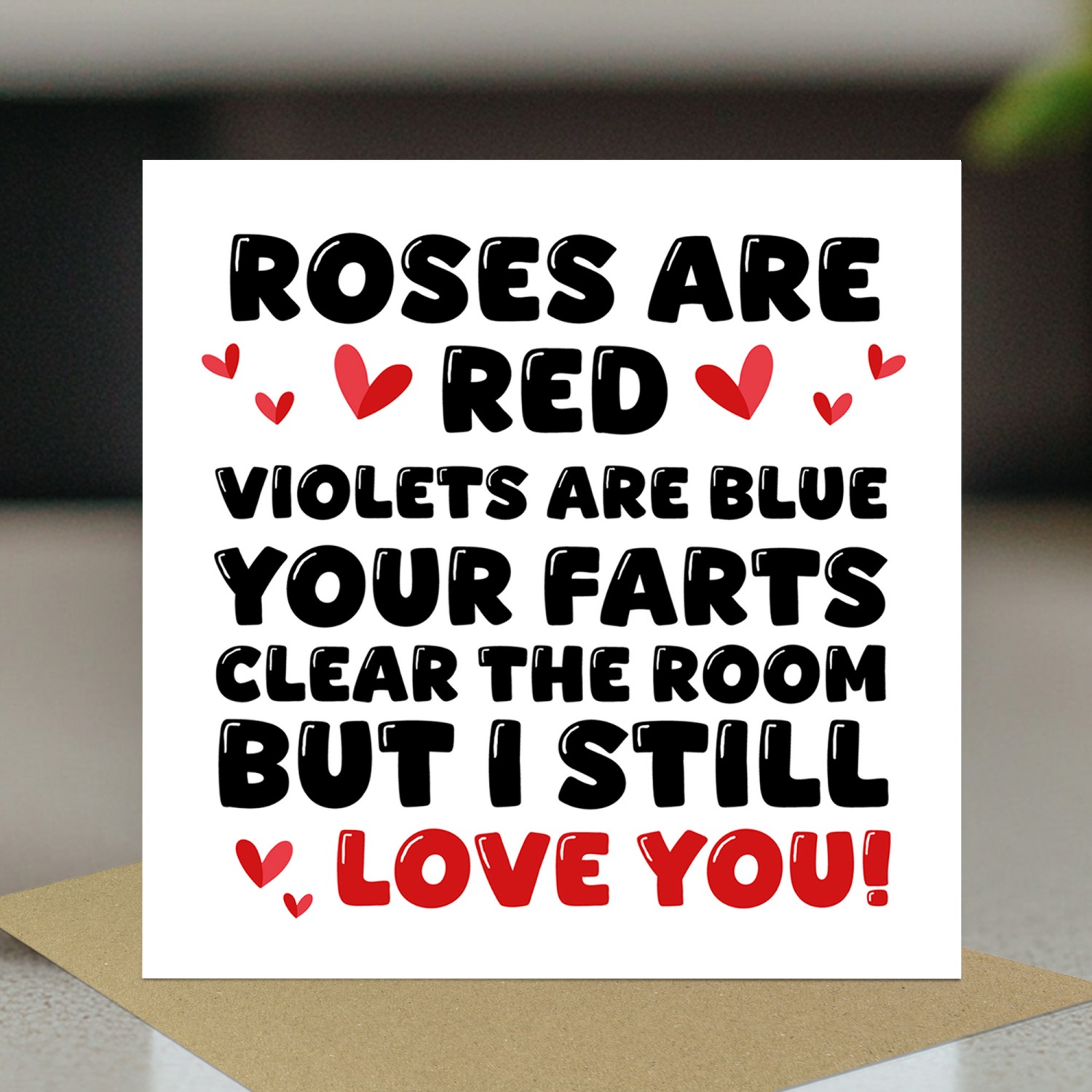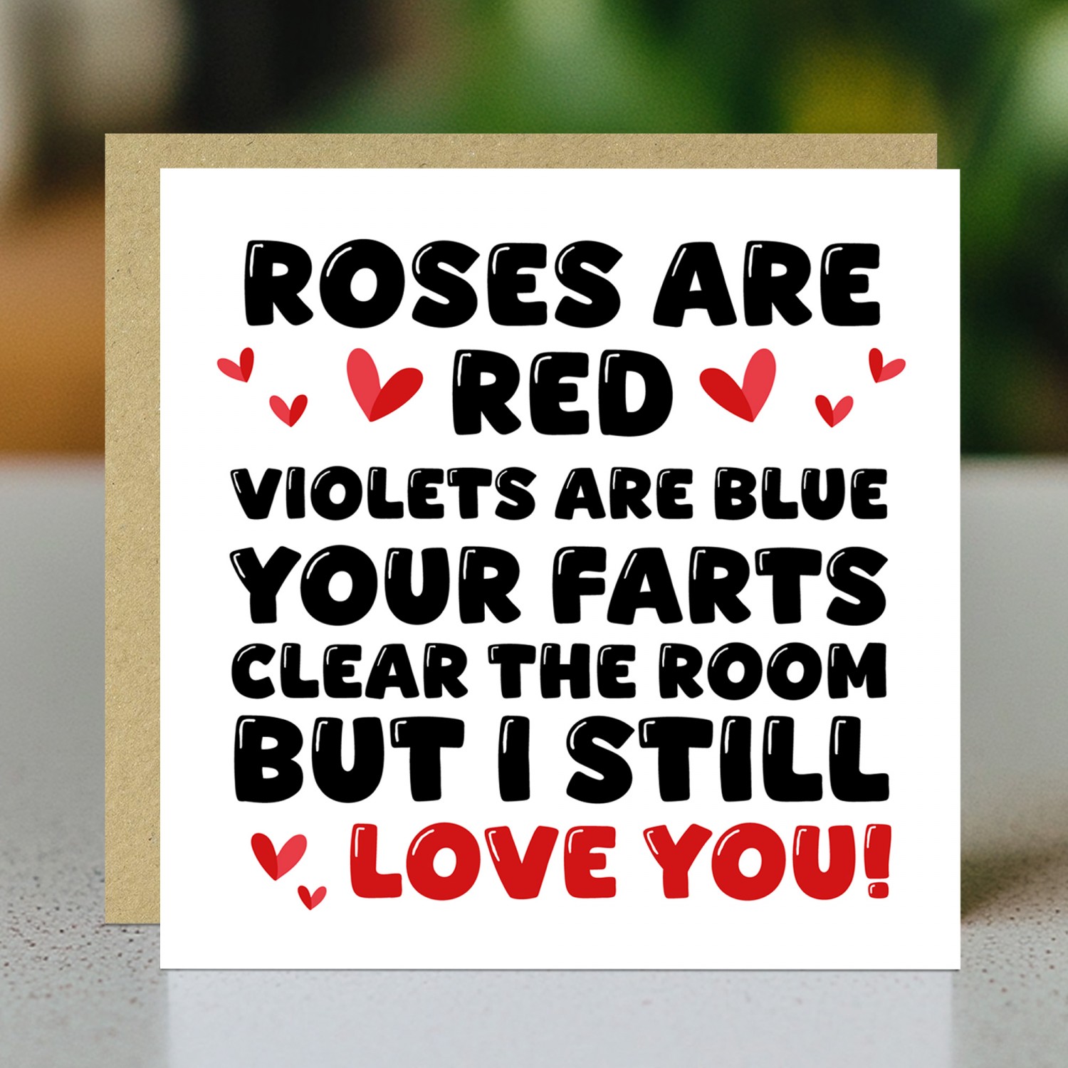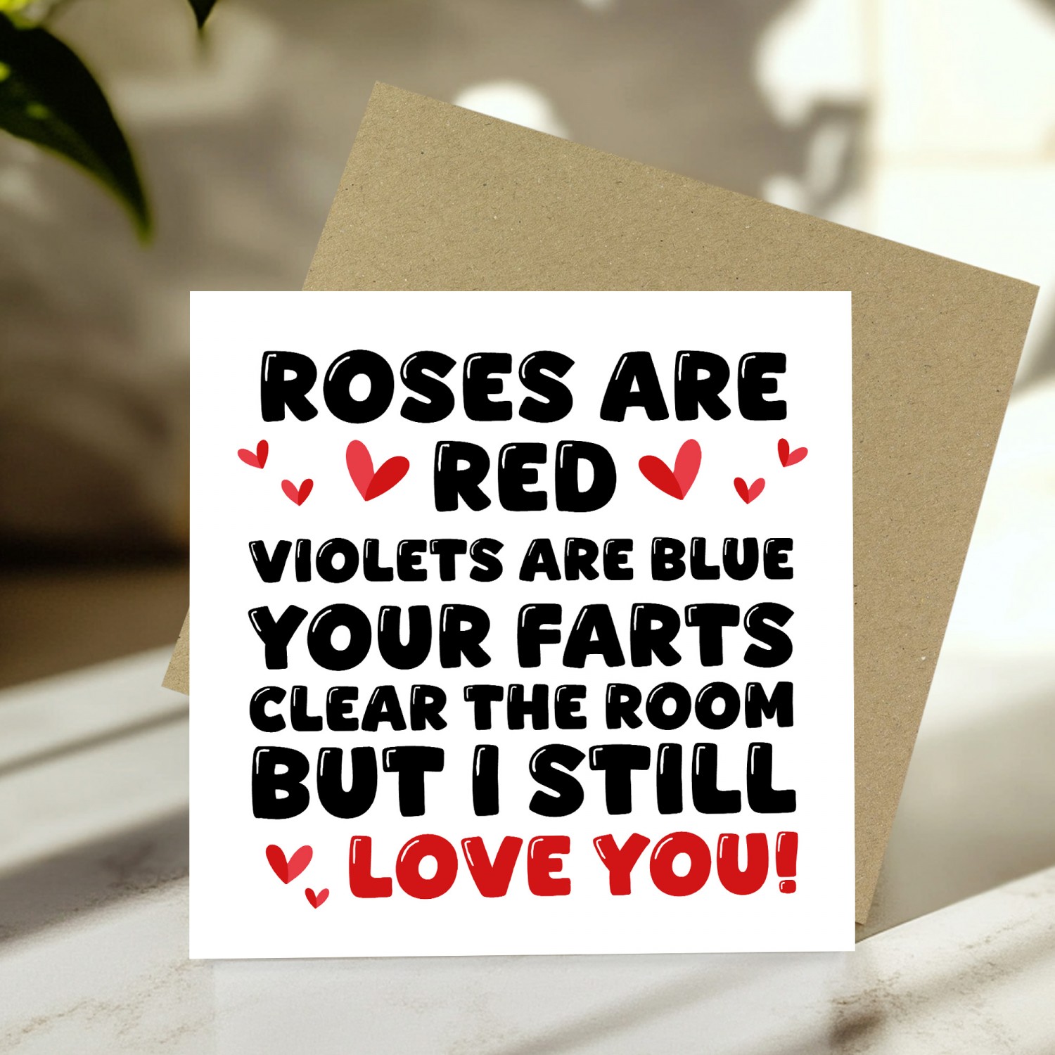The blank interior gives you the freedom to add your own personalised message, making it the perfect choice for expressing your thoughts and feelings in a unique way. Paired with a stylish brown craft envelope, this card is suitable for Valentines Day or Anniversary to make your partner laugh!