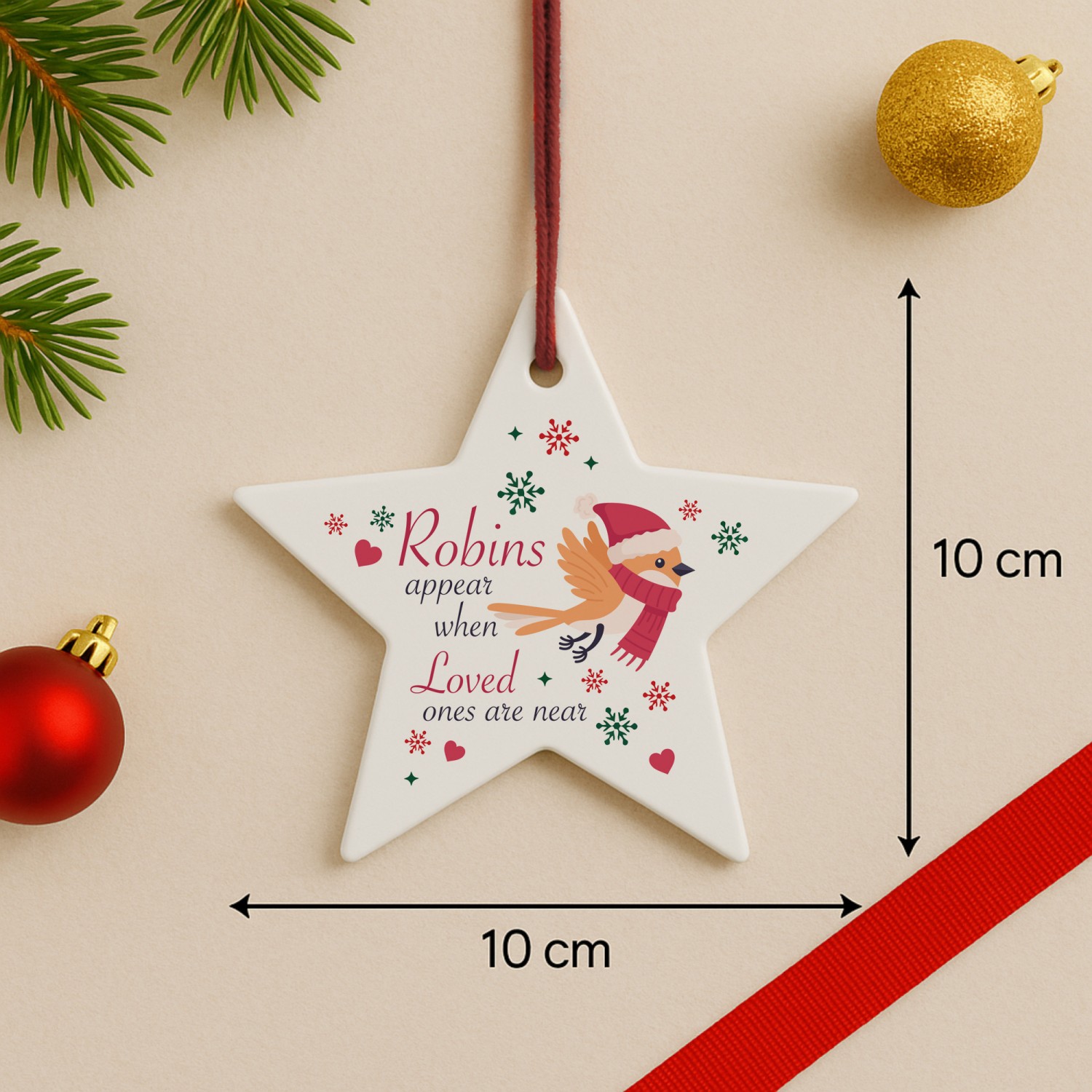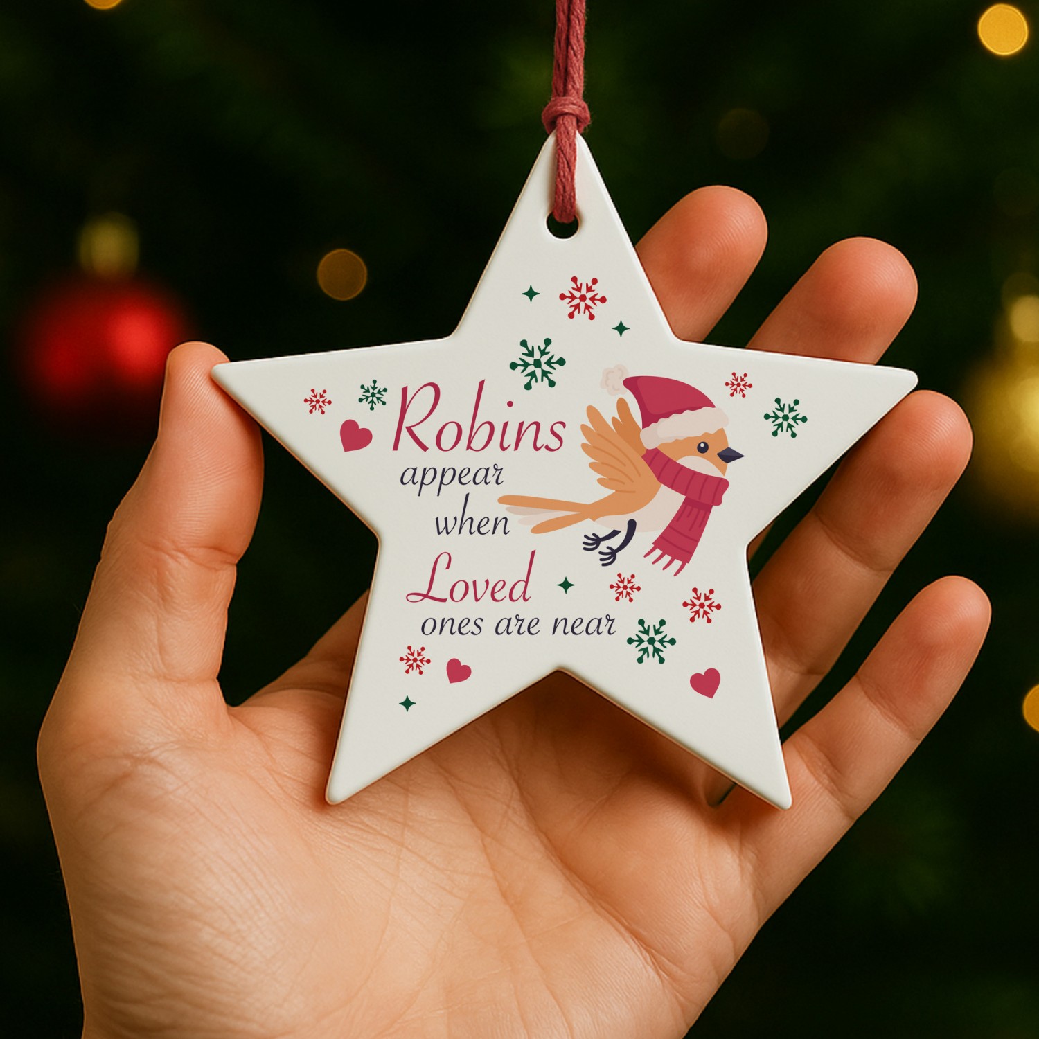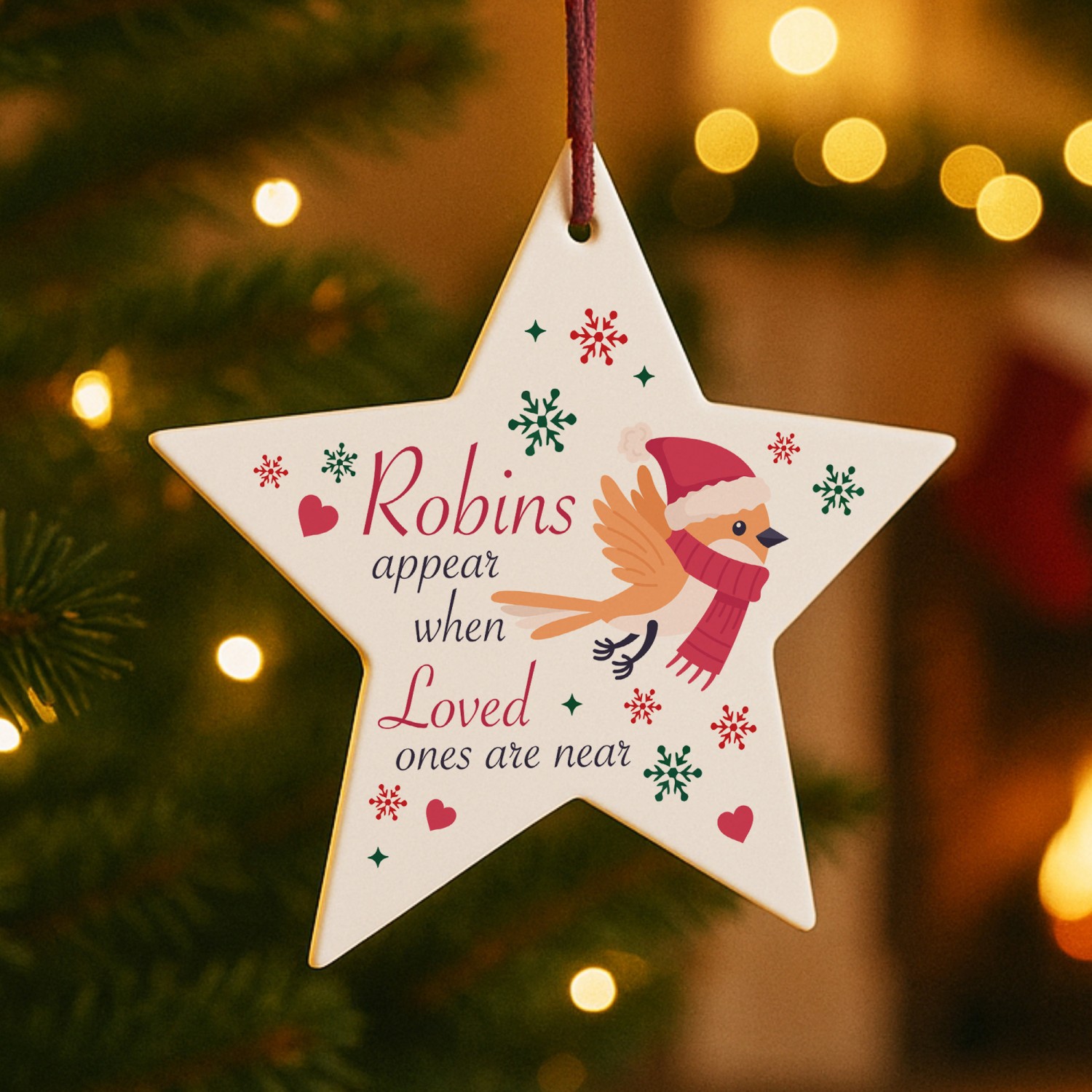 The heartfelt design features a delicate robin illustration, surrounded by stars, holly and snowflakes, paired with the touching words 'Robins Appear When Lost Loved Ones Are Near'. A meaningful way to honour the memory of someone special, this ornament offers a gentle reminder that loved ones are always close in spirit. Perfect as a memorial Christmas decoration, a thoughtful sympathy gift, or a treasured keepsake to bring comfort during the festive season, this star captures the love that lives on.