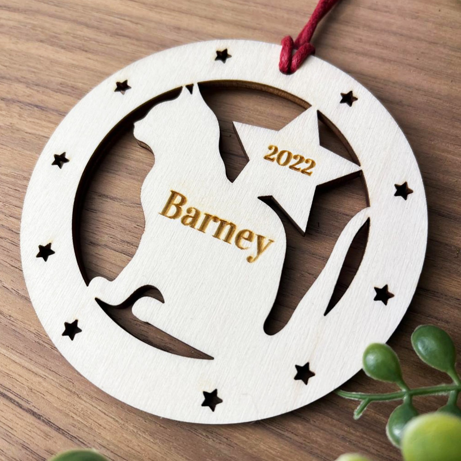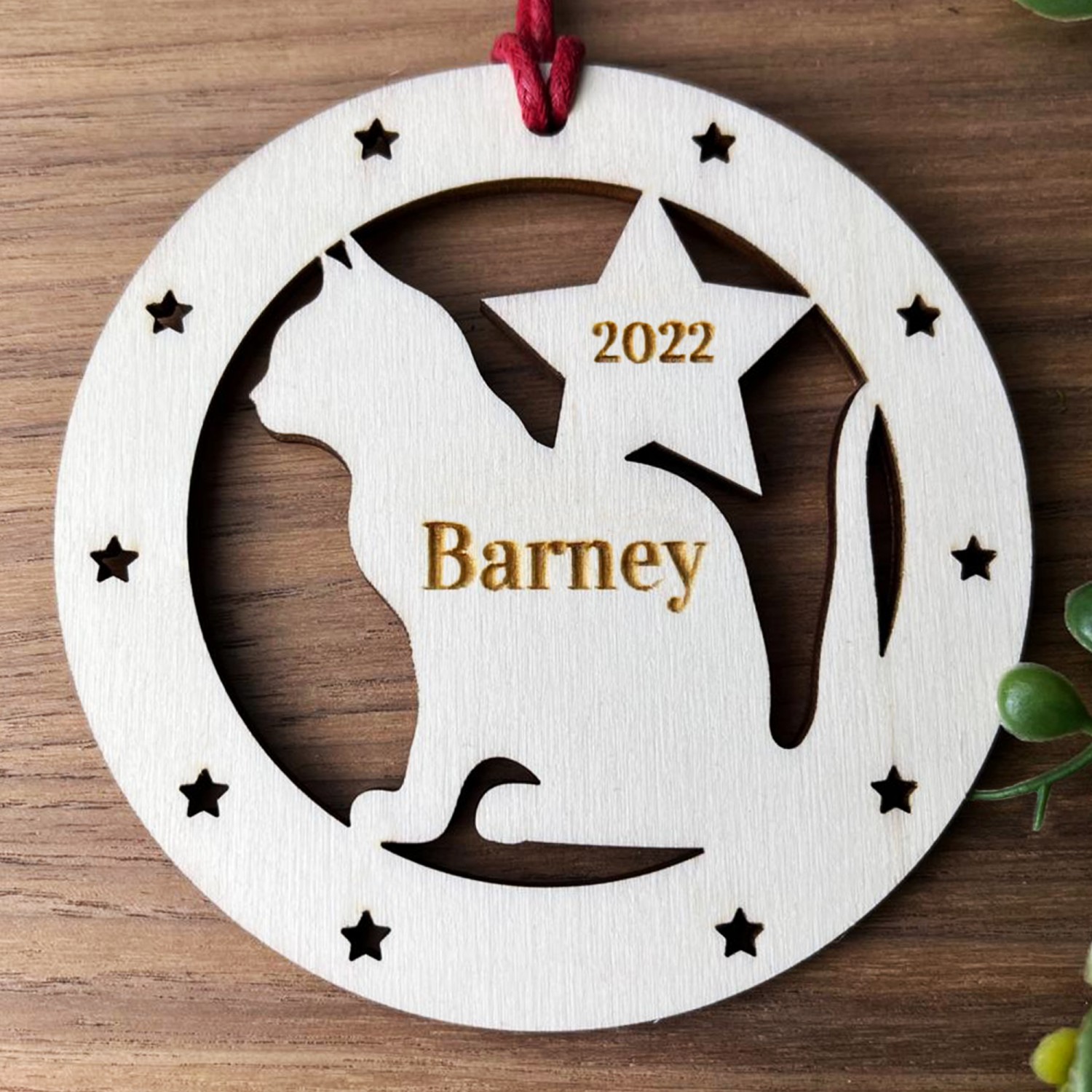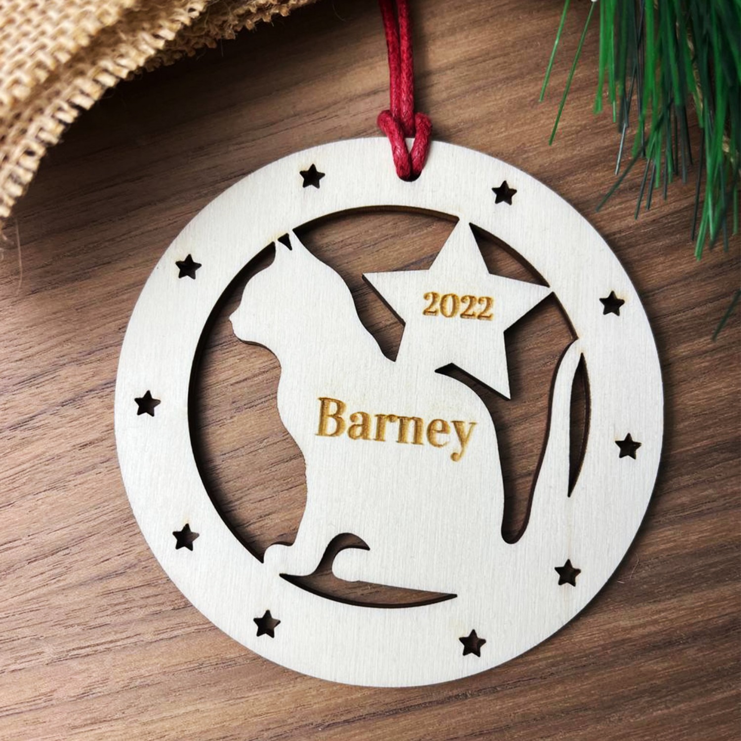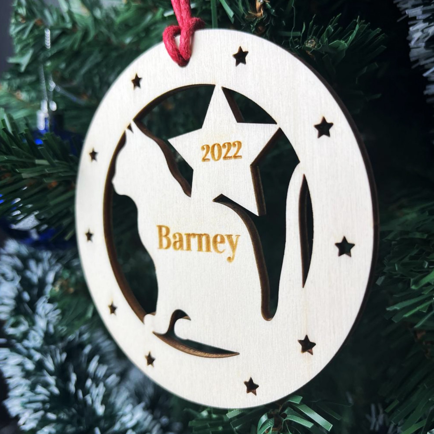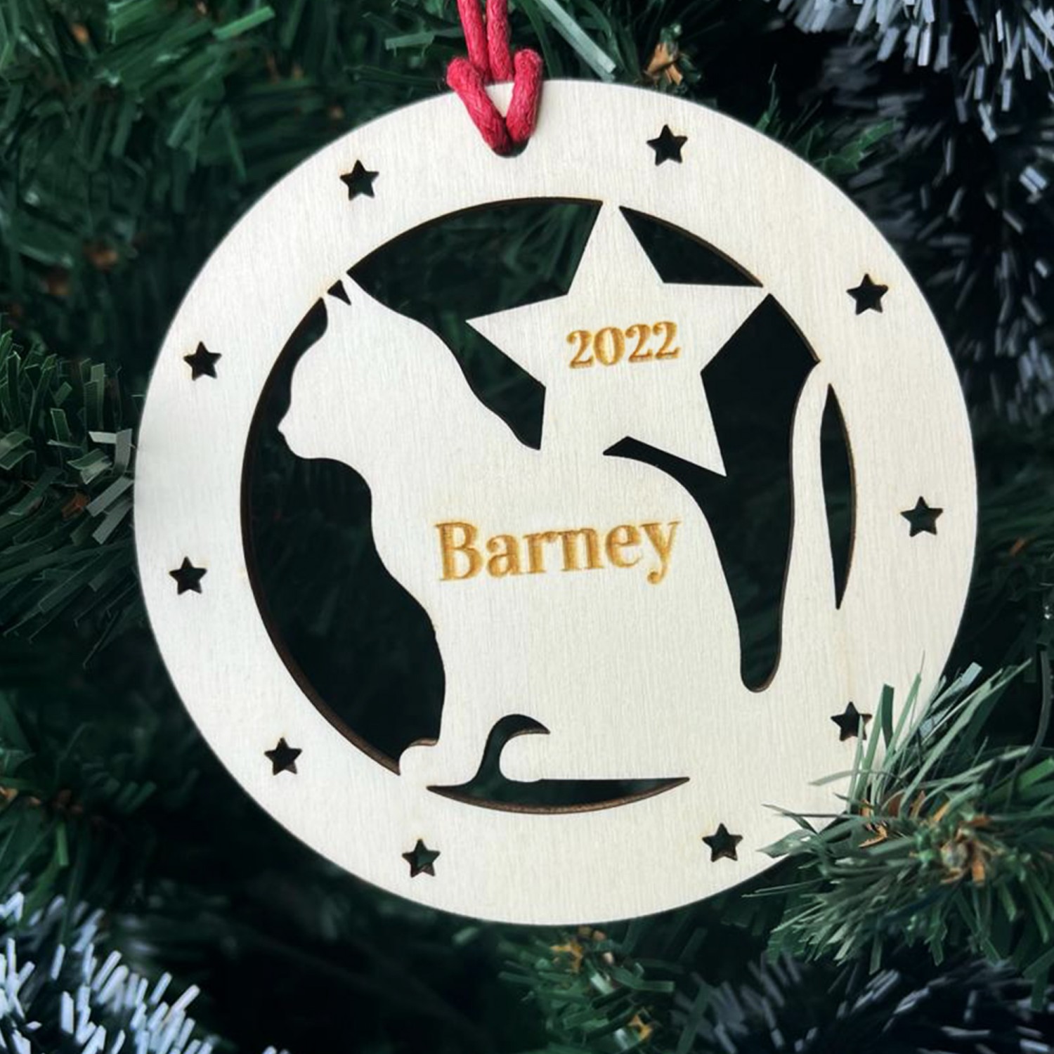 Personalised Cat Bauble Engraved Wooden Tree Decoration Pet Cat
