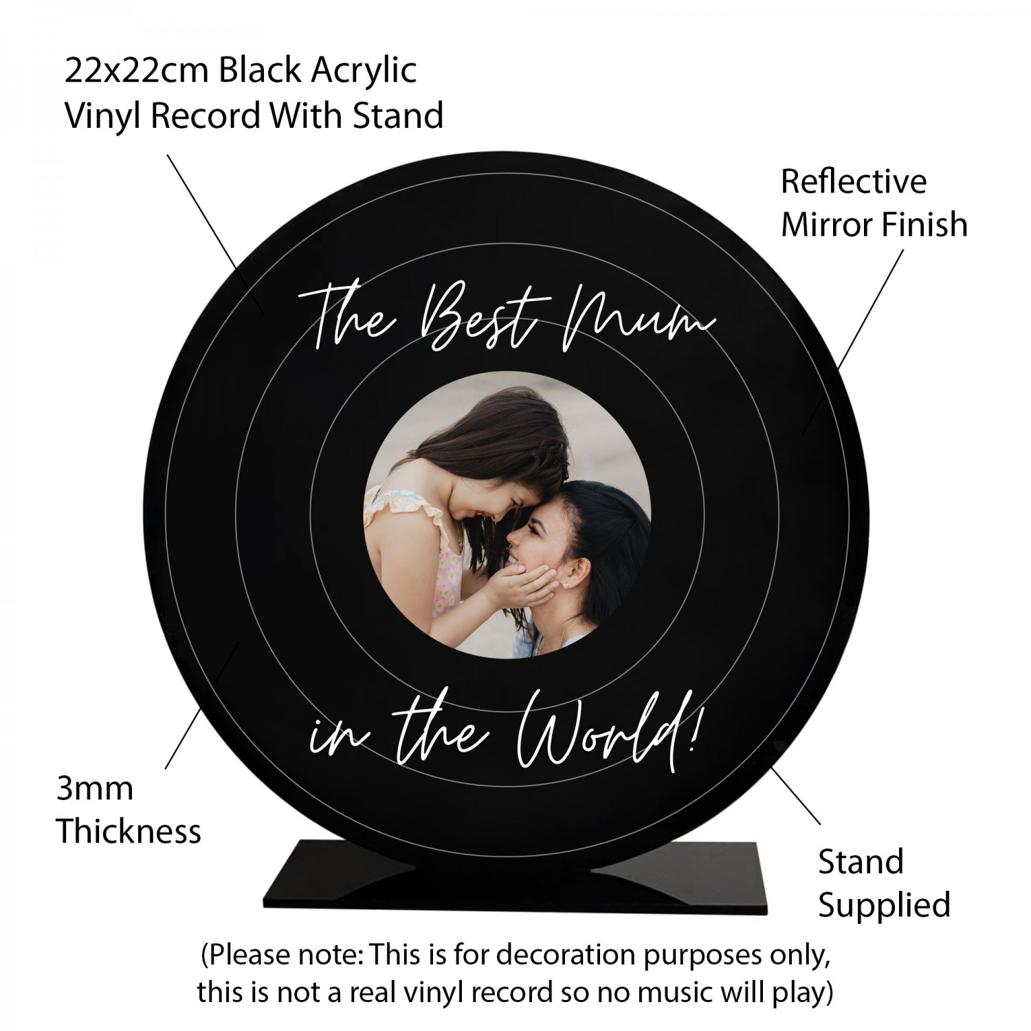 Crafted from premium quality black acrylic, the plaque measures 22cm x 22cm and boasts a sleek finish. Its 3mm thickness ensures durability while maintaining a refined appearance. The vinyl inspired design is expertly printed directly onto the acrylic surface, creating a flawless, professional look. Although it mimics the aesthetic of a traditional vinyl record, this plaque is purely decorative and serves as a stylish and sentimental display piece.