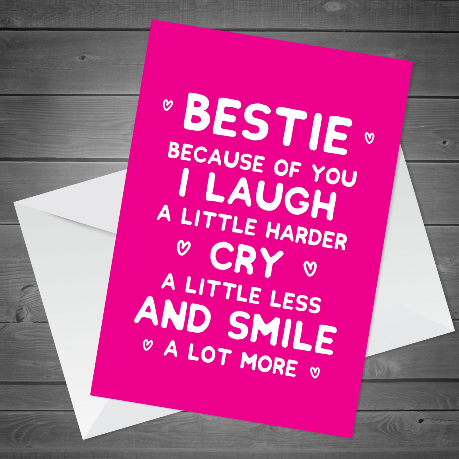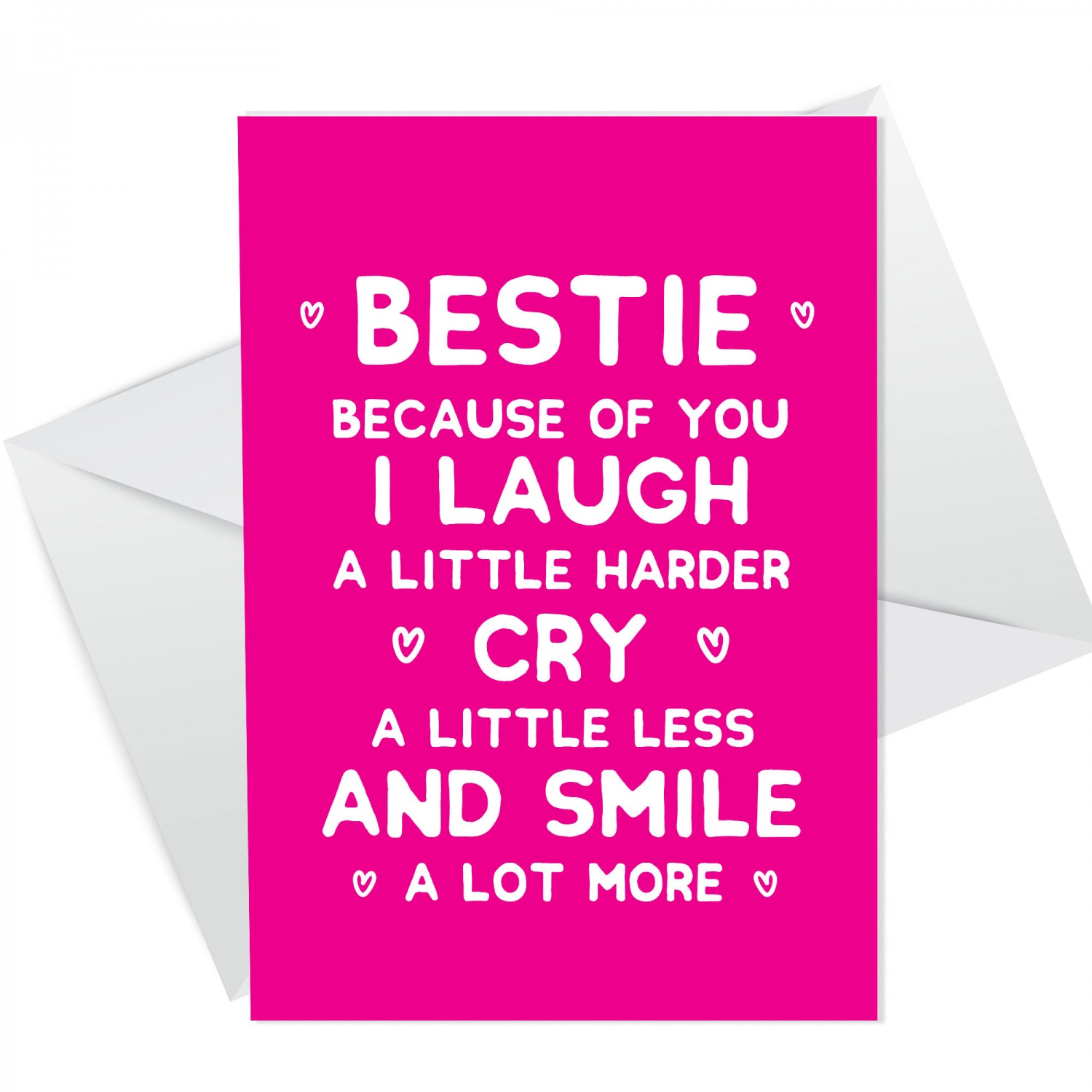 Featuring a beautiful and sentimental message that reads "Bestie Because of You I Laugh a Little Harder, Cry a Little Less, and Smile a Lot More", this card is the perfect way to show your best friend just how much they brighten up your life. Made from high-quality materials, this card is designed to last and is sure to put a smile on your best friend's face.