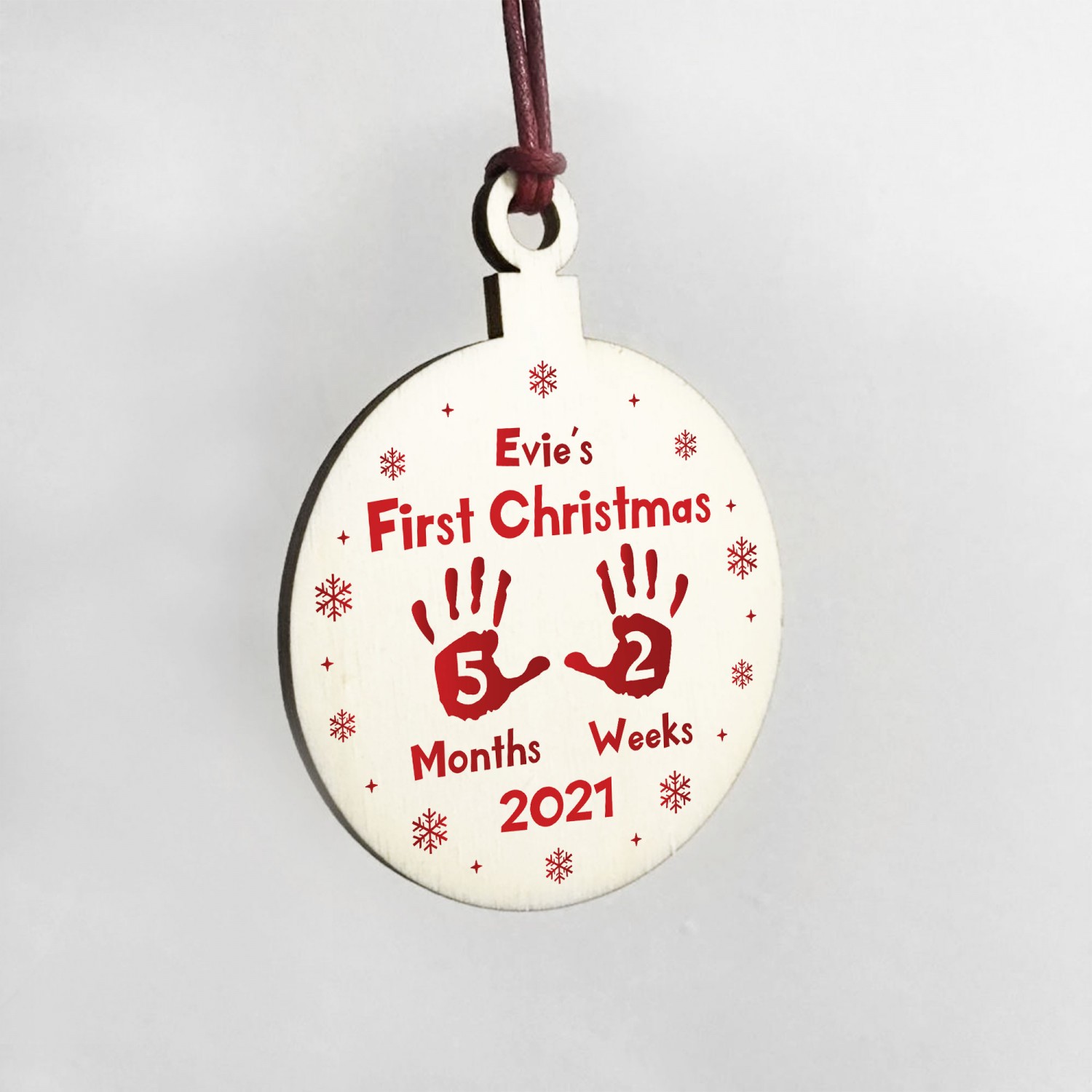 Please take care when sending us information. We will follow your style of writing, including Capital Letters, punctuation and spelling.The bauble is made from real wood, and the design is permanently printed into the wood. The wooden bauble is supplied with waxed cotton rope in both black and red colours to allow easy hanging and looks great in any room of the house.