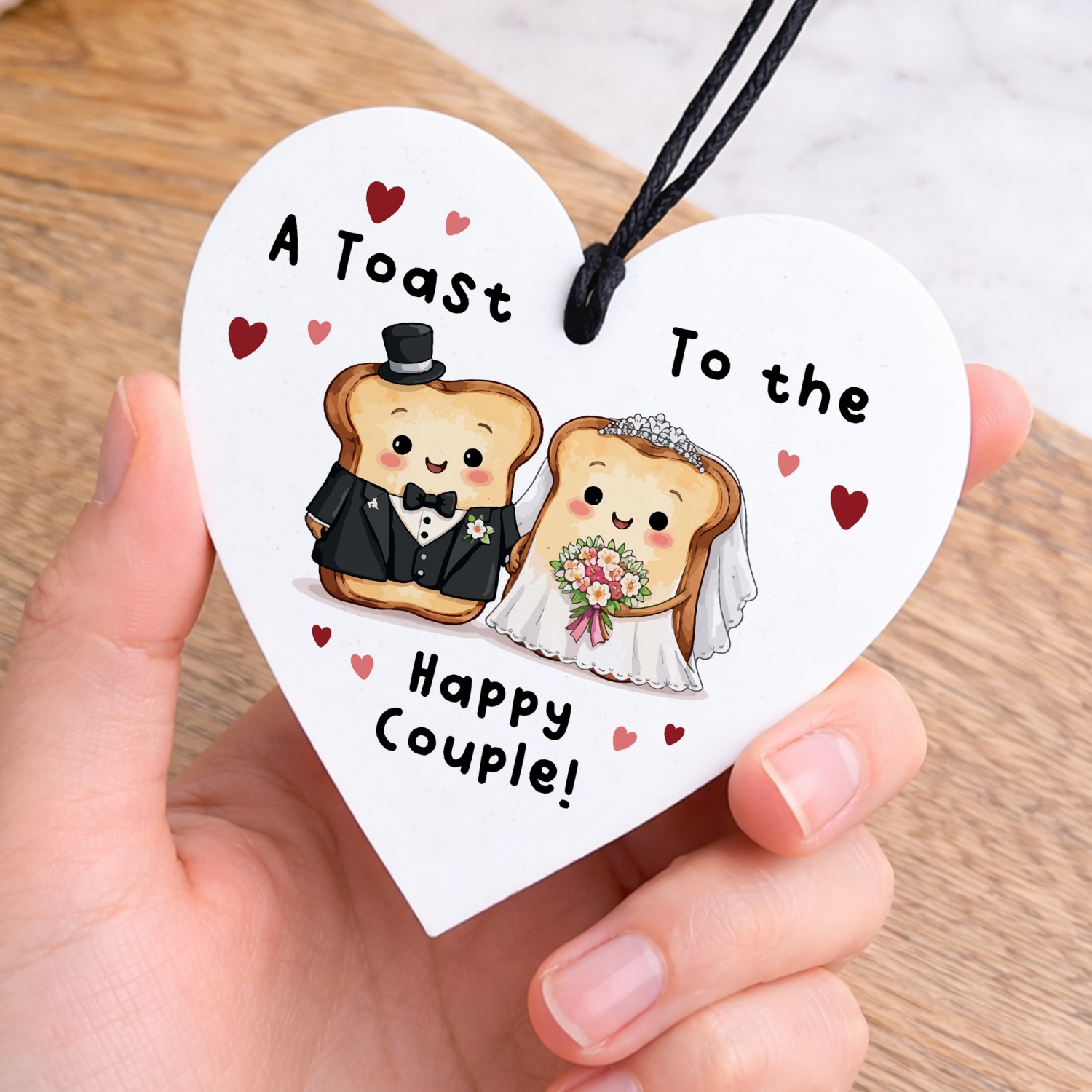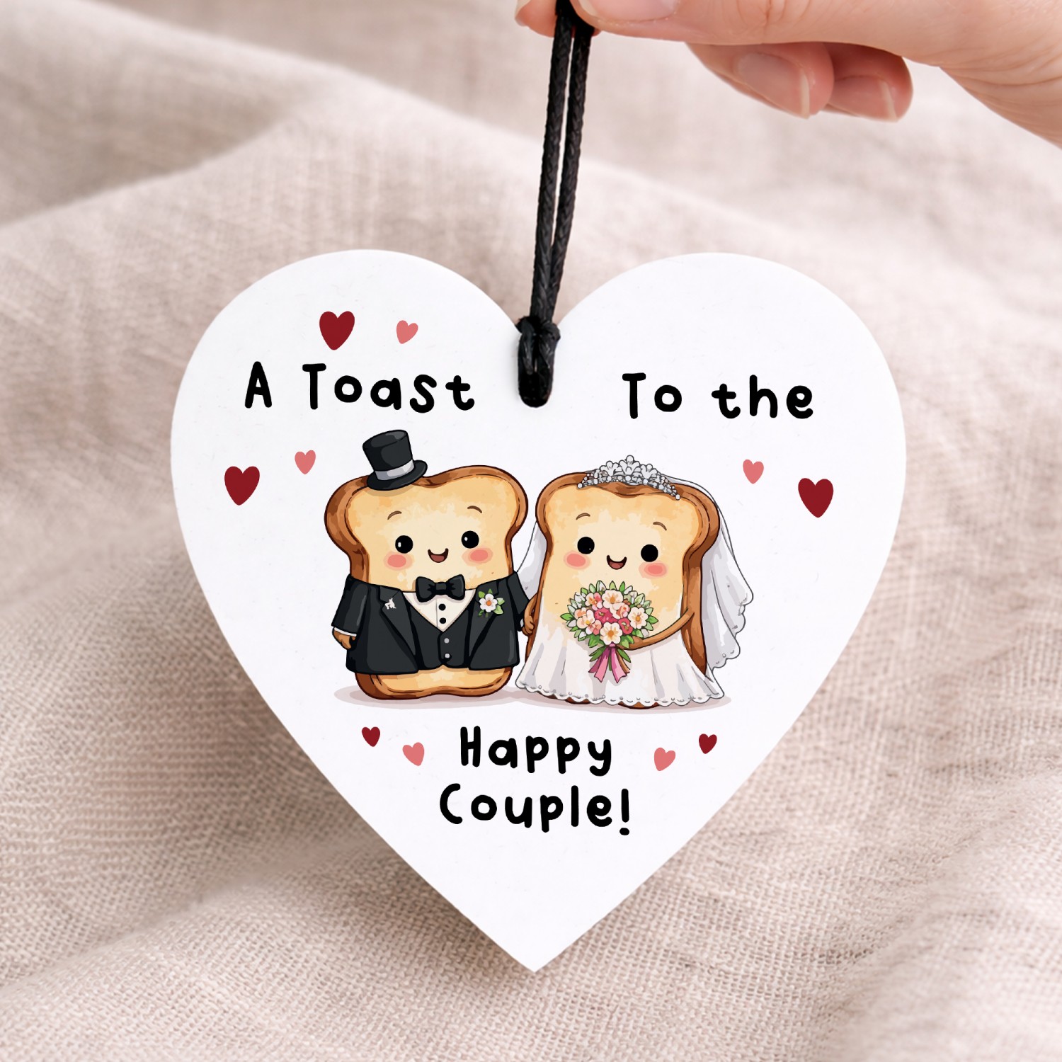 Celebrate love with a smile with this charming white acrylic wedding hanging heart, featuring an adorable toast bride and groom illustration and the playful message "A Toast to the Happy Couple!". This fun and light-hearted design makes a unique wedding keepsake and a modern alternative to traditional wedding cards.