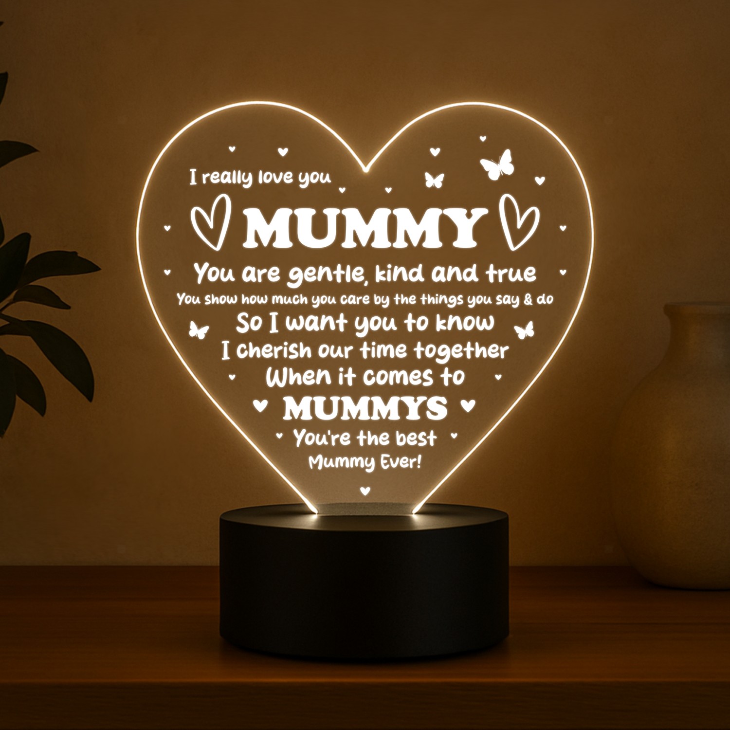 An Awesome LED sign! The light is made from Acrylic and is attached to the LED base. The acrylic creates an Amazing GLOW which illuminates the design, making it a perfect feature in their home as a decorative light. Give this as a gift to your Mummy and put a smile their face when they receive this and can put it up in their room! This Novelty Gift makes an amazing Birthday Gift or Christmas gift. Supplied with a LED base, a beautiful keepsake that will be treasured for years to come.