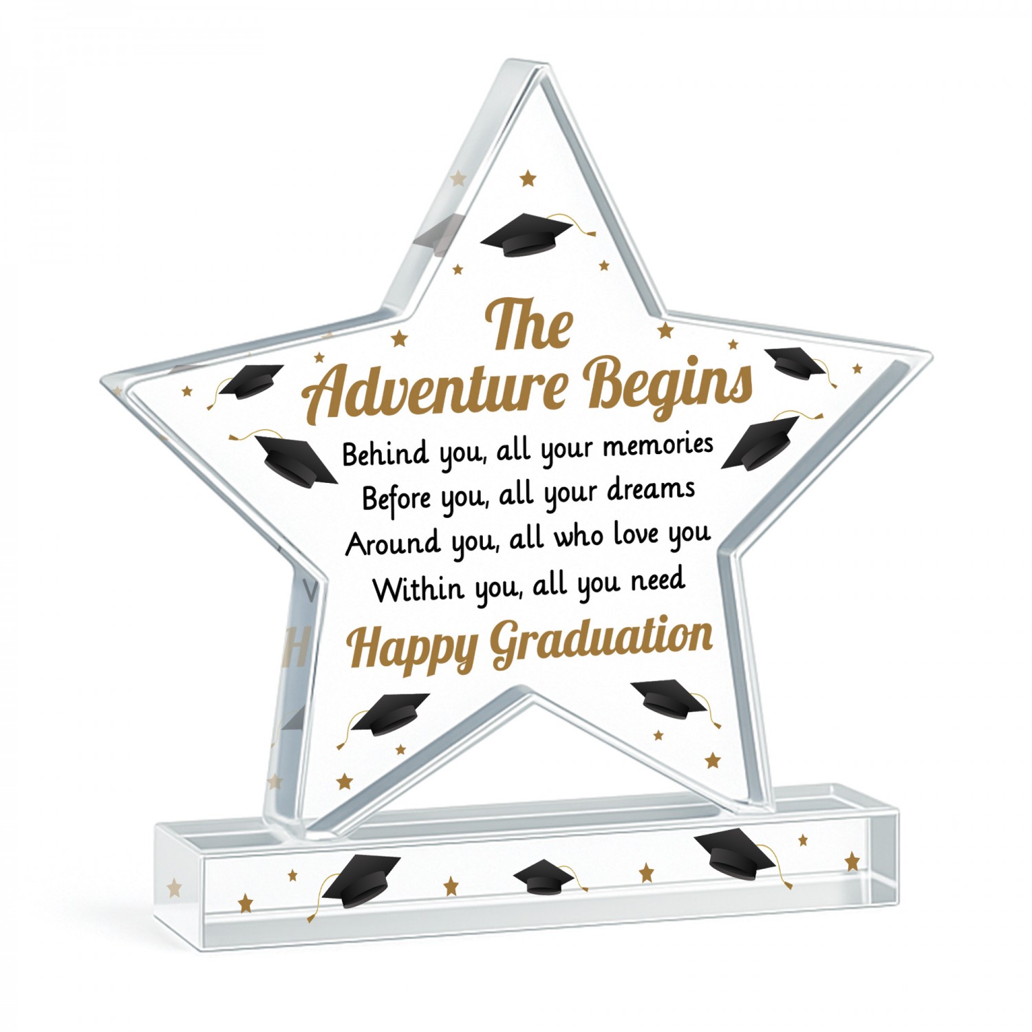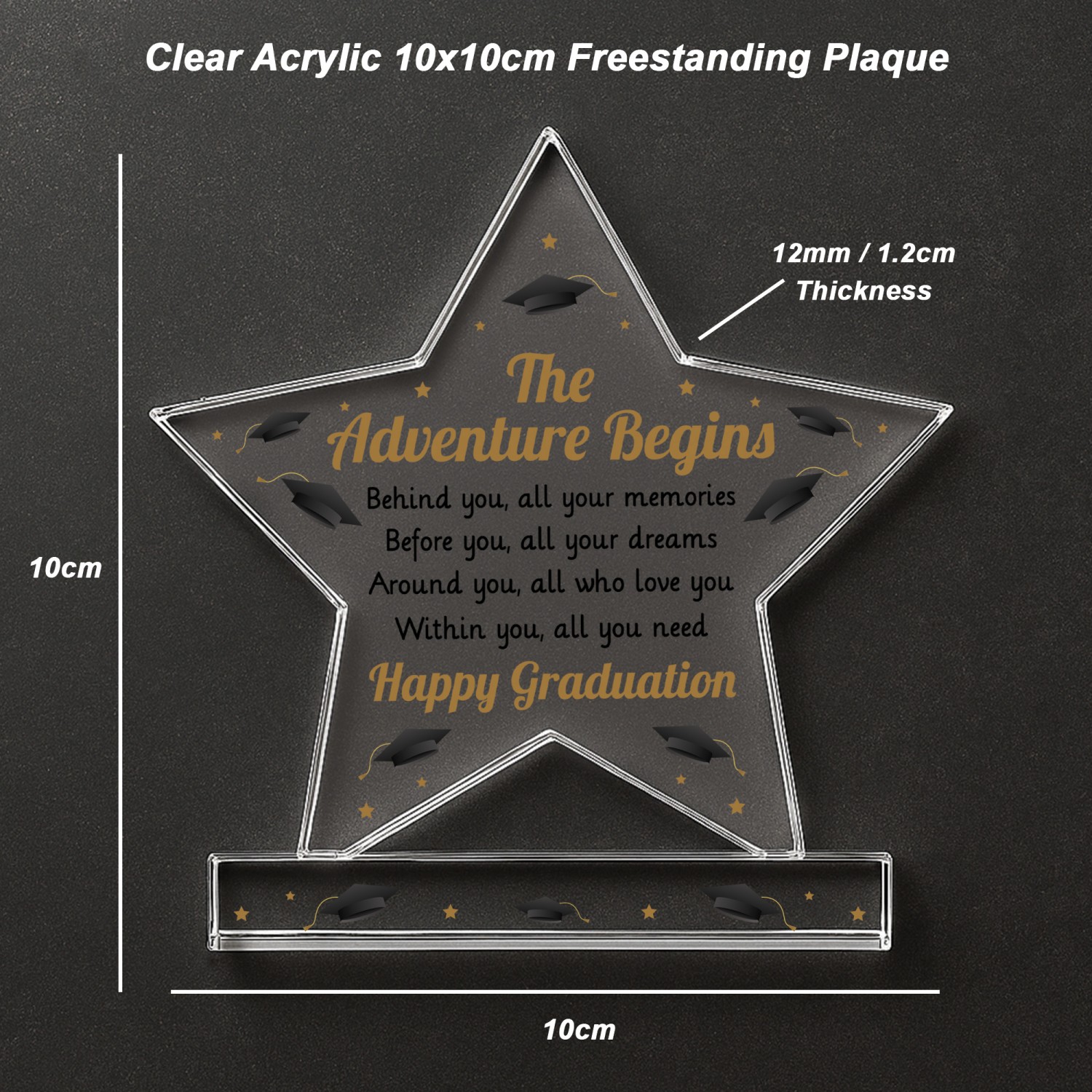 Celebrate a proud milestone with this elegant freestanding acrylic star plaque, designed to capture the spirit of graduation in a stylish and meaningful way. Crafted from high quality acrylic, this piece measures 10cm by 10cm and stands confidently on its own thanks to a solid rectangular base. It's compact in size but full of sentiment, making it a perfect keepsake for graduates of all ages.