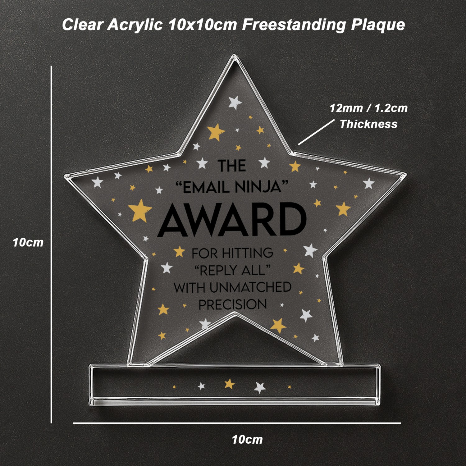 Celebrate a remarkable chapter with this elegant freestanding acrylic star plaque, a heartfelt way to honour the joy, memories and accomplishments that come with retirement. Expertly crafted from premium, crystal-clear acrylic, this 10cm by 10cm plaque stands proudly on its own thanks to a solid rectangular base, making it a charming addition to any home or office space.