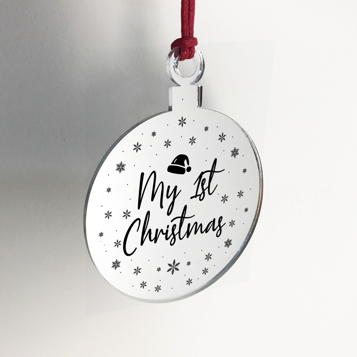 The sign is made from mirrored acrylic, and the design is permanently printed into the bauble. The mirror bauble is supplied with waxed cotton rope in both black and red colours to allow easy hanging and looks great in any room of the house.