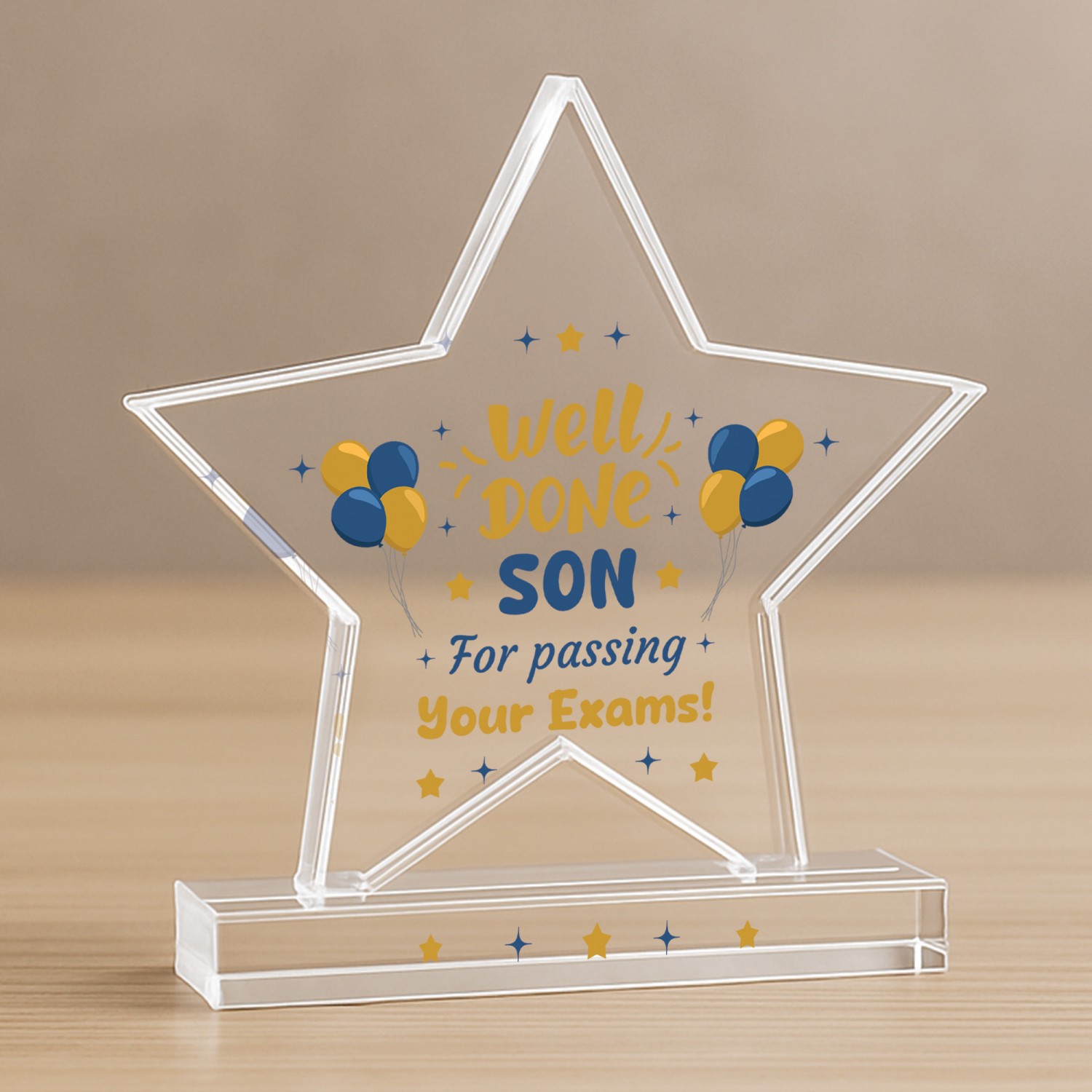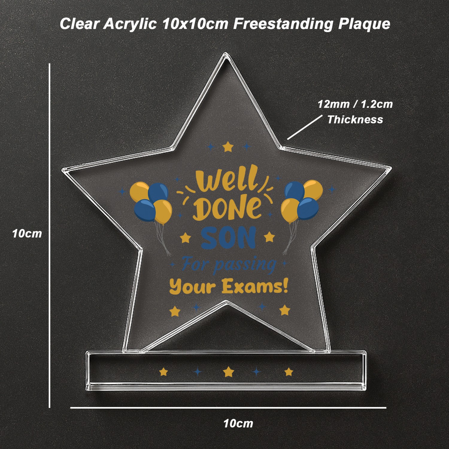 Celebrate a proud milestone with this elegant freestanding acrylic star plaque, congratulate a friend / family member on passing their GCSEs. Crafted from high quality acrylic, this piece measures 10cm by 10cm and stands confidently on its own thanks to a solid rectangular base. It's compact in size but full of sentiment, making it a perfect keepsake for graduates of all ages.