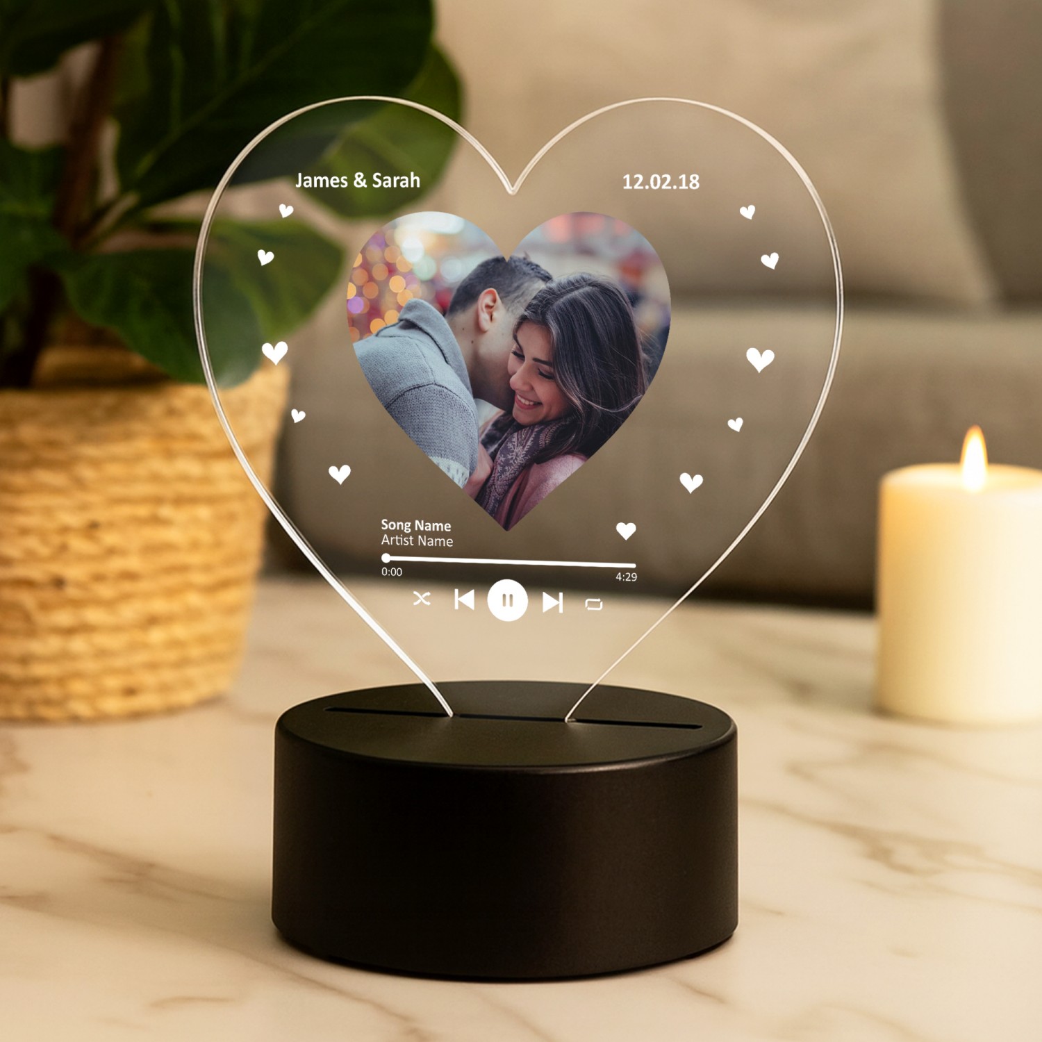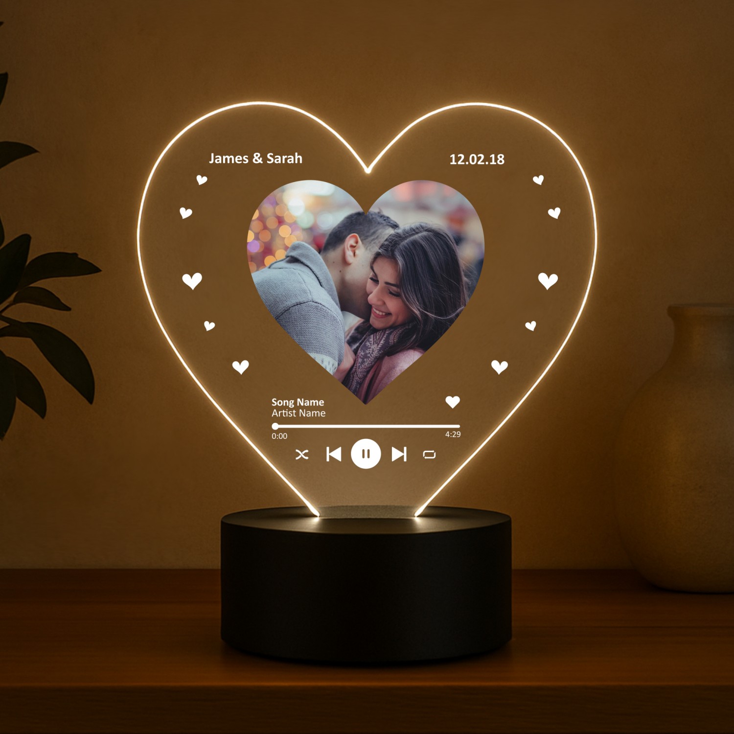 Create a gift they'll treasure forever with this Personalised LED Song Plaque, designed especially for couples, newlyweds, and anyone celebrating their anniversary, Valentine's Day, or a special romantic milestone. This stunning heart-shaped acrylic plaque is customised with your names, your chosen date, your favourite photo, song name, artist, and even the song duration - the perfect way to capture your story in a beautifully illuminated keepsake.