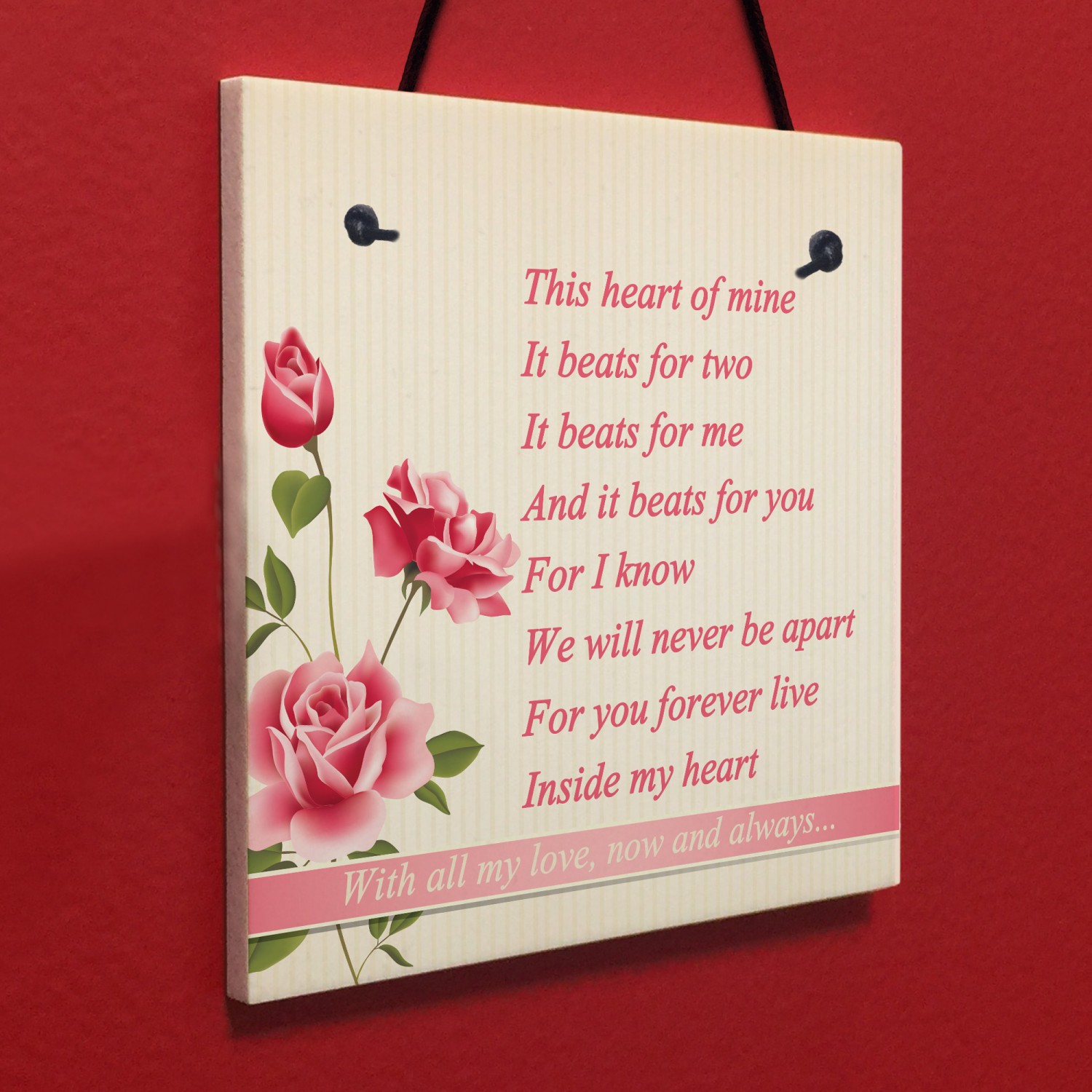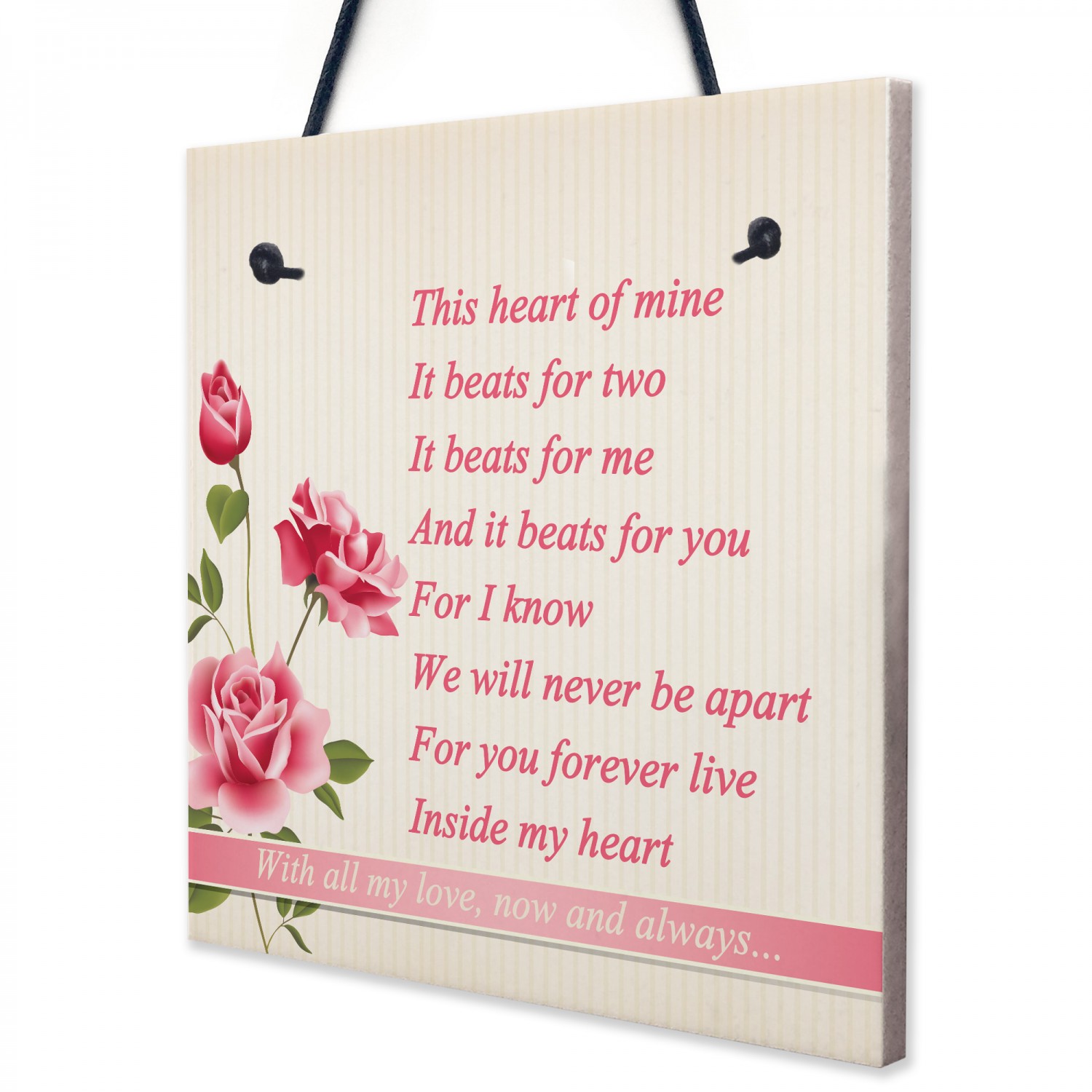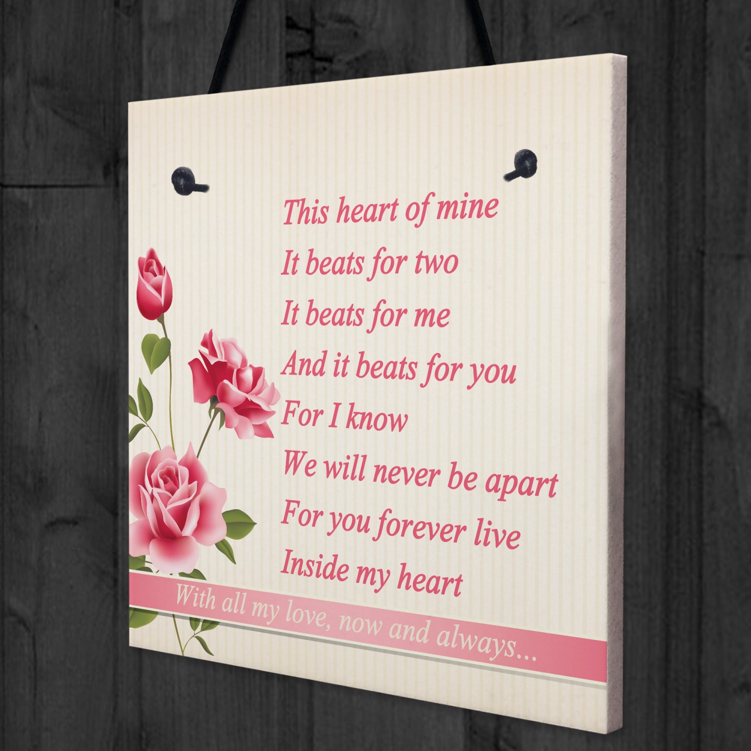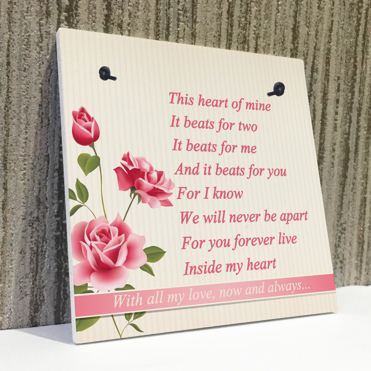 A beautiful gift, for the one you love. A wonderful poem that says things that are often hard to say. This plaque will look great hung in any part of the house. Give this gift with love to your loved one and put a smile on their face letting them know of your love every time they read it. This gorgeous plaque makes an amazing Valentines Day, Wedding, Birthday or Christmas gift but is also a great gift anytime of the year. Supplied ready to hang, a beautiful keepsake that will be treasured for years to come.