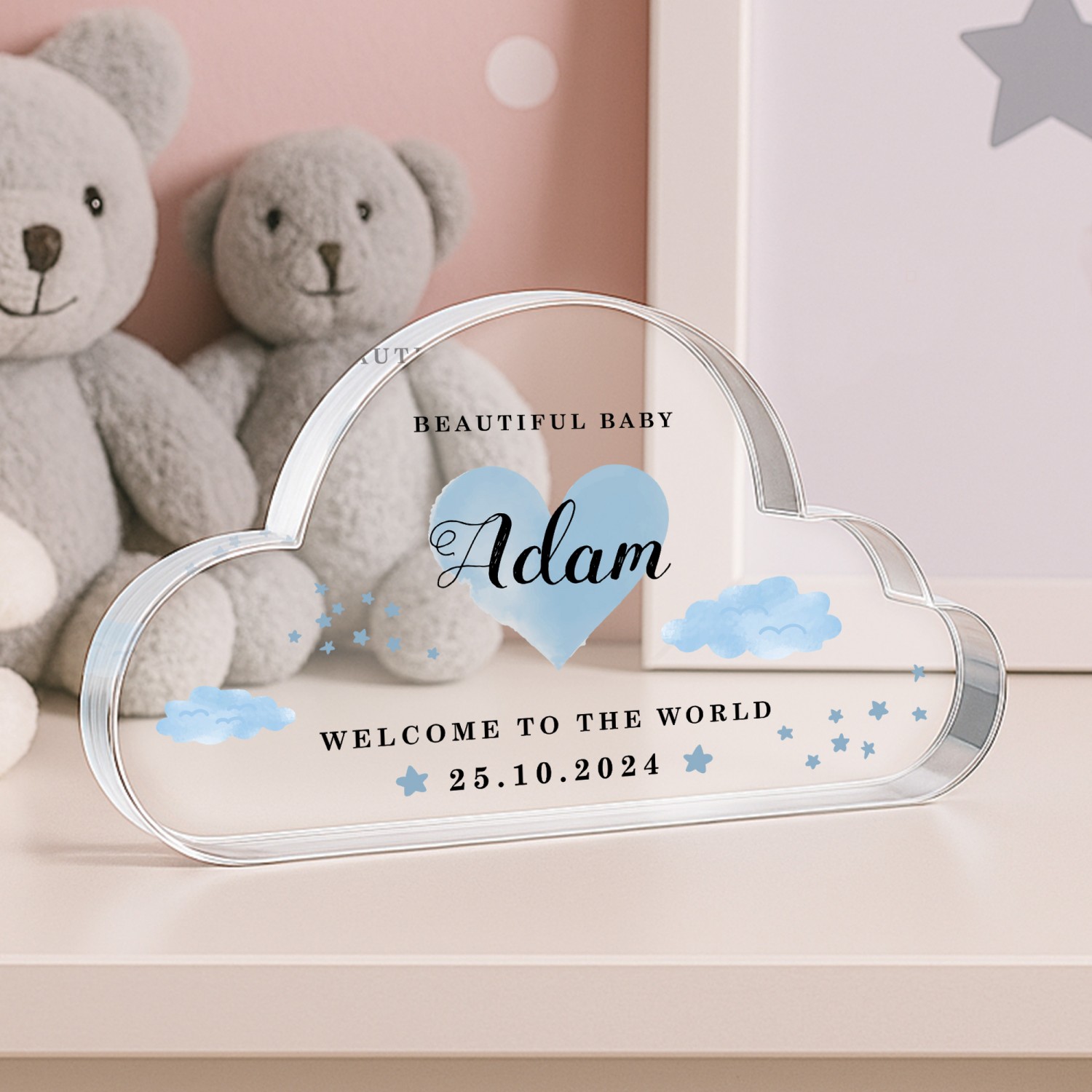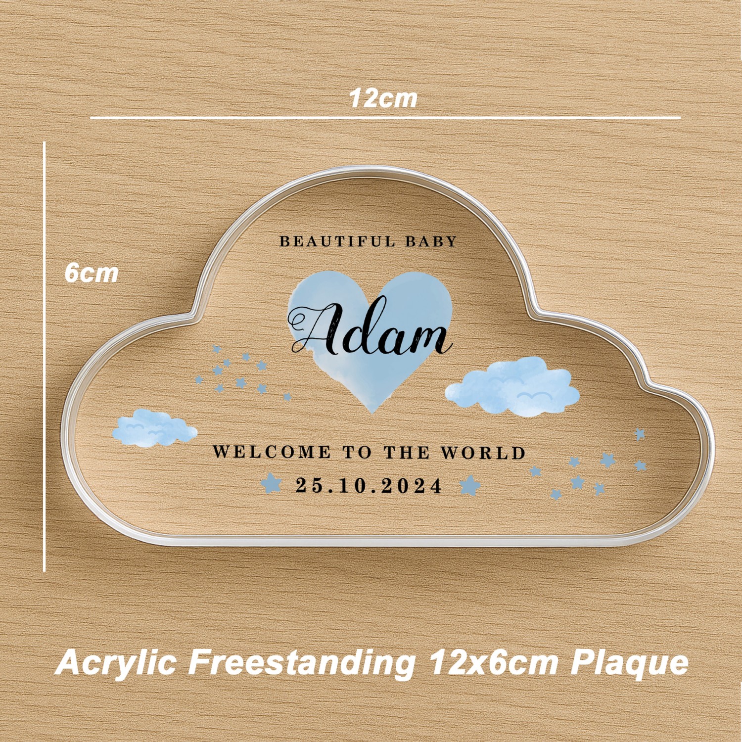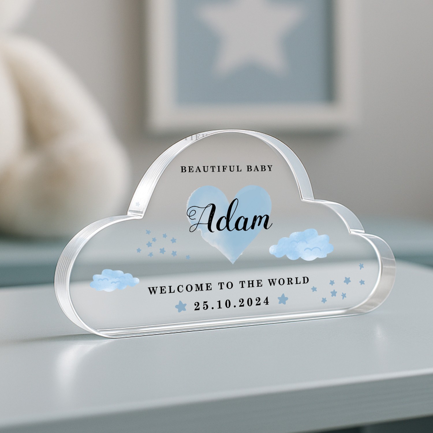 Introducing our beautifully crafted Acrylic Cloud Keepsake, a unique piece designed to bring comfort and joy to any space. Shaped in a gentle cloud, this plaque measures 10 x 7 cm with a solid 1.2 cm thickness, giving it a substantial feel and a graceful presence, ideal for display on shelves, nursery dressers, or mantelpieces. Each piece is printed in vivid, long lasting colours, making it a beautiful decorative touch that also serves as a heartfelt reminder of love, faith, and new beginnings.