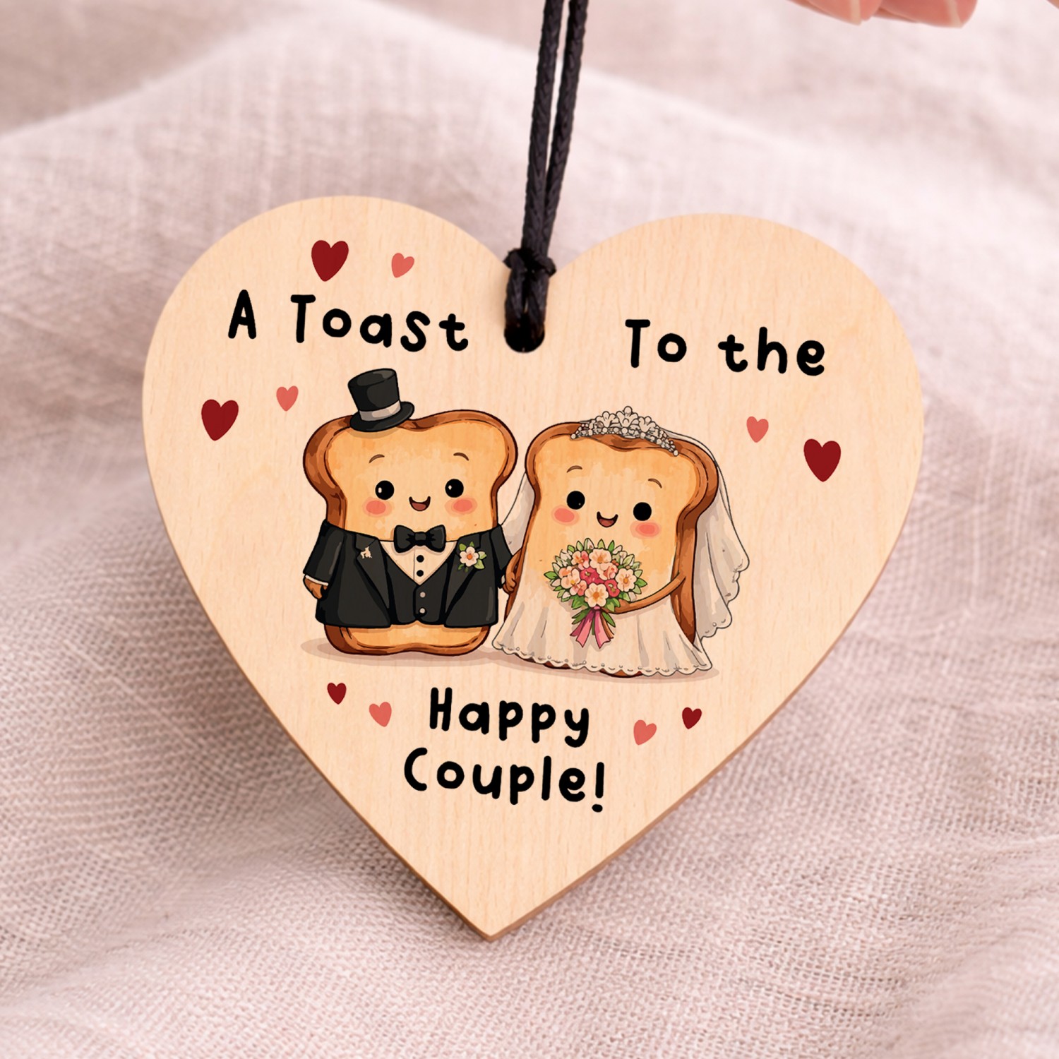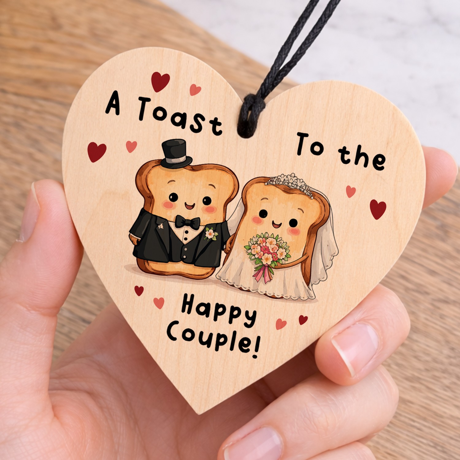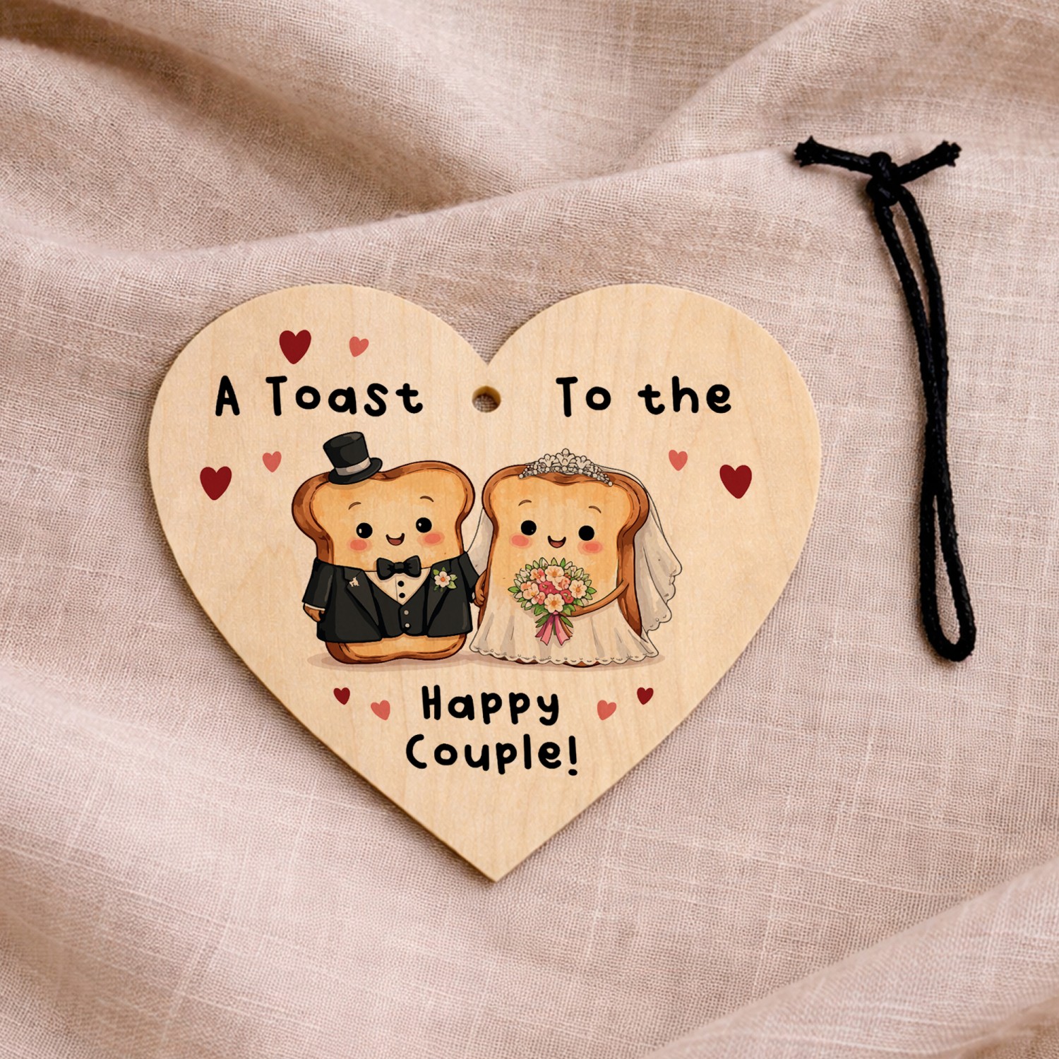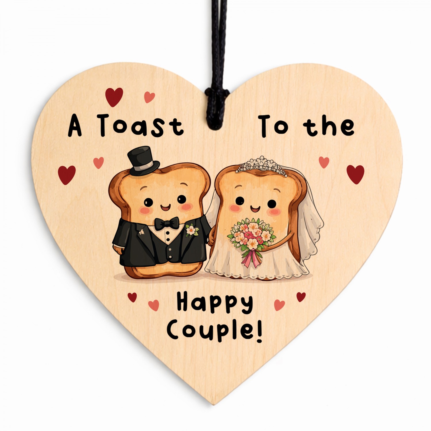 Celebrate love with a smile with this charming wooden wedding hanging heart, featuring an adorable toast bride and groom illustration and the playful message "A Toast to the Happy Couple!". This fun and light-hearted design makes a unique wedding keepsake and a memorable alternative to traditional wedding cards.