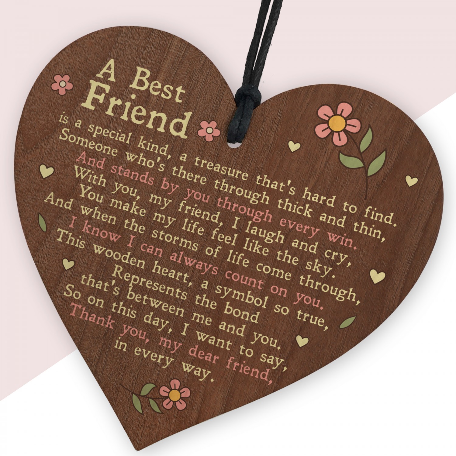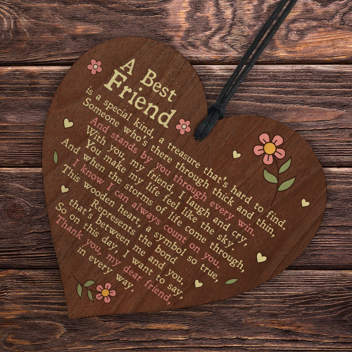 The hand crafted real wood heart measures 10cm, is gift packaged and includes a variety of waxed cotton cord to hang. We've made these for replacing traditional greetings cards, placing in hampers or on the next of a bottle, or to even hang on a Christmas Tree. There are so many uses, you are sure to not be dissapointed. We have thousands of exclusive designs, with original verses, that touch the heart.