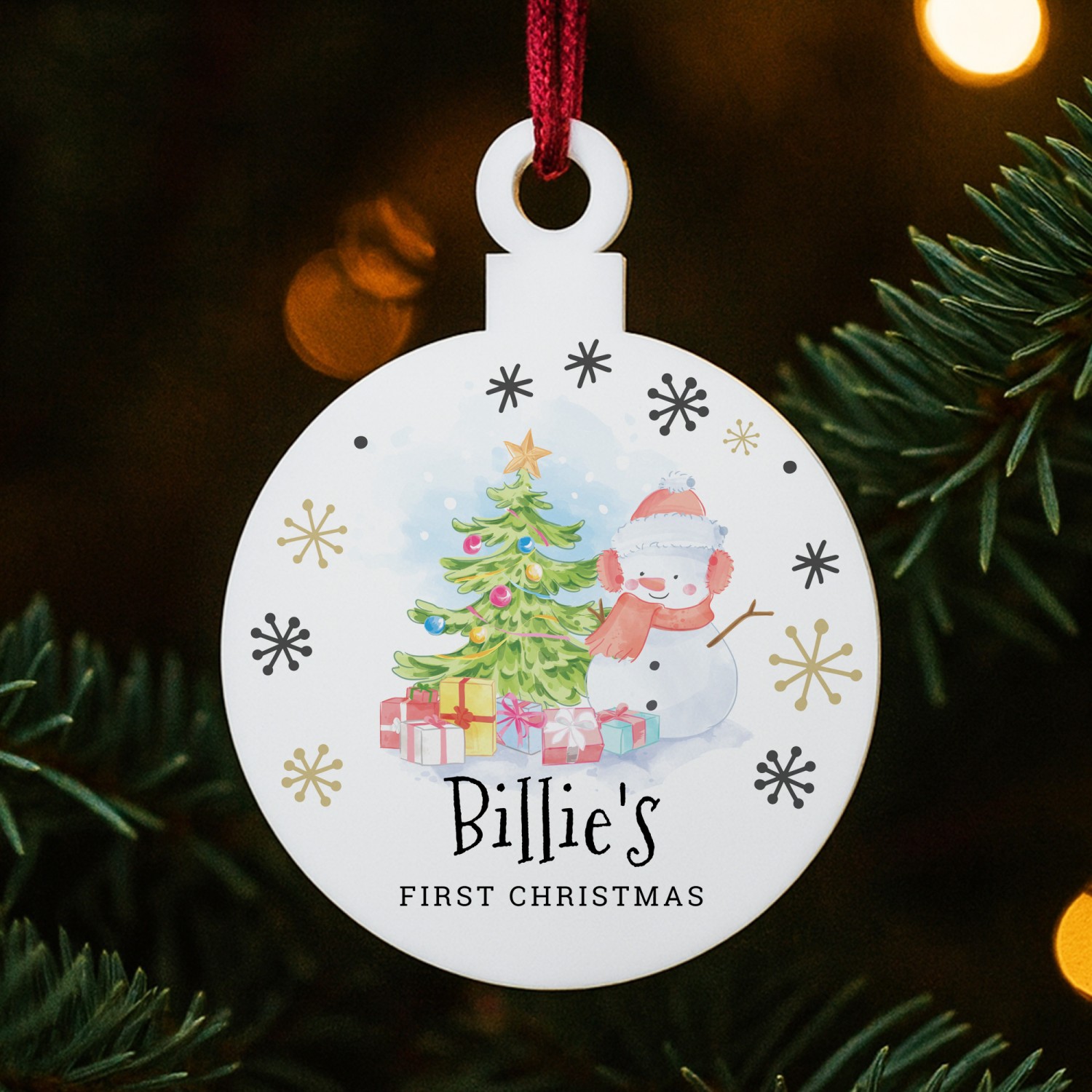 Mark the magic of a baby's very first festive season with this beautifully personalised acrylic Christmas bauble decoration. Measuring 8cm by 10cm, this keepsake ornament is crafted from durable white acrylic with a smooth glossy finish, designed to shine amongst the twinkling fairy lights of your Christmas tree.
