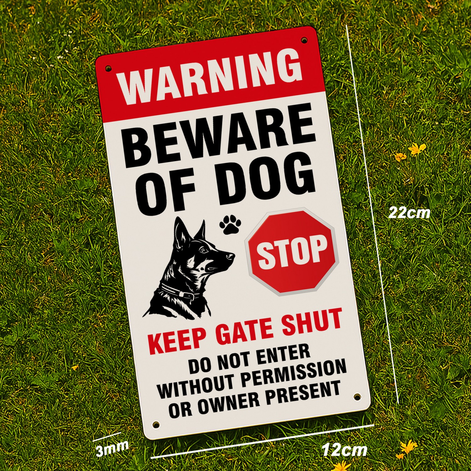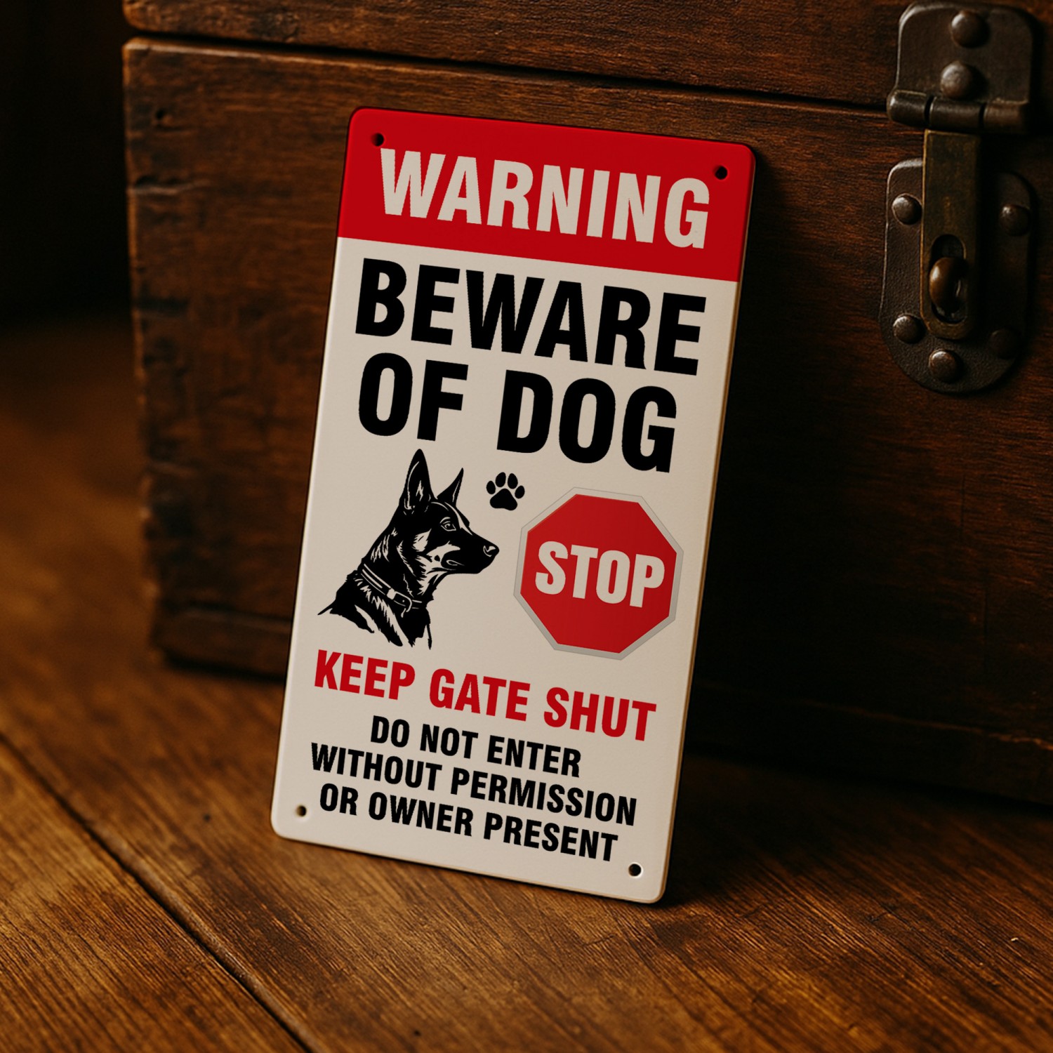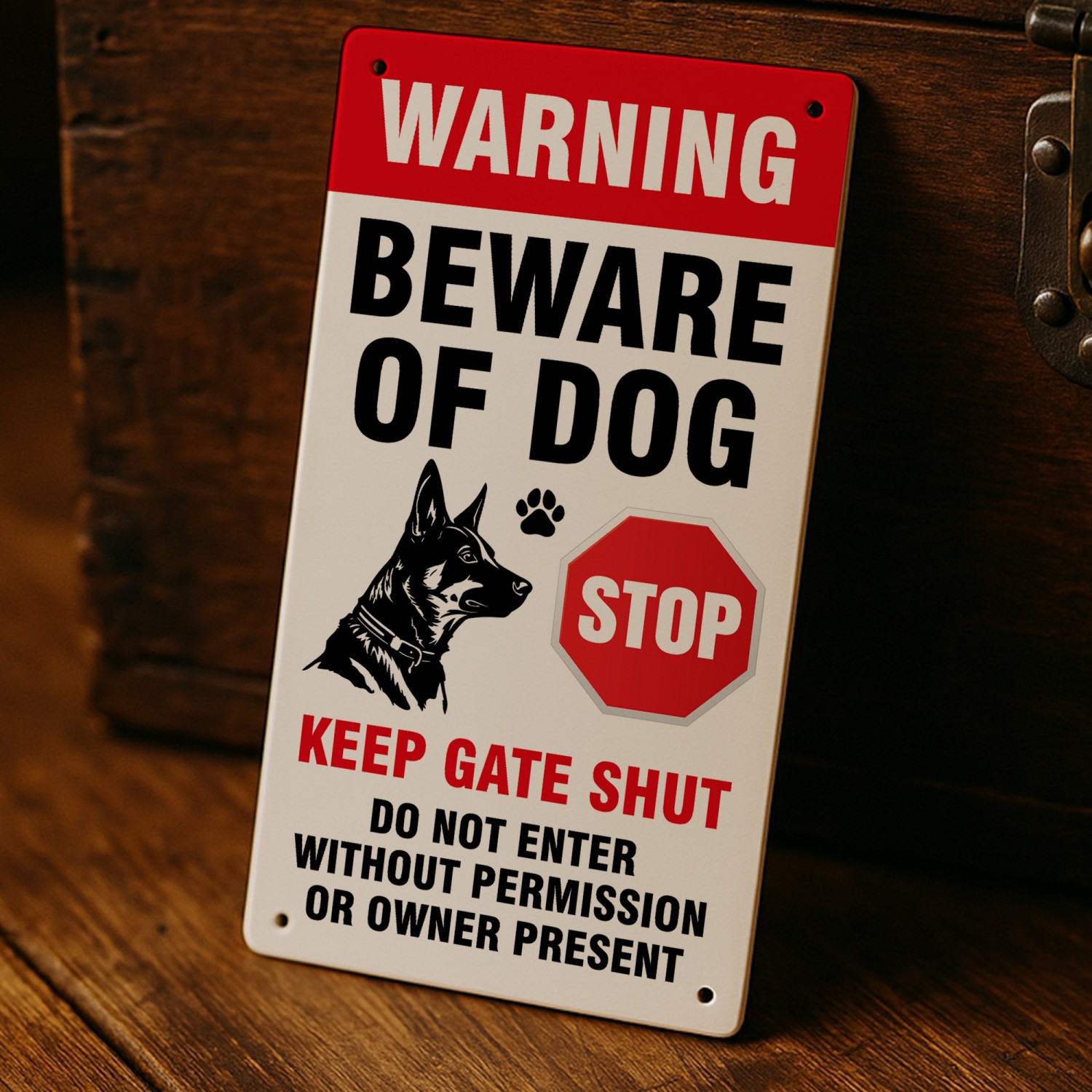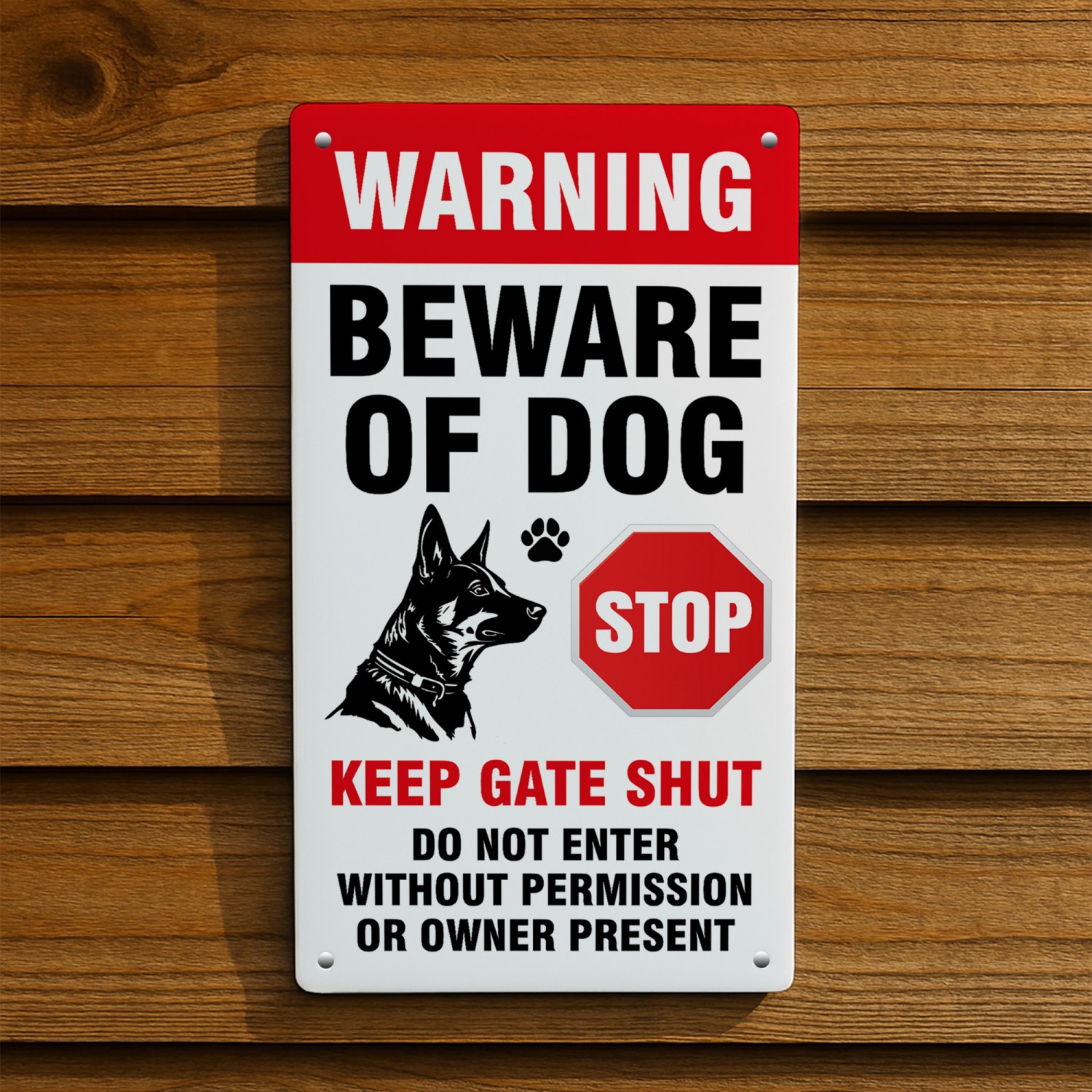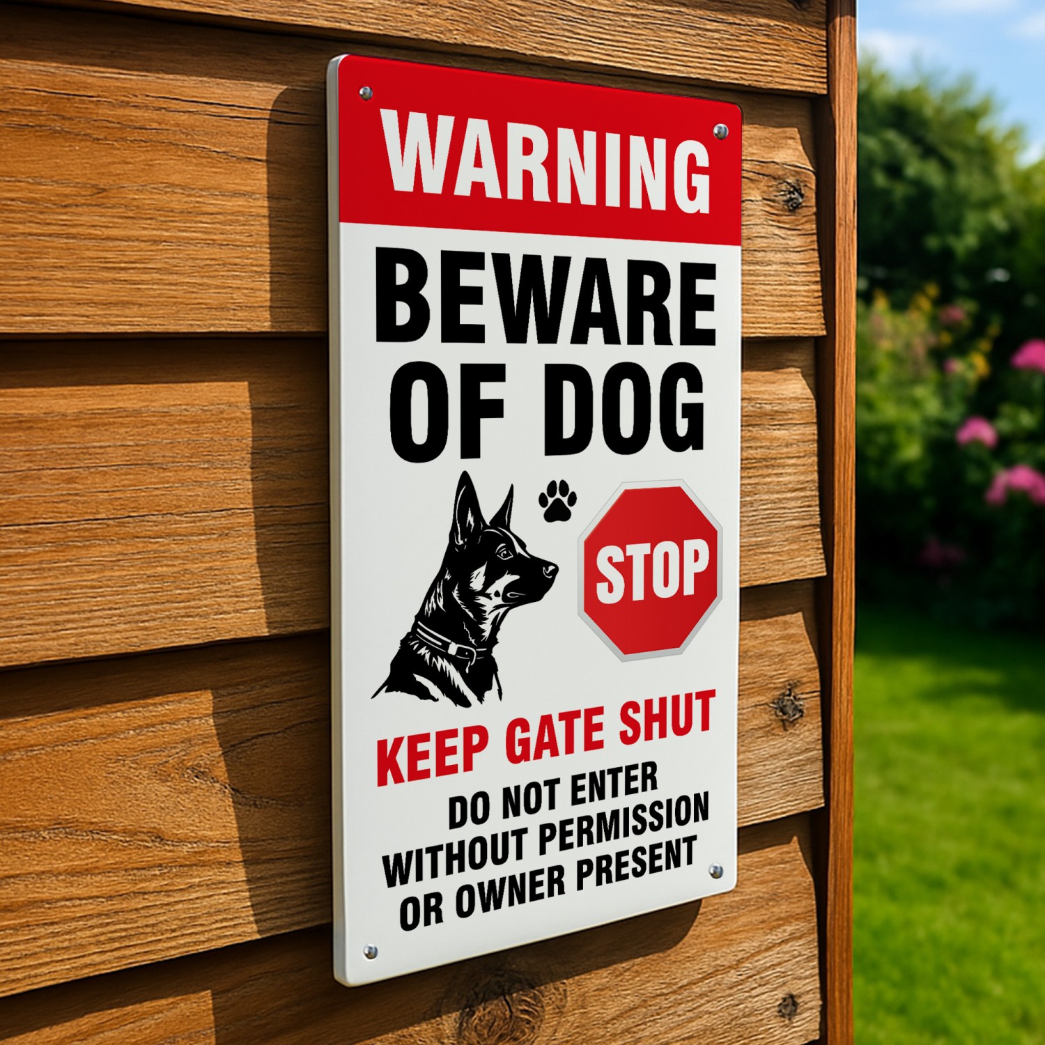 This dog warning sign is ideal for front gates, garden fences, driveways, kennels, and private property entrances, reminding visitors, delivery drivers, and trespassers to stay alert and keep the gate shut.