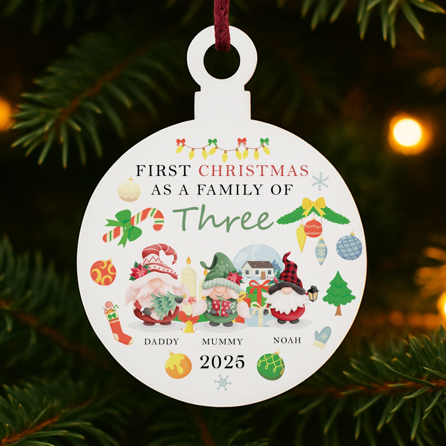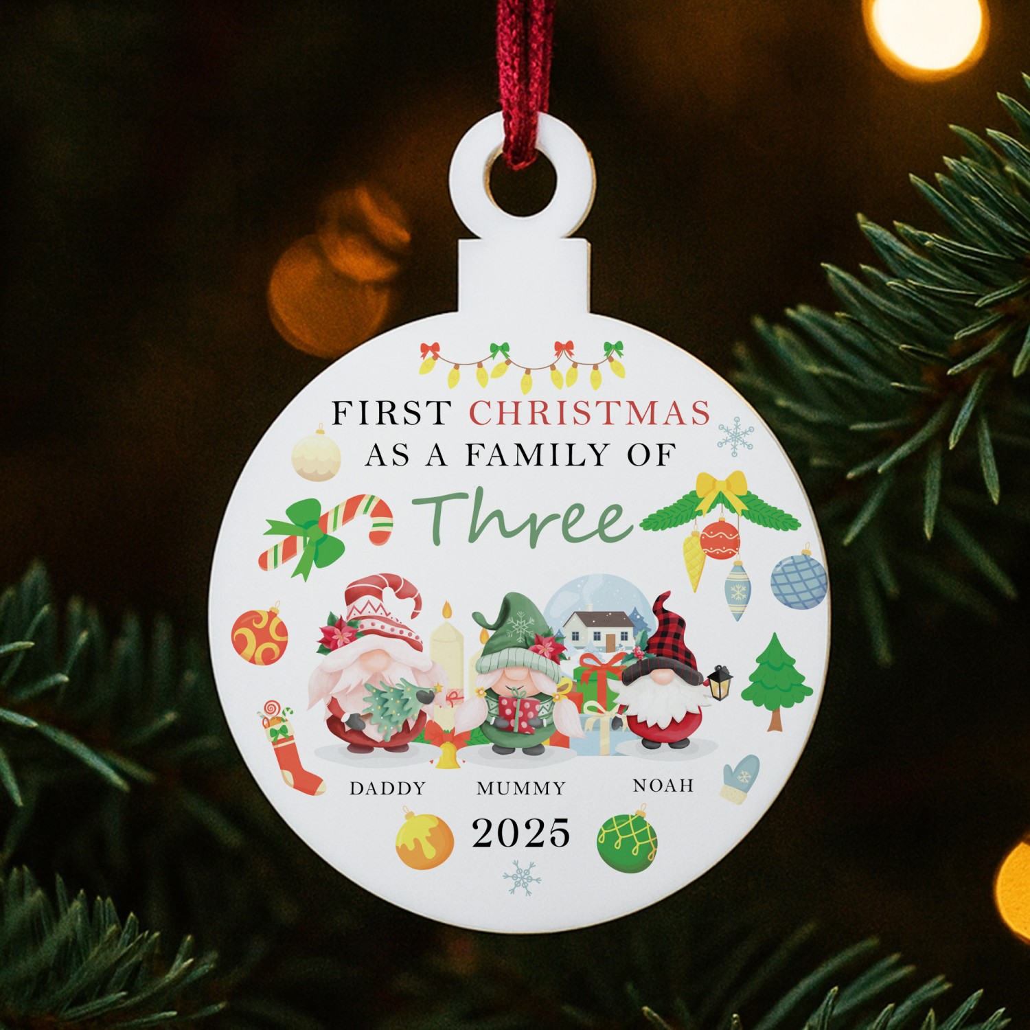 Celebrate the joy of your growing family with this beautifully personalised acrylic bauble, marking your very first Christmas as three. Crafted from high-quality glossy white acrylic and measuring 8cm by 10cm, this charming keepsake is designed to shine amongst the festive lights and capture the love and excitement of this special milestone.