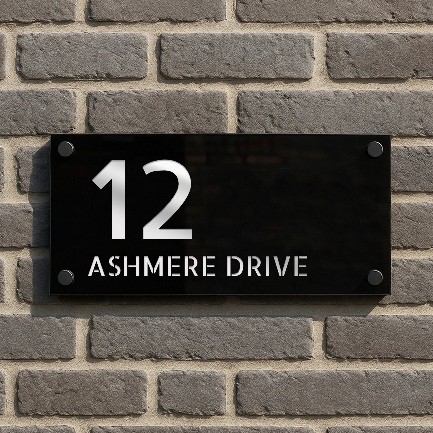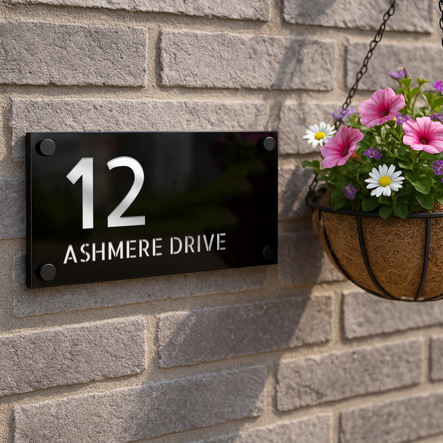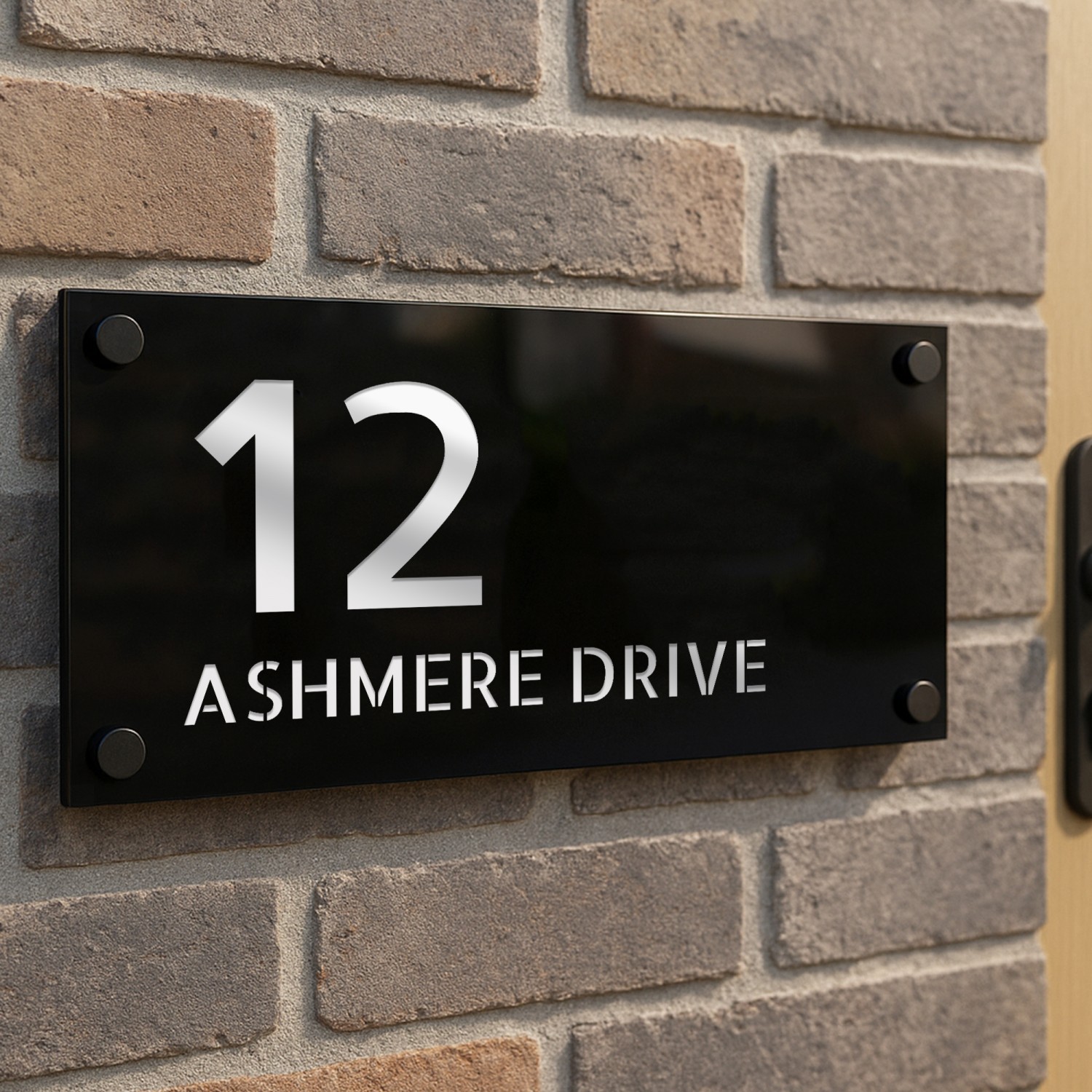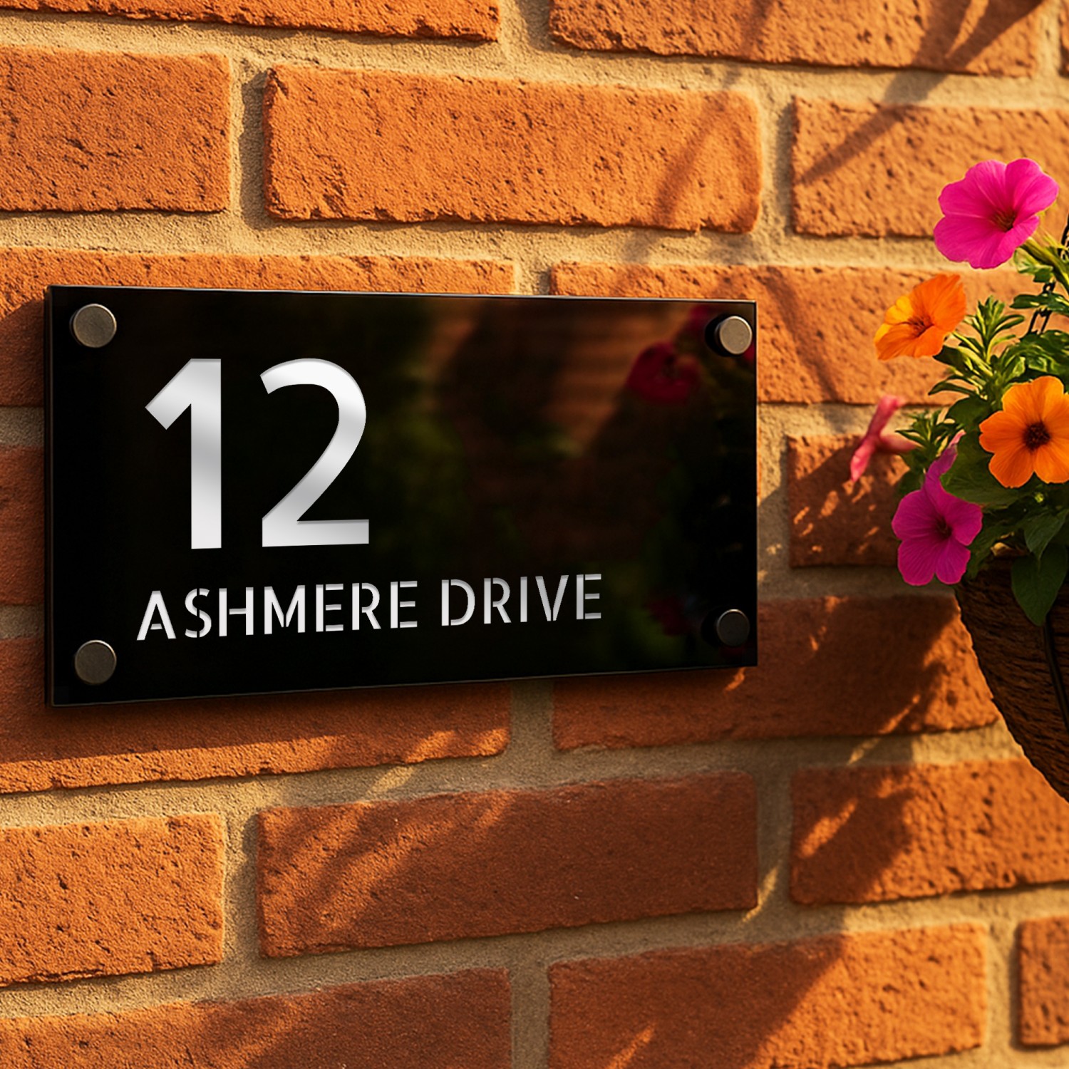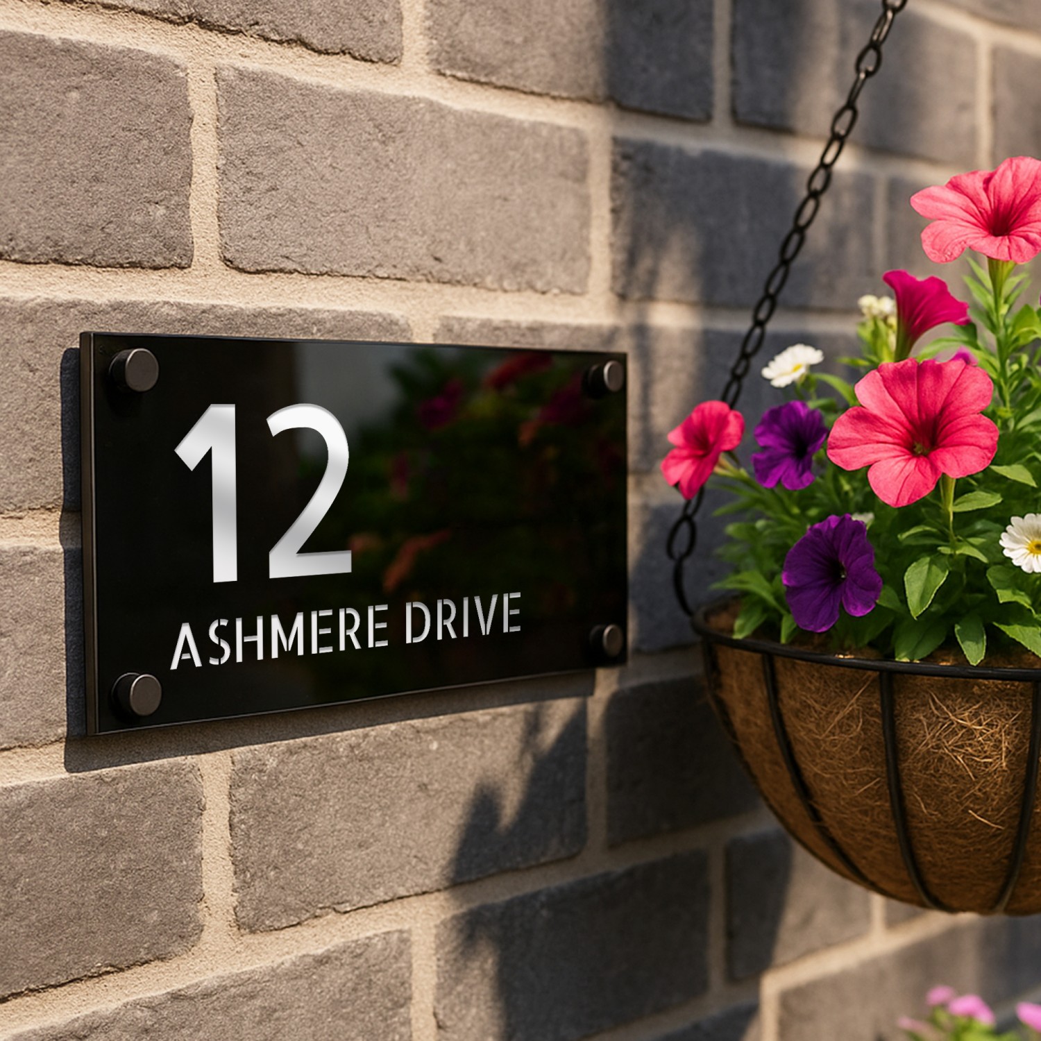 Add a touch of contemporary elegance to your home's exterior with this premium acrylic house sign. Measuring 280 x 140mm, this sleek, modern sign is crafted with a stunning silver mirror back plate and a shiny black front plate, creating a striking contrast that's both stylish and easy to read.