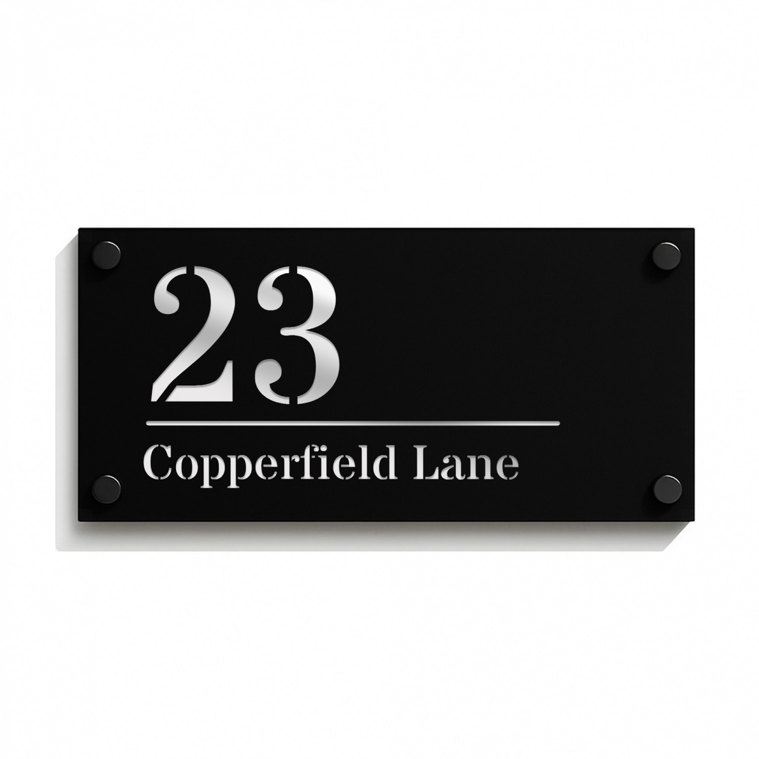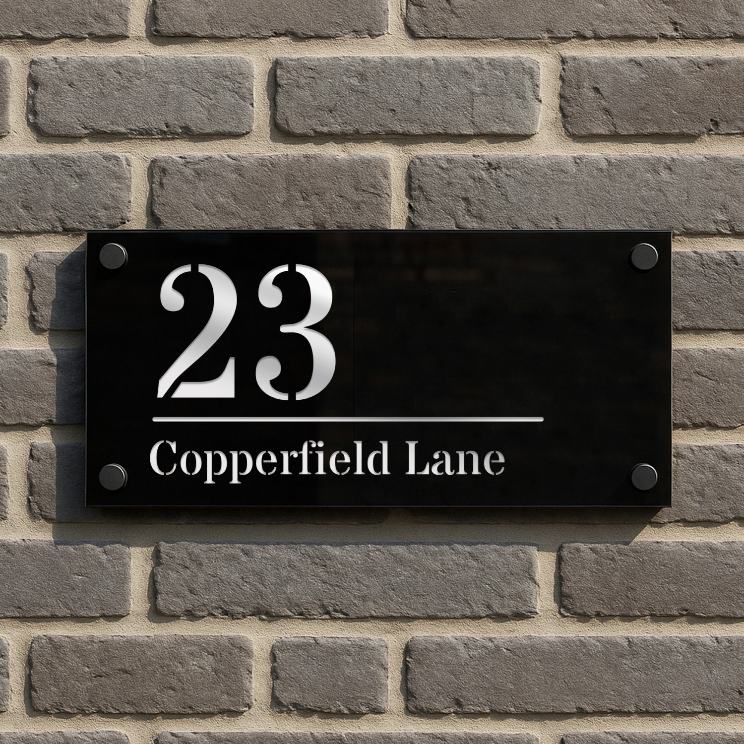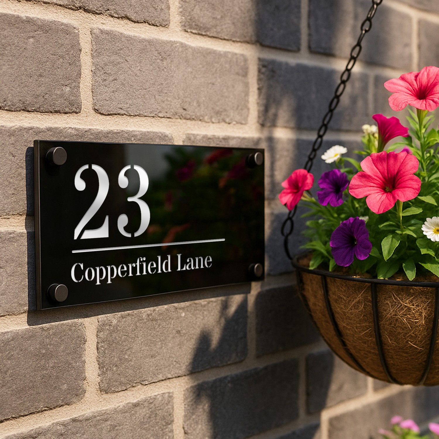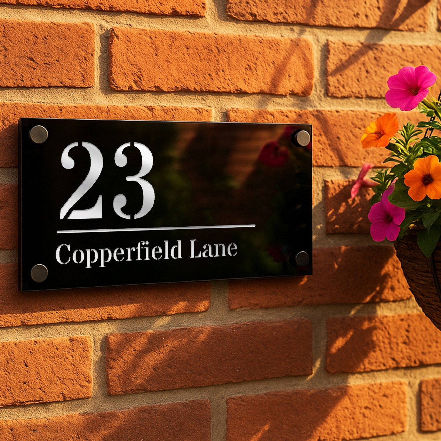 Add a touch of contemporary elegance to your home's exterior with this premium acrylic house sign. Measuring 280 x 140mm, this sleek, modern sign is crafted with a stunning silver mirror back plate and a shiny black front plate, creating a striking contrast that's both stylish and easy to read.