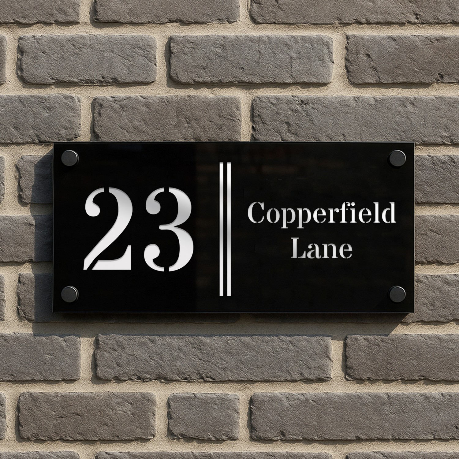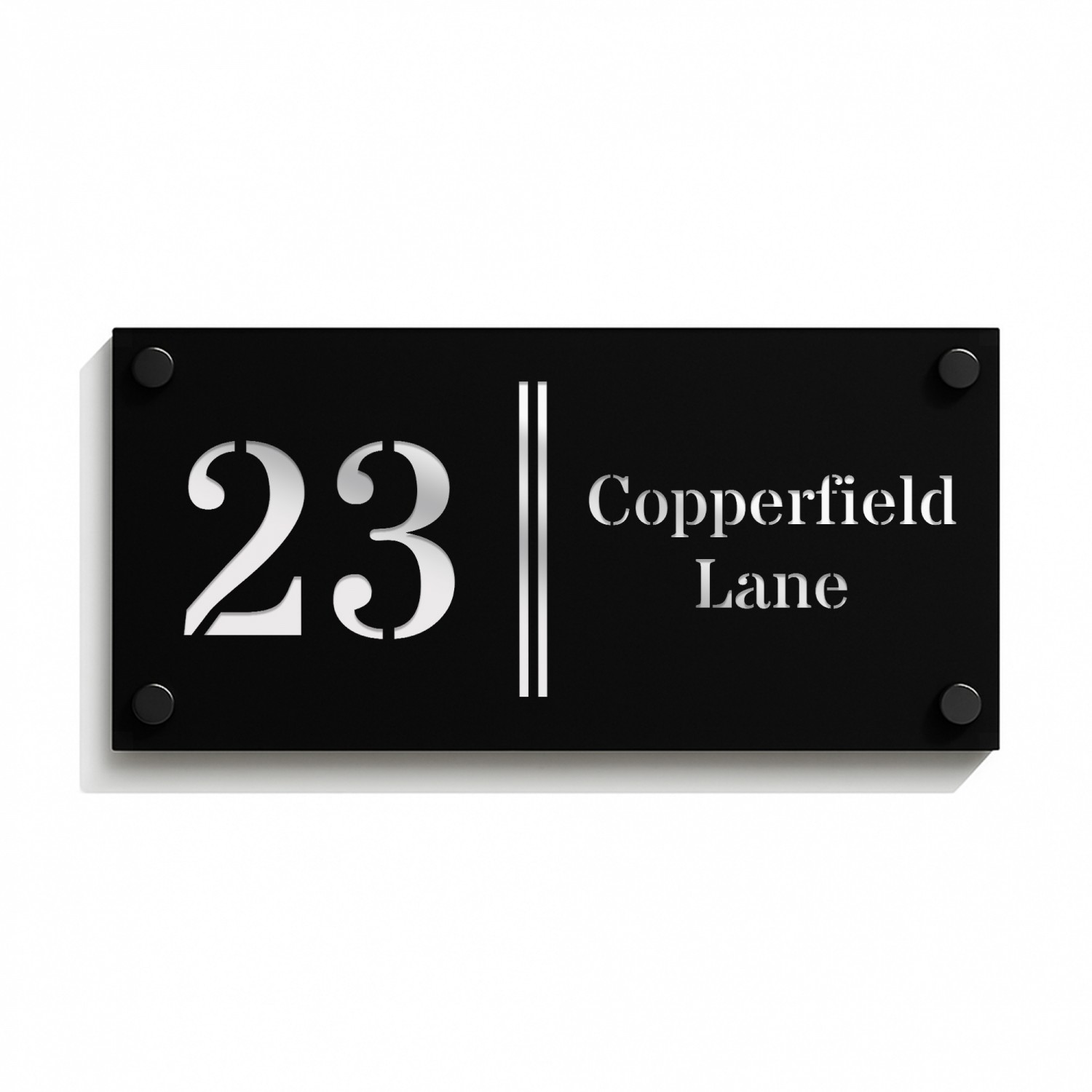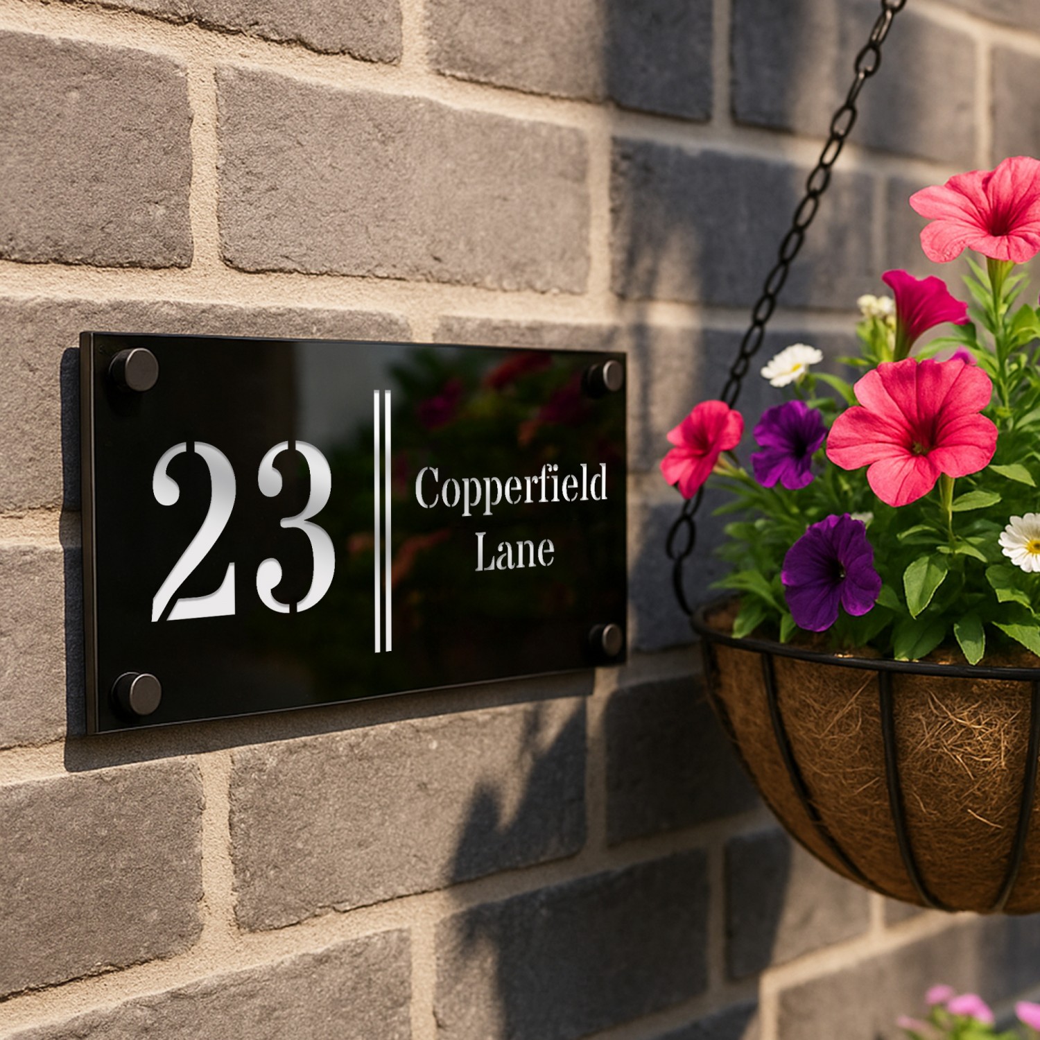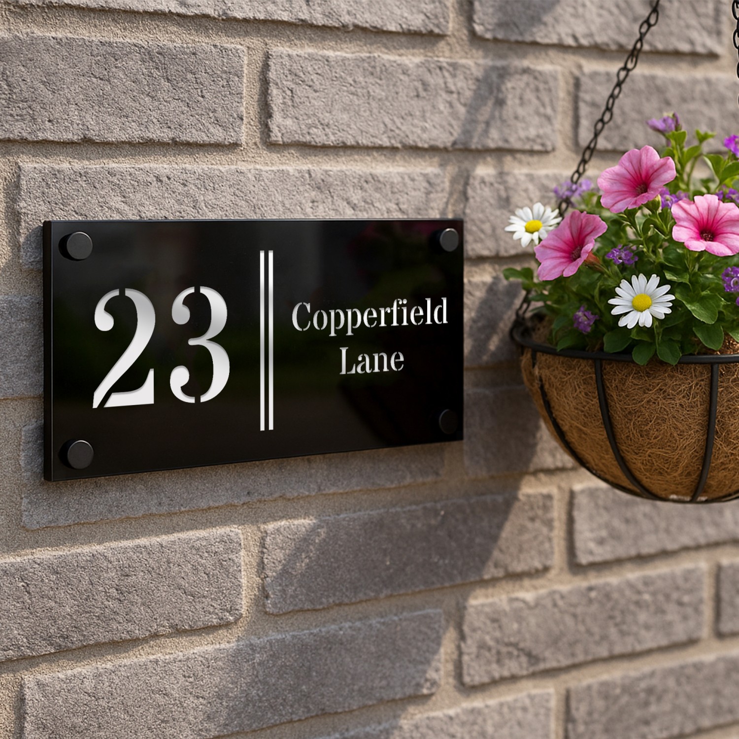 Add a touch of contemporary elegance to your home's exterior with this premium acrylic house sign. Measuring 280 x 140mm, this sleek, modern sign is crafted with a stunning silver mirror back plate and a shiny black front plate, creating a striking contrast that's both stylish and easy to read.